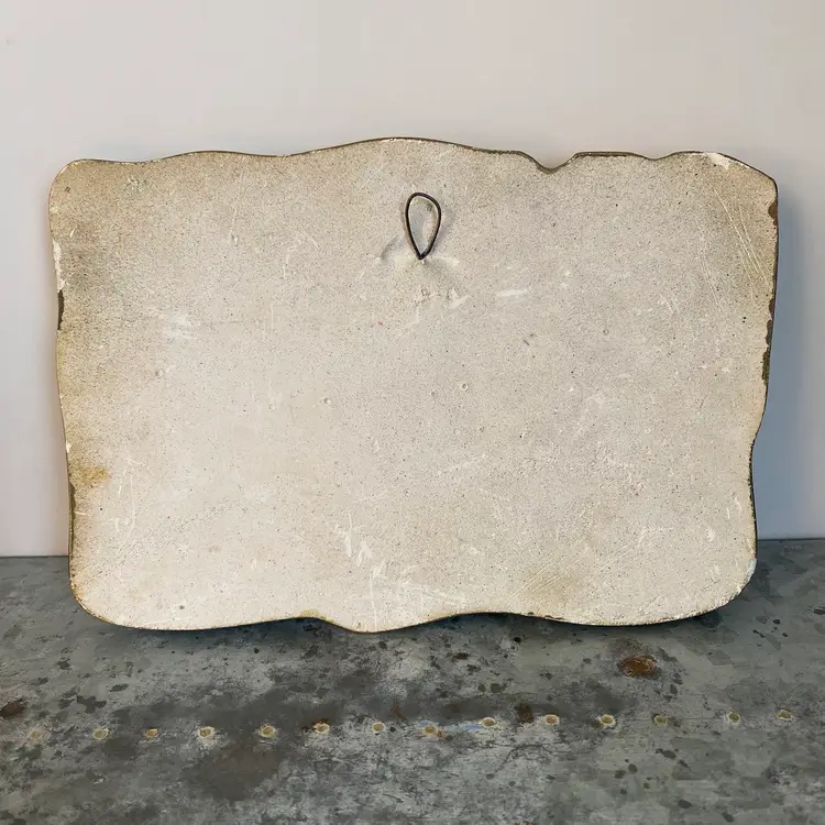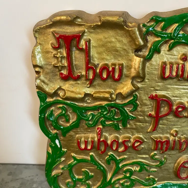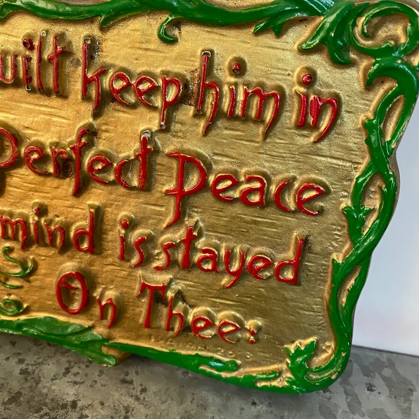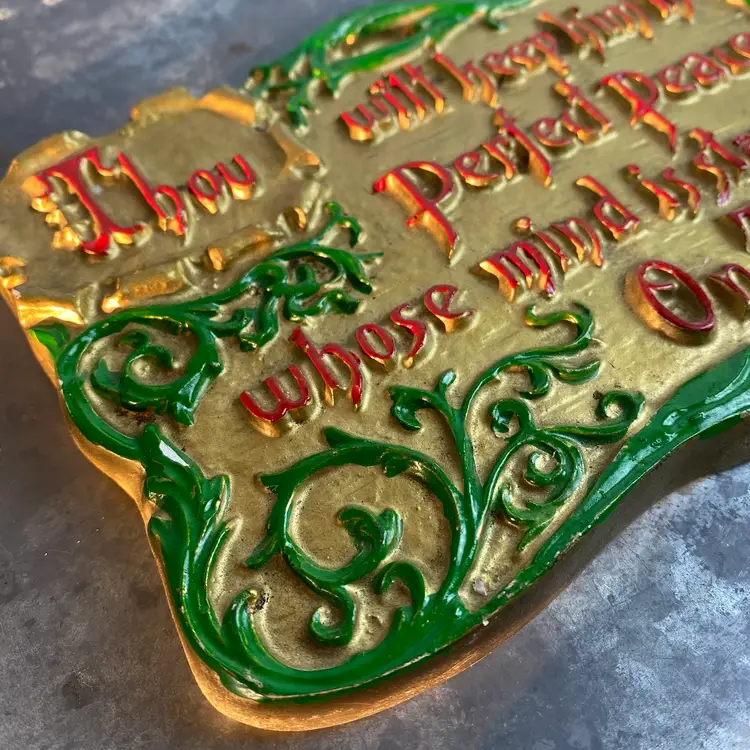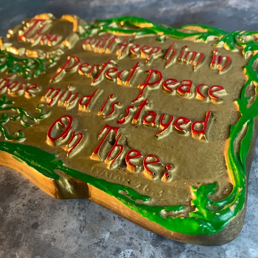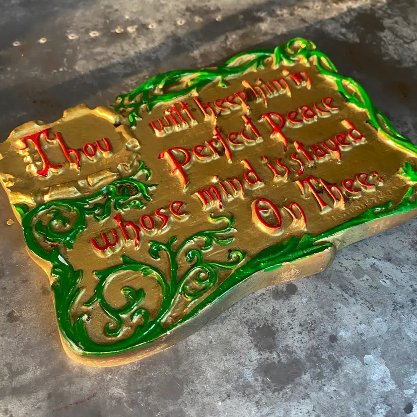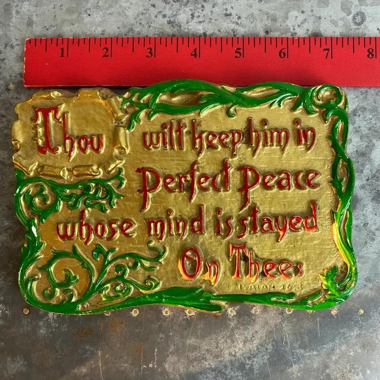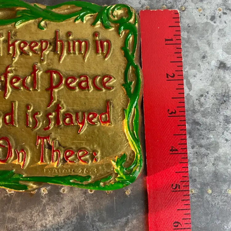 Gold, green, and red colors. Approximately 7.5 inches x 5 inches.