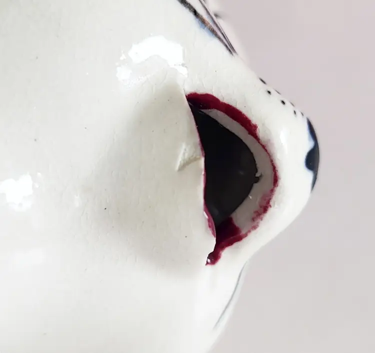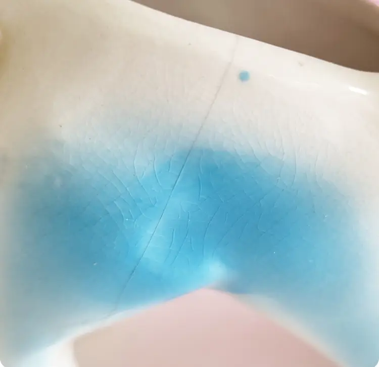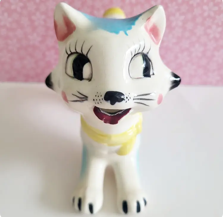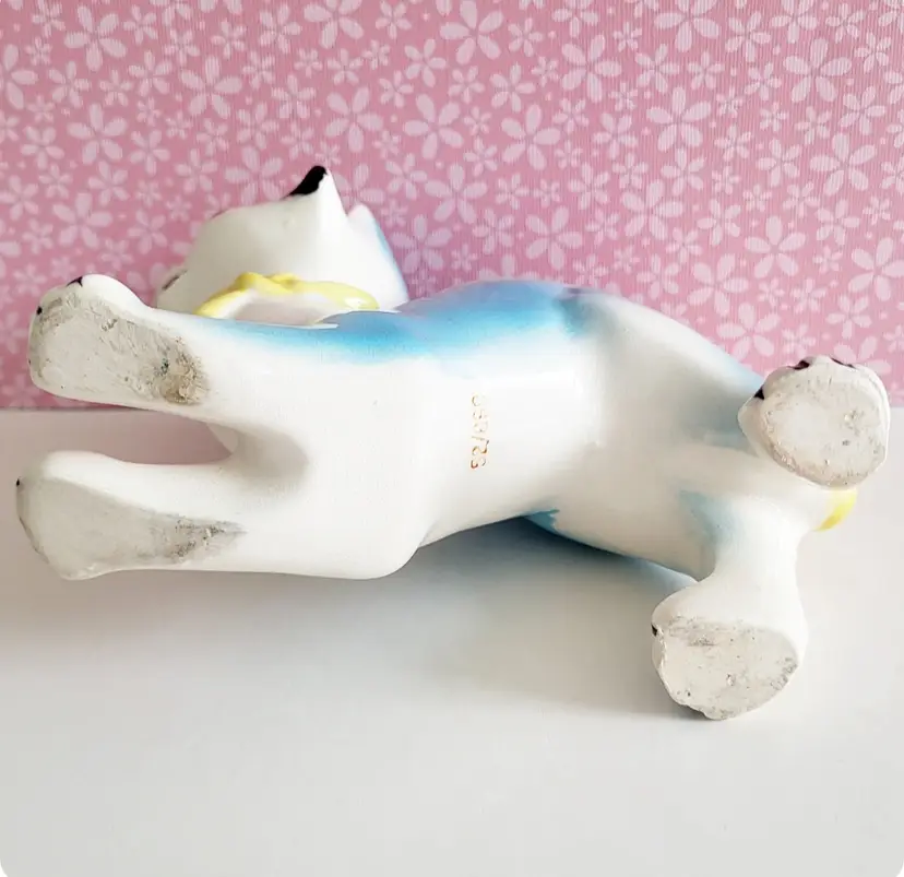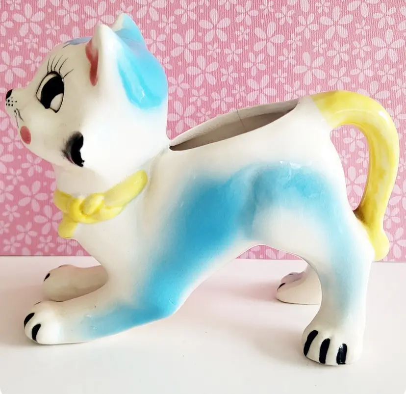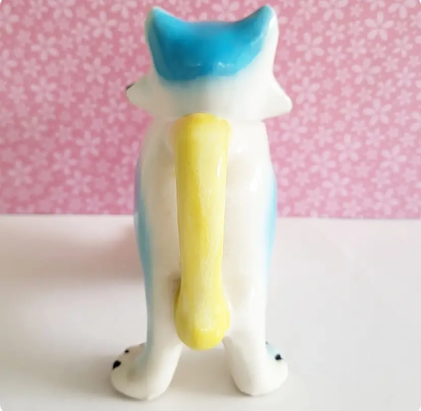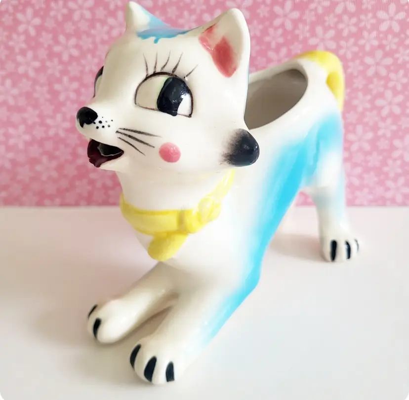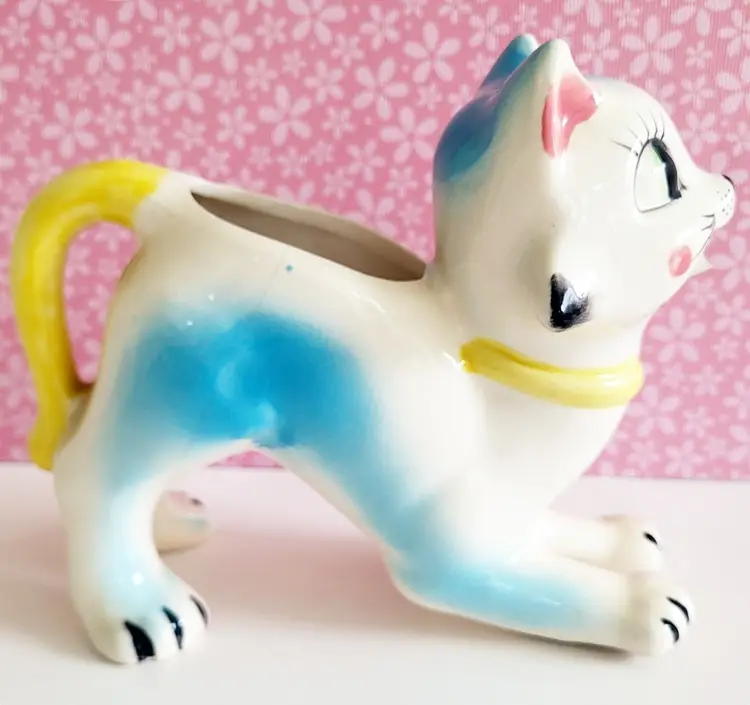 Vintage Tilso Japan blue cat creamer. Harder to find piece! SEE ALL DETAIL PHOTOS Overall crazing in the glaze, deer craze line on left side, there is a factory flaw on the lip (SEE DETAIL PHOTOS). Measures 6 in x 5 in x 3 in.