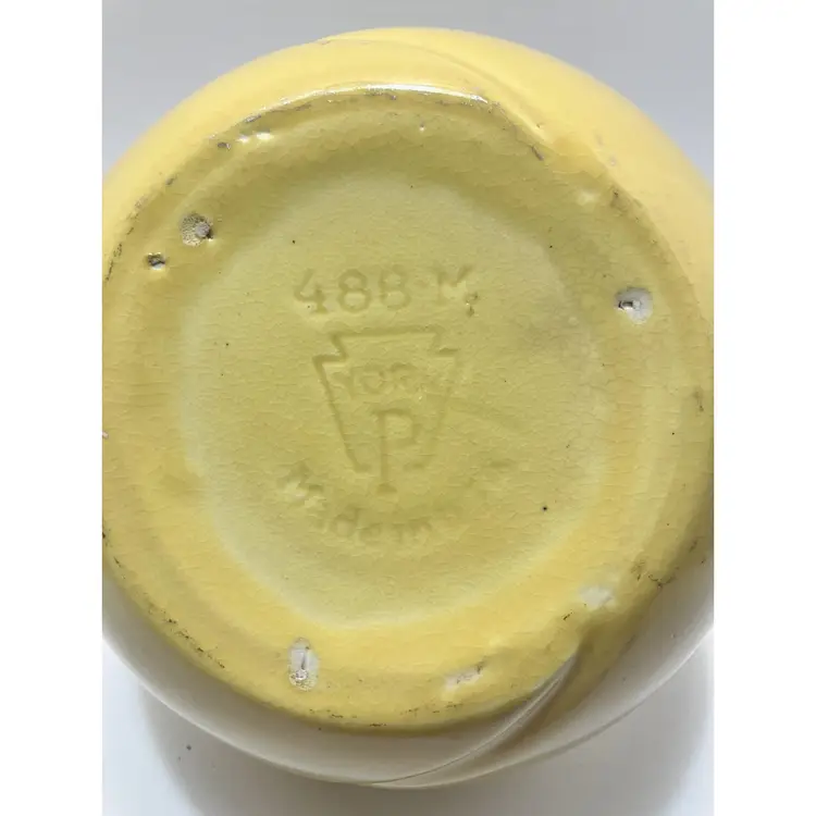 This vintage yellow ceramic tilt ball pitcher is made in the USA. Weighs 2.4 lbs. Used condition with no chips or cracks.