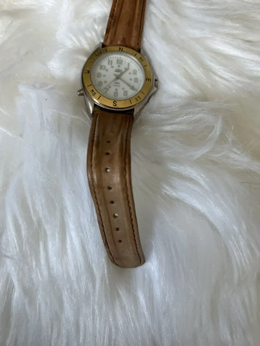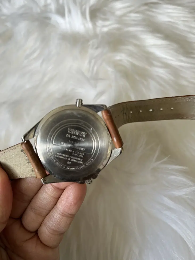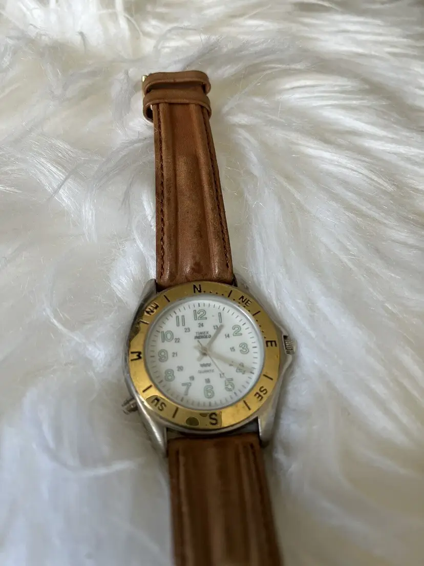 Bezel Color: Gold, Silver Water Resistance: 30 m (3 ATM) Movement: Quartz Indices: Arabic Numerals Year Manufactured: 1980-1989 Gender: Men's Brand: Timex Case Color: Silver Department: Men Type: Wristwatch Band Color: Brown Band Material: Leather Dial Color: White Model: Vintage Timex Quartz Style: Classic, Diver, Military, Sport Features: Backlight, Water Resistant, Easy To Read, Sport Diver Rotational Bezel Military Indiglo Dial, 24-Hour Dial Case Material: Stainless Steel Age: Vintage 1980-1990 Display: Analog