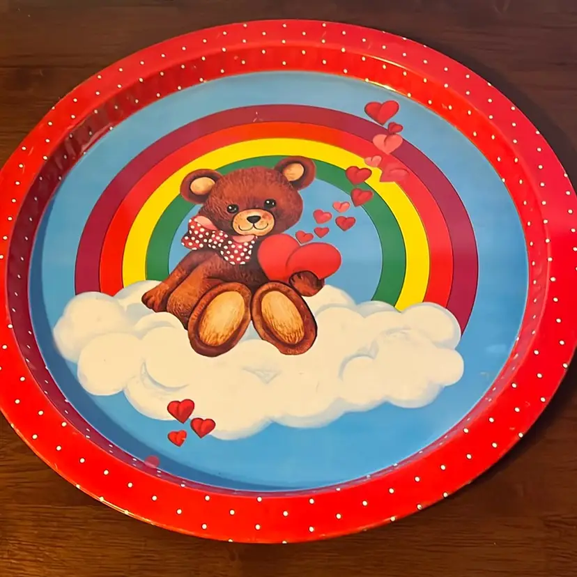 Tin trays, particularly those featuring popular characters and bright designs, became widely popular as decorative and functional household items throughout the mid to late 20th century. They served various purposes, from serving food and drinks to simply adding a splash of color to a kitchen or dining area. The designs often reflected prevailing cultural trends, such as the popularity of teddy bears and whimsical imagery in the 1980s and 1990s.