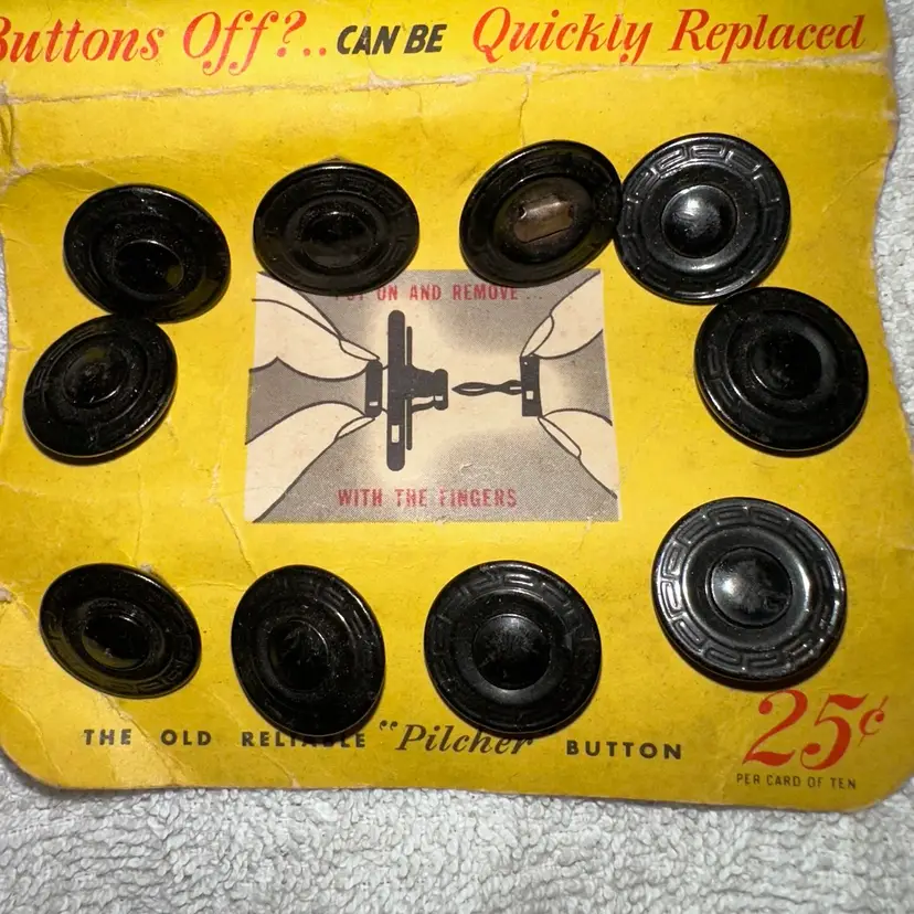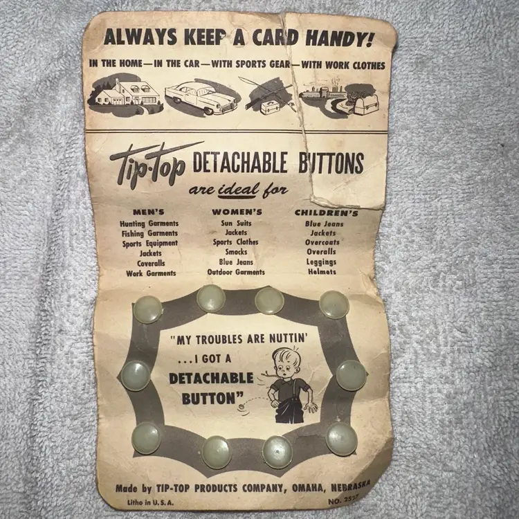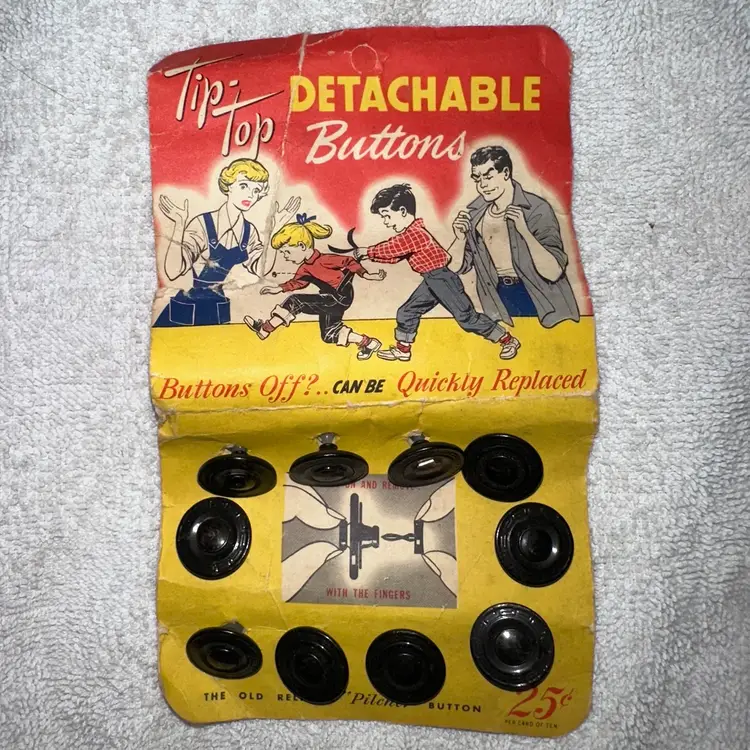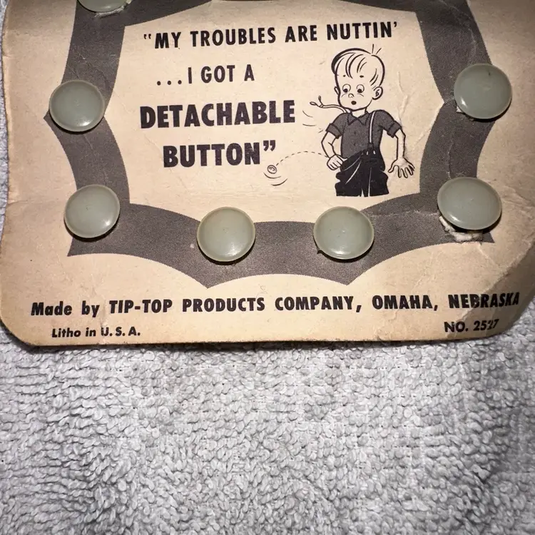 Vintage Tip Top Product Company Detachable Button Set Of 10 Original Packaging. Pilcher Buttons. Packaging Is Torn In Corner As Shown in Pic But Still Intact (Not By Much). Made In Omaha Nebraska. Numbered 2527. MCM. Retro. Smoke Free Home. #tiptopproducts #detachablebuttons #omaha #pilcherbutton #vintagebuttons