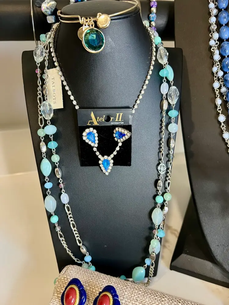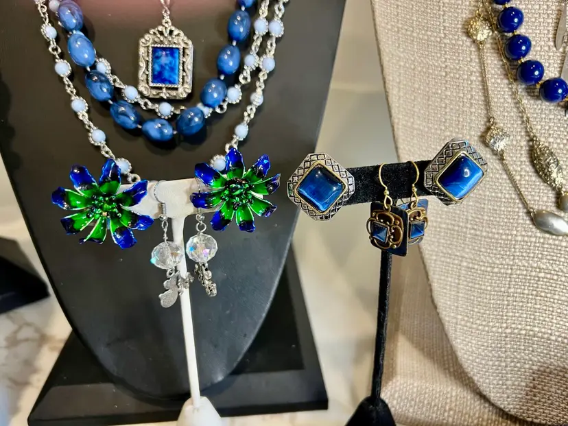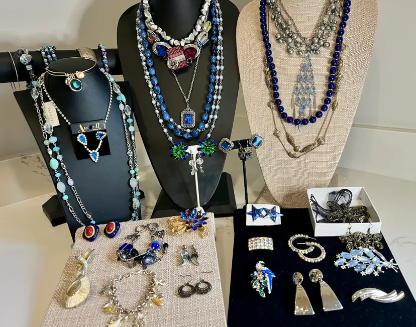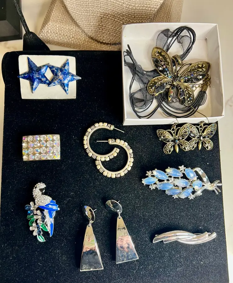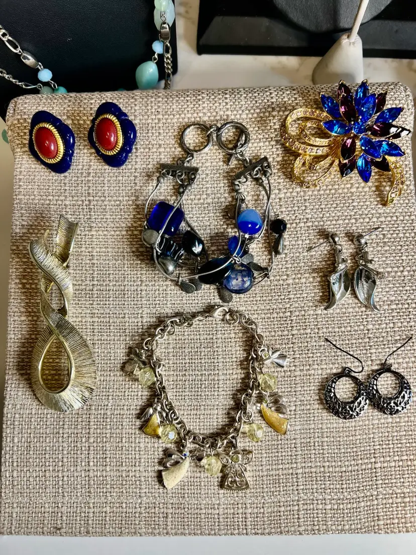 1-bling scarf buckle 8- bracelets (1 with tags) 10- necklaces 10- earrings 5- brooches 2- necklace & earring sets