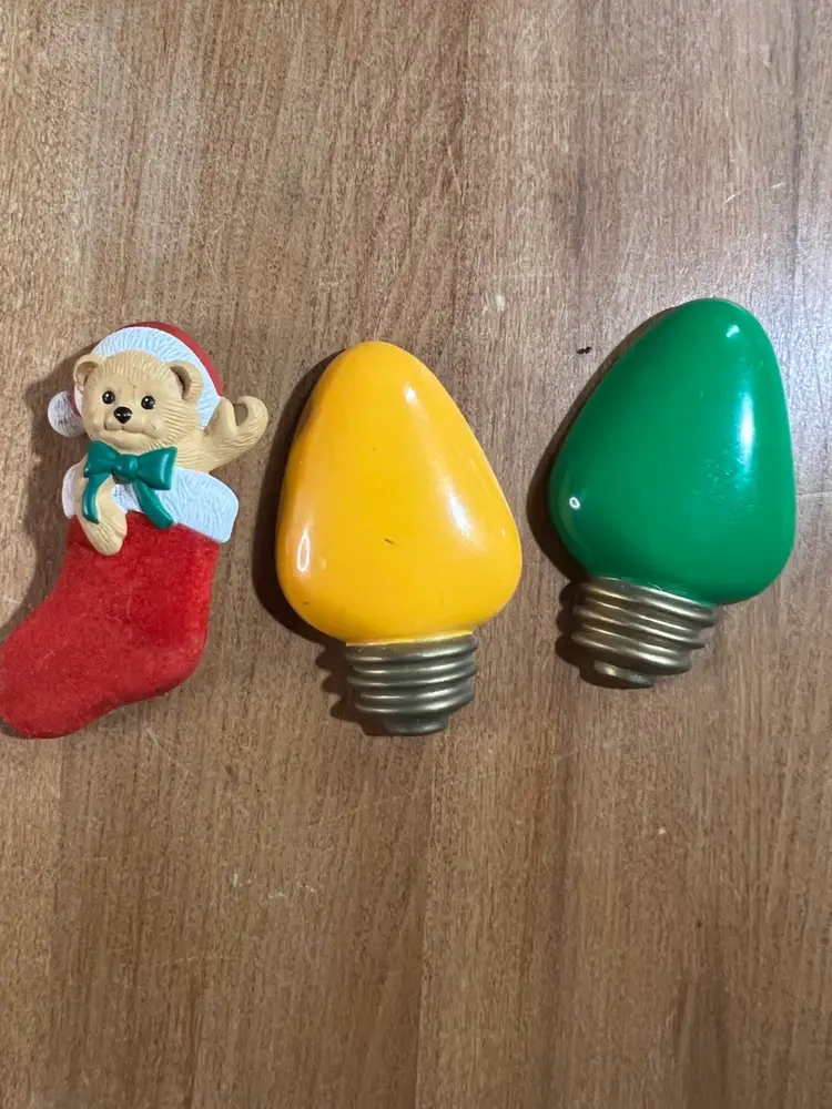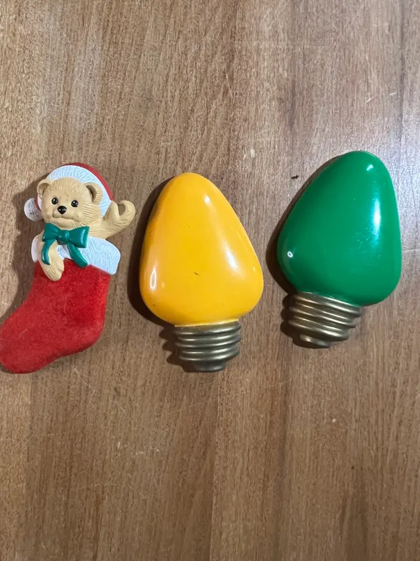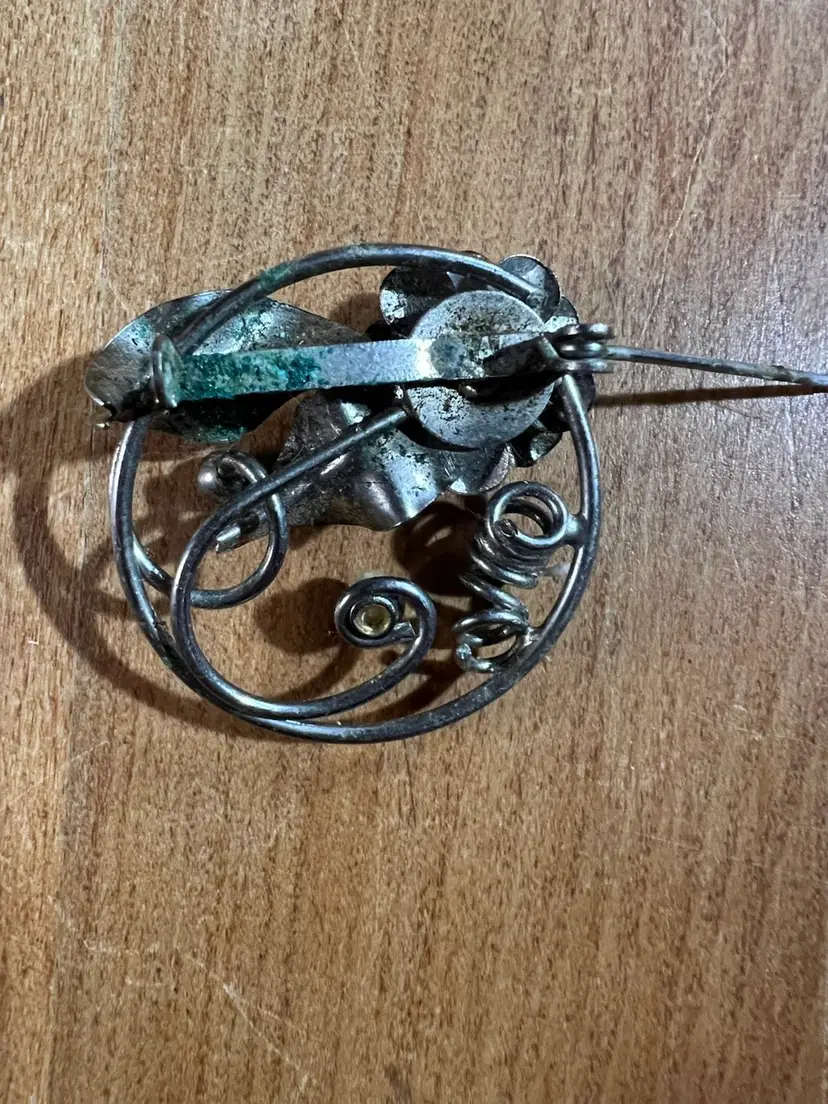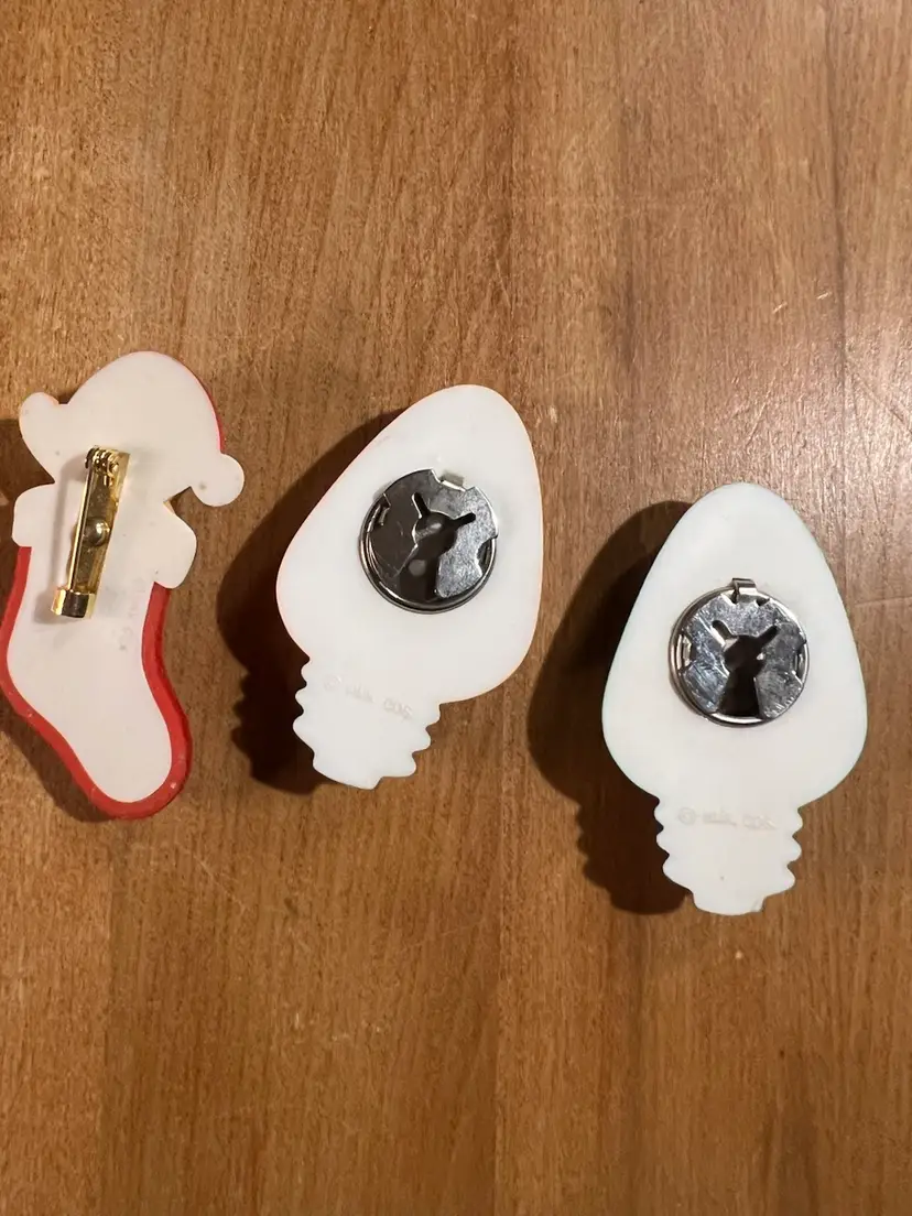 Large pin is marked sterling on the back. One other has a name on it. One pin is rusting on the back. 2 light bulbs are button covers.