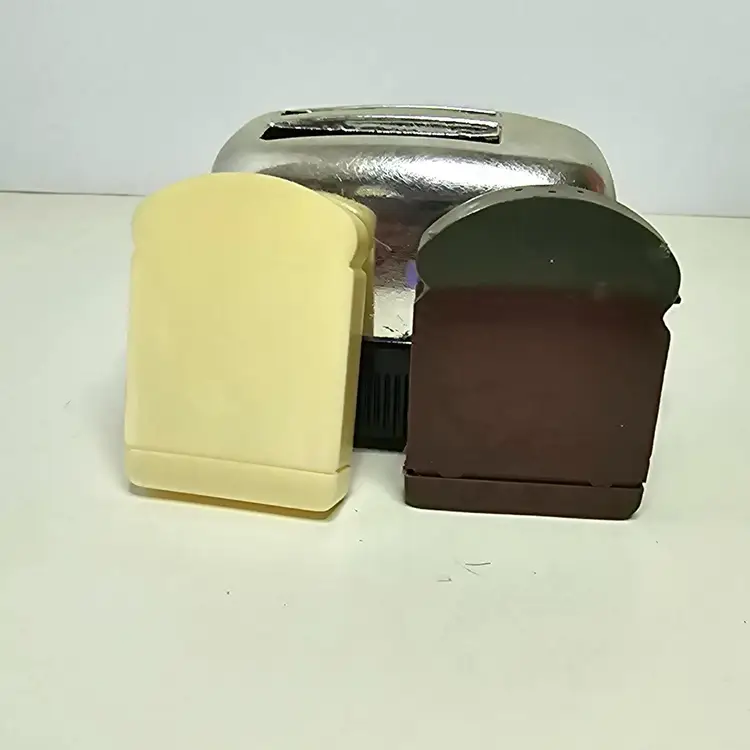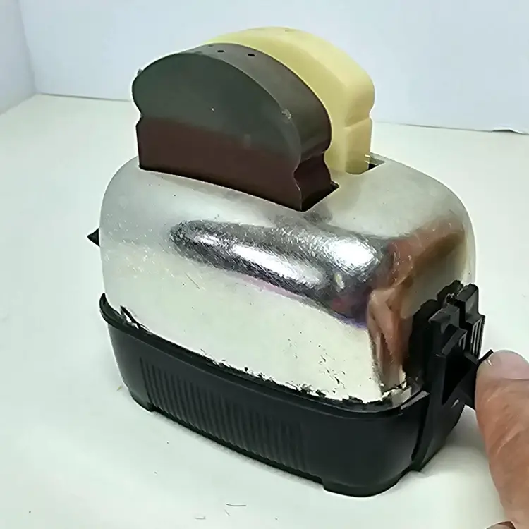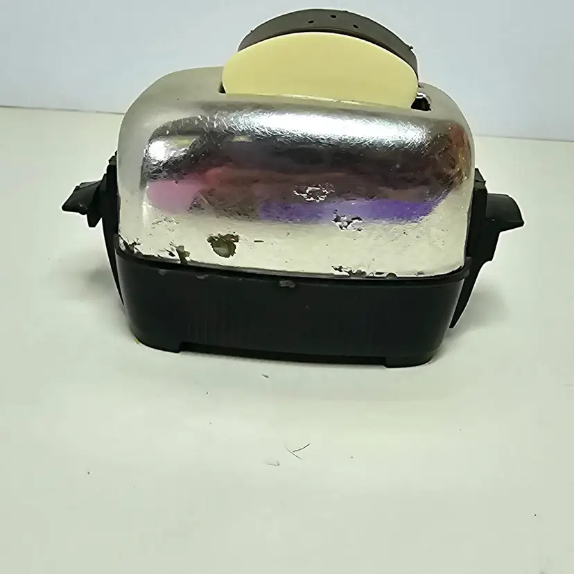 Working Vintage toaster and toast salt and pepper shakers. The toasters chrome is starting to flake off. The toaster measures 4.25" wide x 2" deep x 2.5 " tall without the toast and 3" tall with the toast. The toast slices are 2.5 " tall x 1.75" wide x .5" thick. I hope you can see the "wheat" slice has some color fading from sunlight.