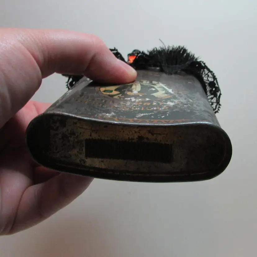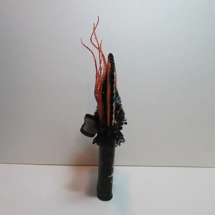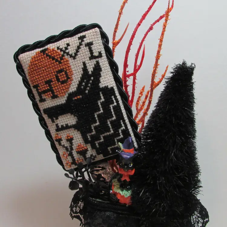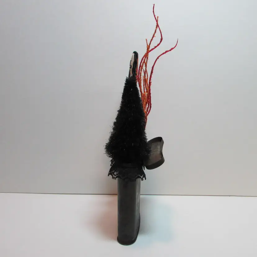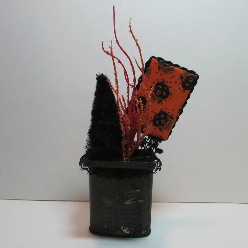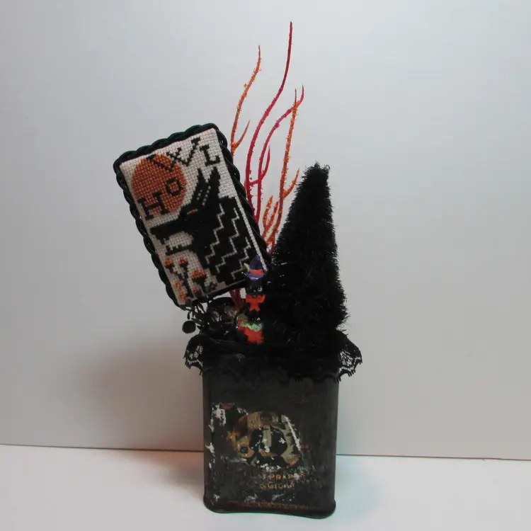 This lovely piece was made by my mother. She used a vintage tin and added some artificial plants and a cross stitched wolf. She added a bag of sand inside to give it some weight to keep it from falling over. It is about 10" tall, the tin is about 4 1/2" x 3" x 1". This is shipped from a smoke free home. Thanks for looking!