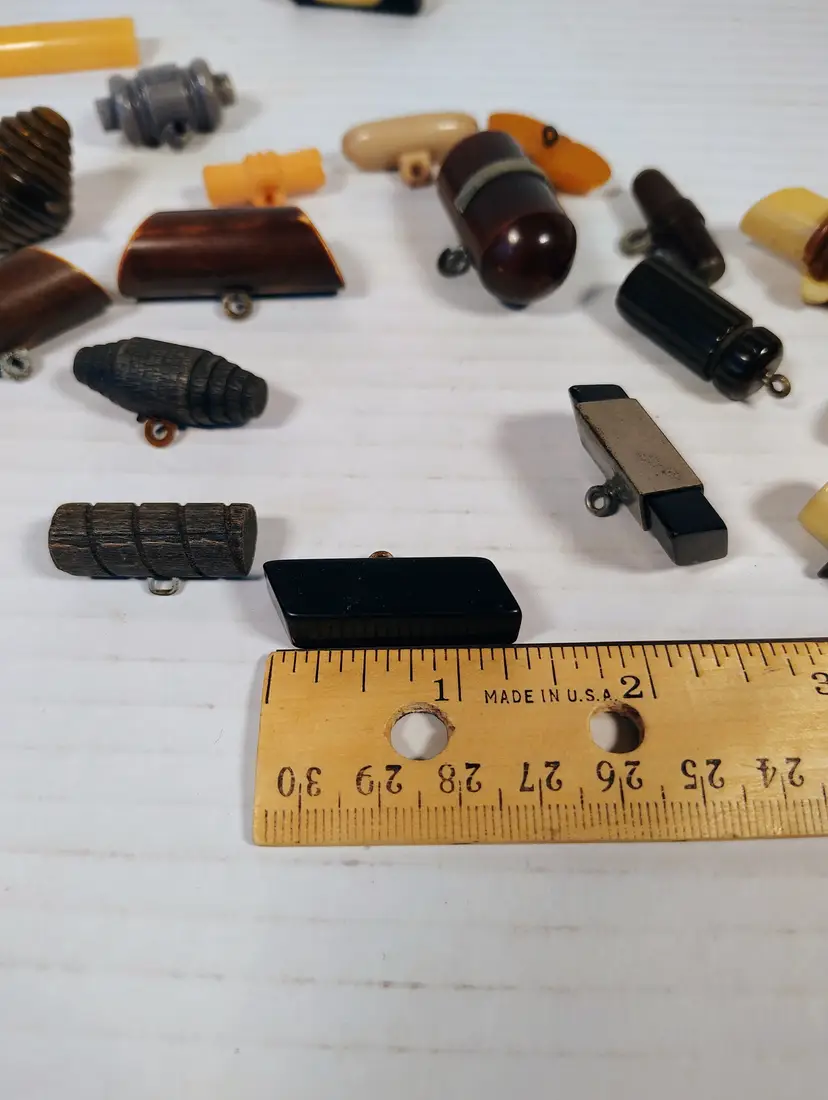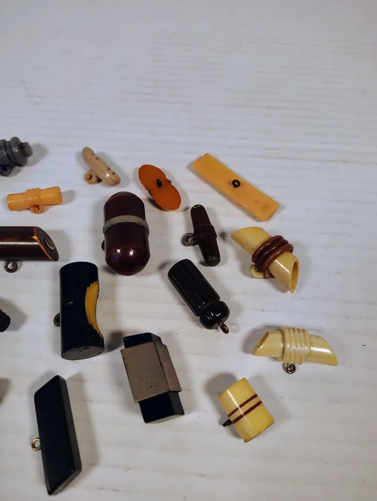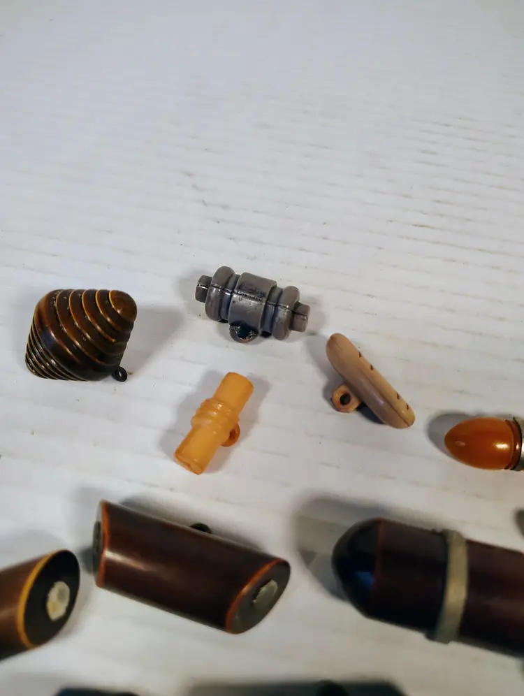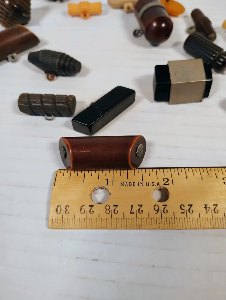19 vintage toggle buttons of mixed materials. There's wood, plastic, possibly resin or bakelite, not tested. There are loop metal shanks and plastic key shanks. There are a couple metal shanks and accents that have slight corrosion. Please see pictures for details