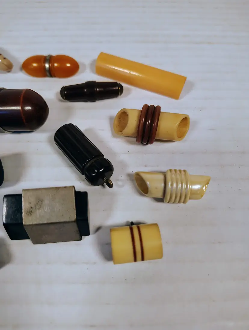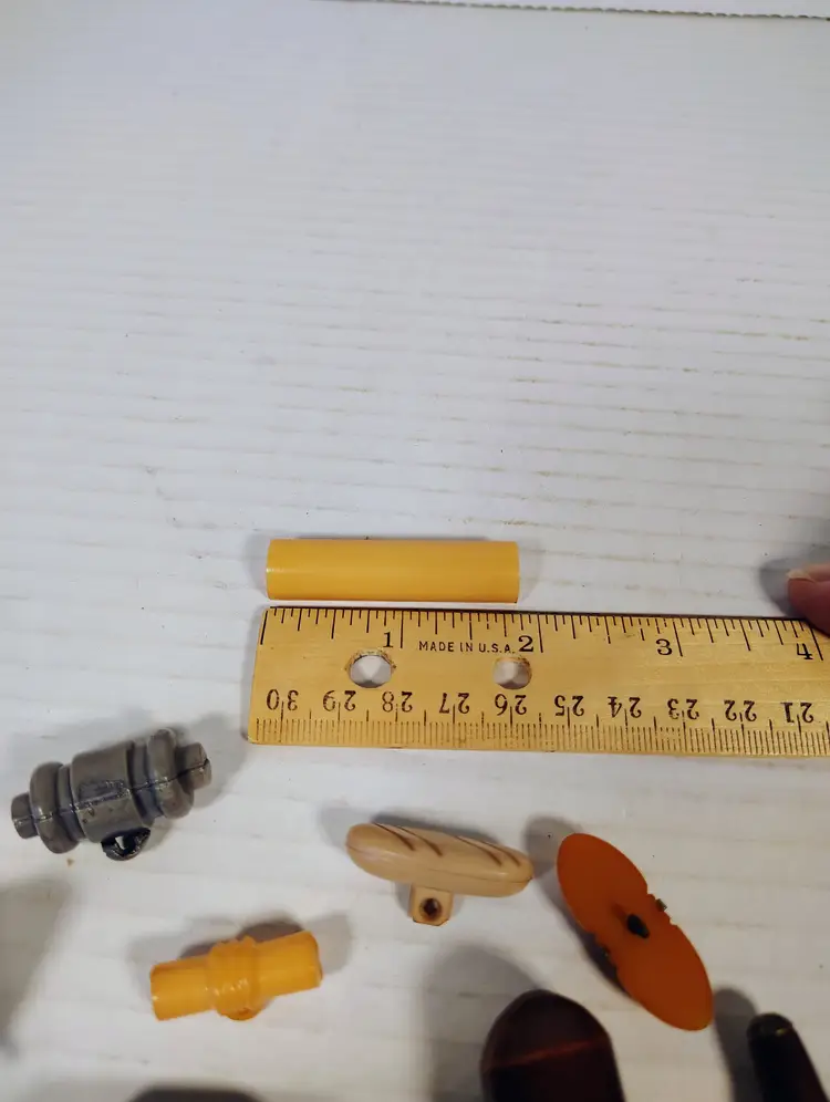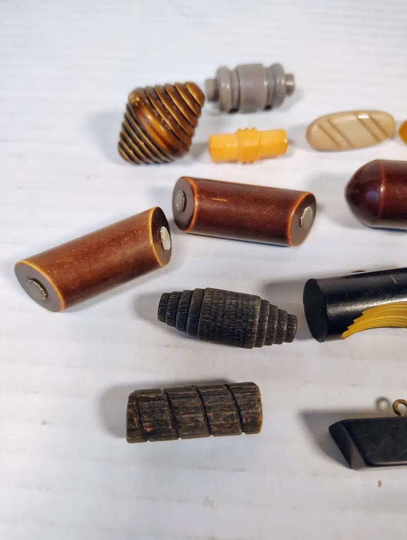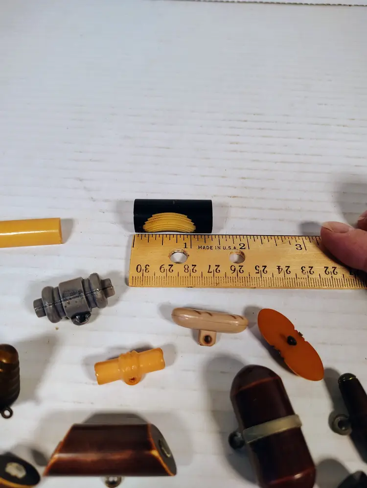 19 vintage toggle buttons of mixed materials. There's wood, plastic, possibly resin or bakelite, not tested. There are loop metal shanks and plastic key shanks. There are a couple metal shanks and accents that have slight corrosion. Please see pictures for details