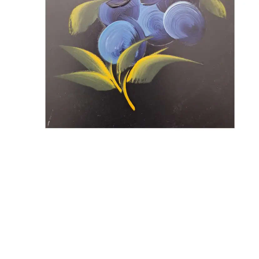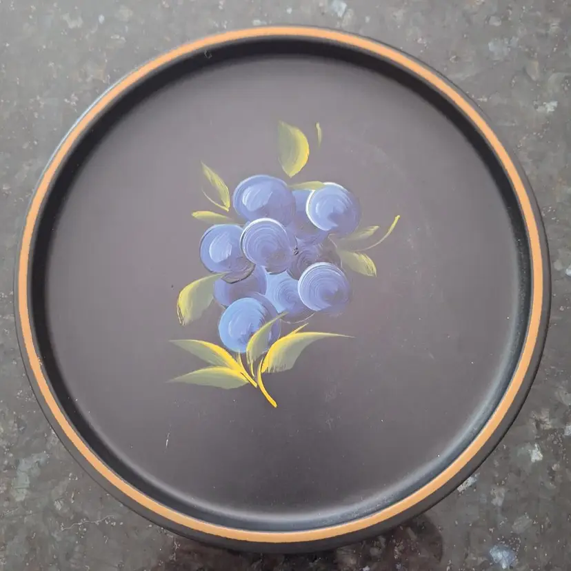 Great handpainted vintage tray measuring approx 7 & 3/4" diameter-features "blue berries/grapes? against a black background. Tray is edged in gold paint. Please see pictures- scratches on back from display/use and one small scratch on front.