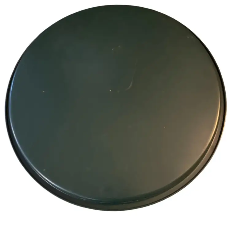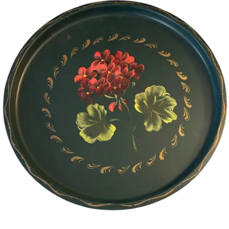 Approx. 11” diameter Vintage 1970’s green metal toleware tray featuring hand-painted floral design depicting a geranium Toleware tray, which refers to decorative painted metalware, often with hand-painted designs Dark green background with a central floral motif, appearing to be a red geranium with green and yellow leaves, encircled by a golden scrollwork border