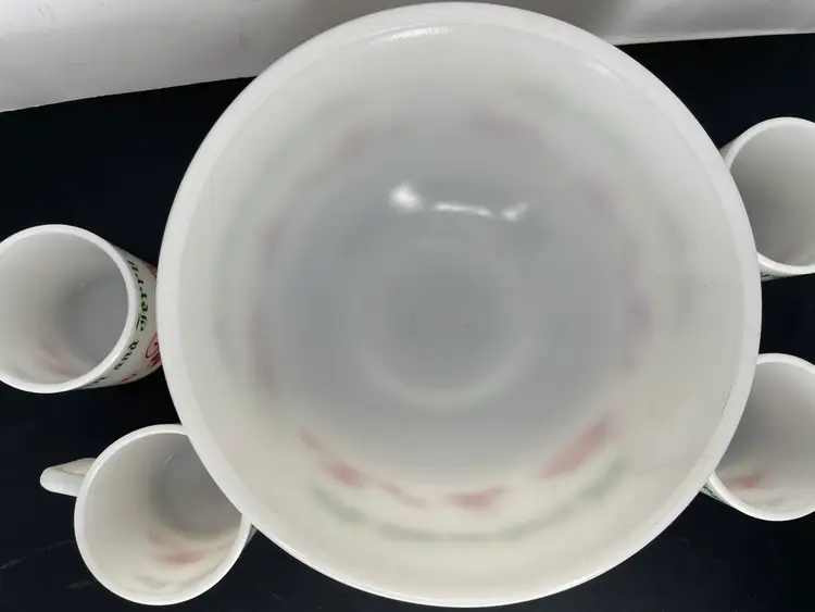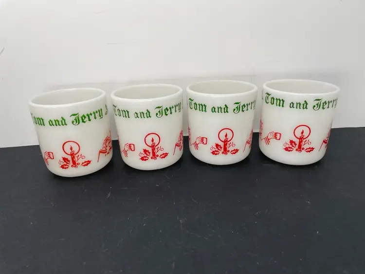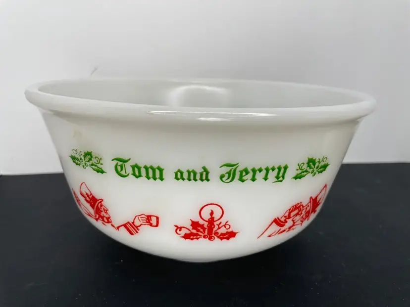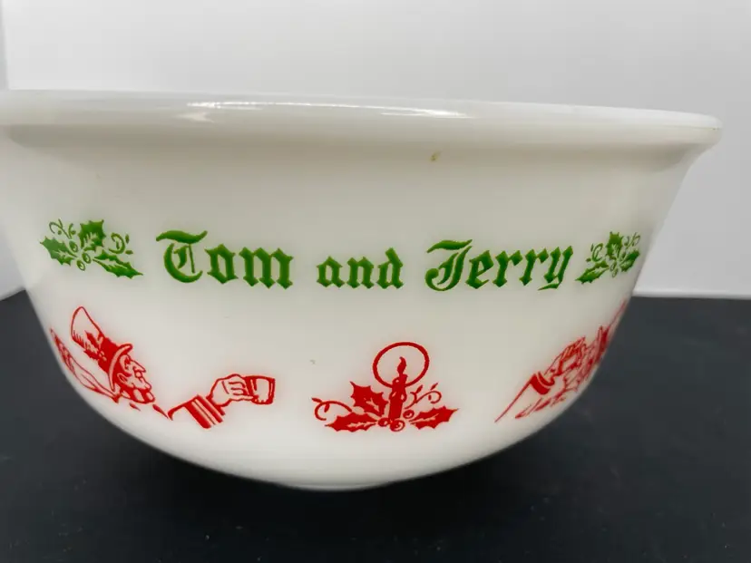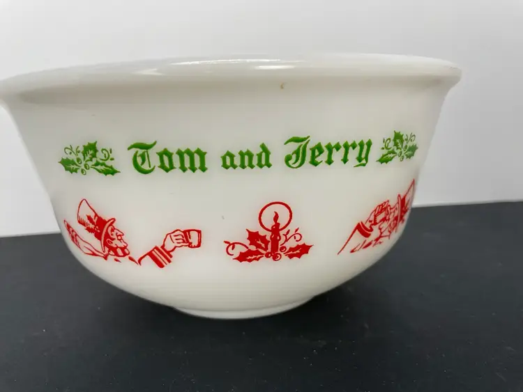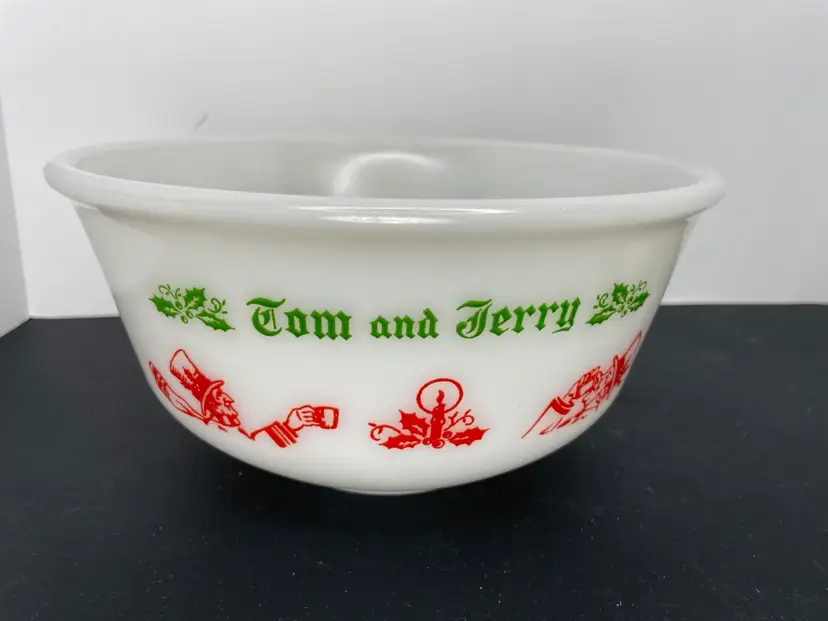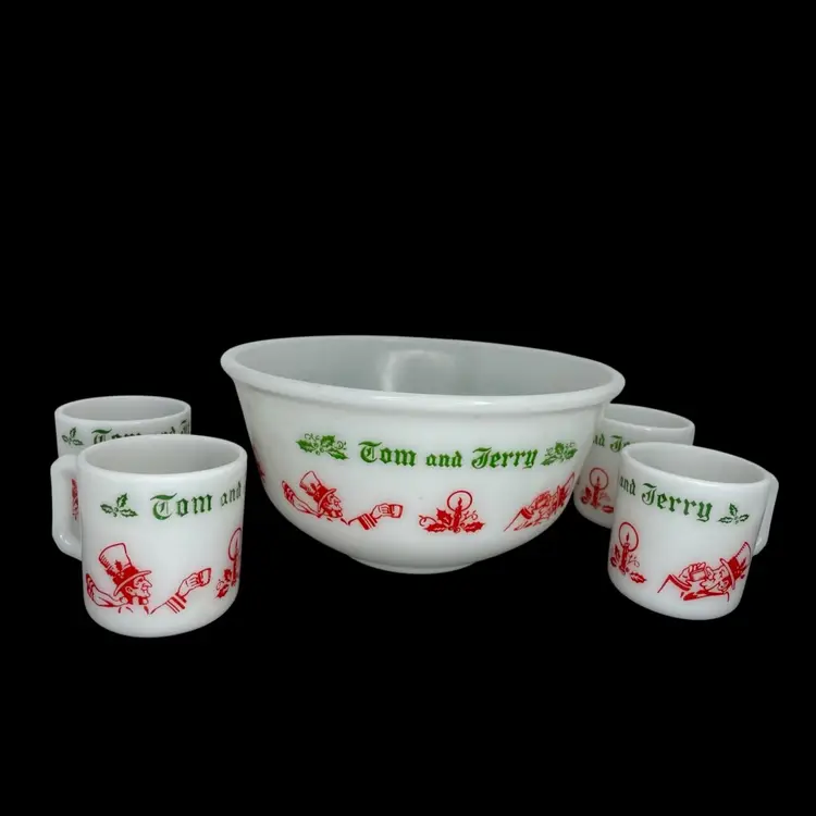 Add a touch of nostalgia to your holiday gatherings with the Vintage Tom and Jerry Christmas Punch Eggnog Bowl and Mugs set, crafted by Hazel Atlas. This charming collection features milk glass items that are sure to bring a smile to your guests' faces, with classic designs that hark back to the 1950s.