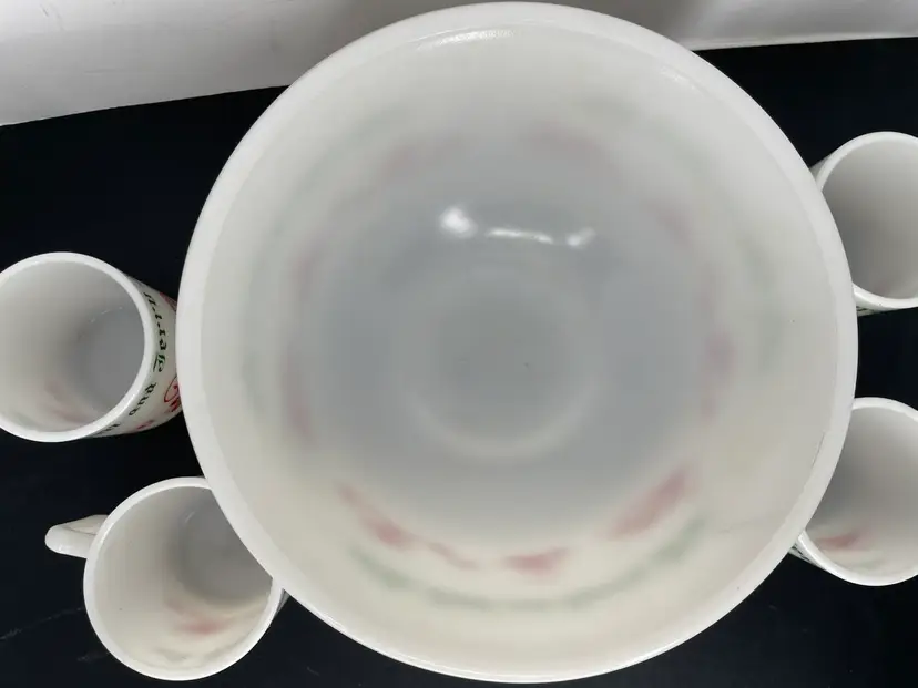 Celebrate the season in true vintage style with this delightful eggnog set, complete with bowl and 4 mugs that boast a timeless white color adorned with the iconic red & green graphics. Proudly manufactured in the United States during a period when attention to detail was paramount, this collectible set is a testament to the holiday traditions of yesteryear.