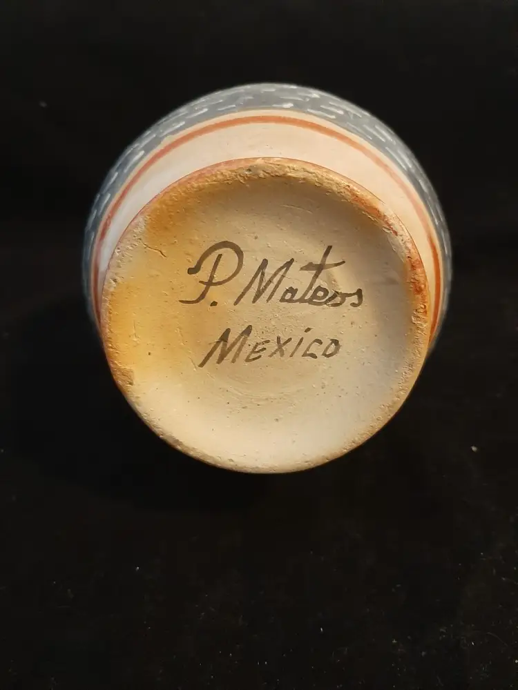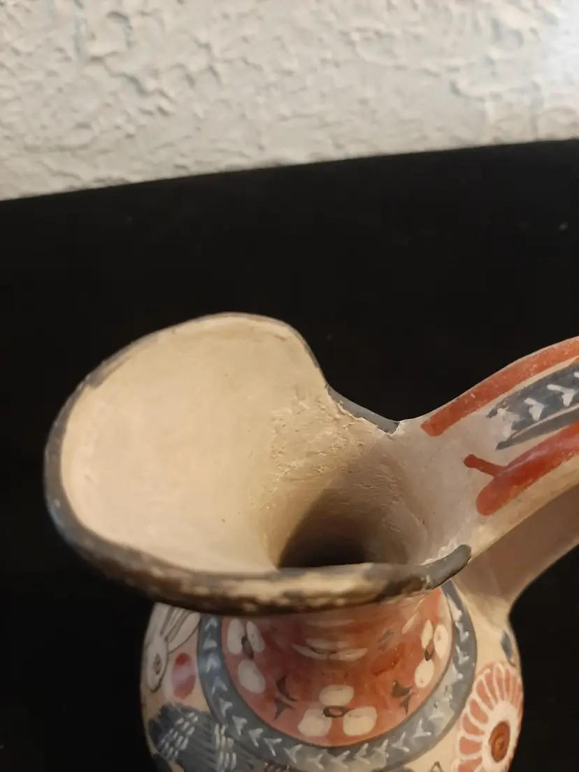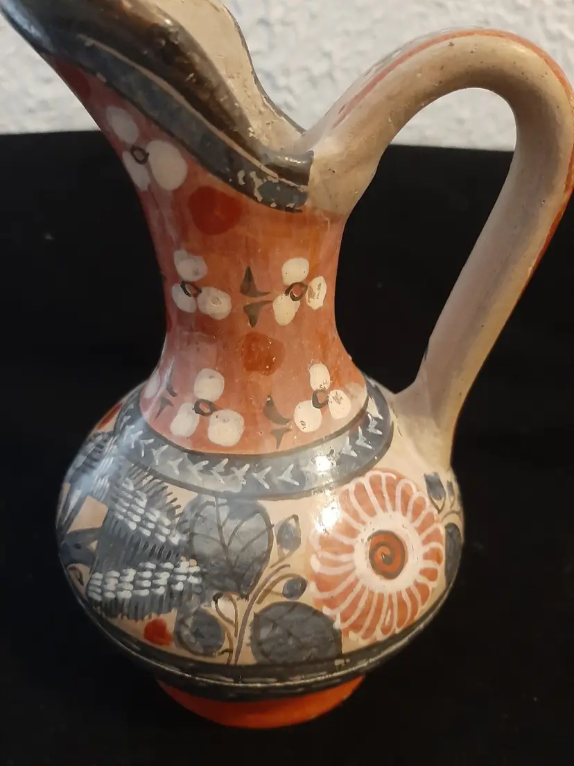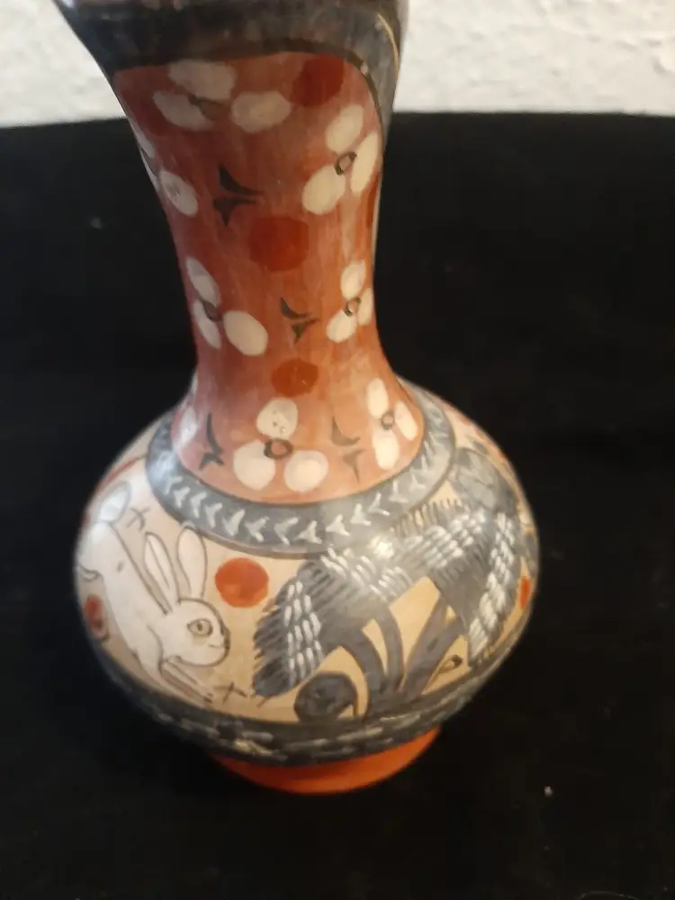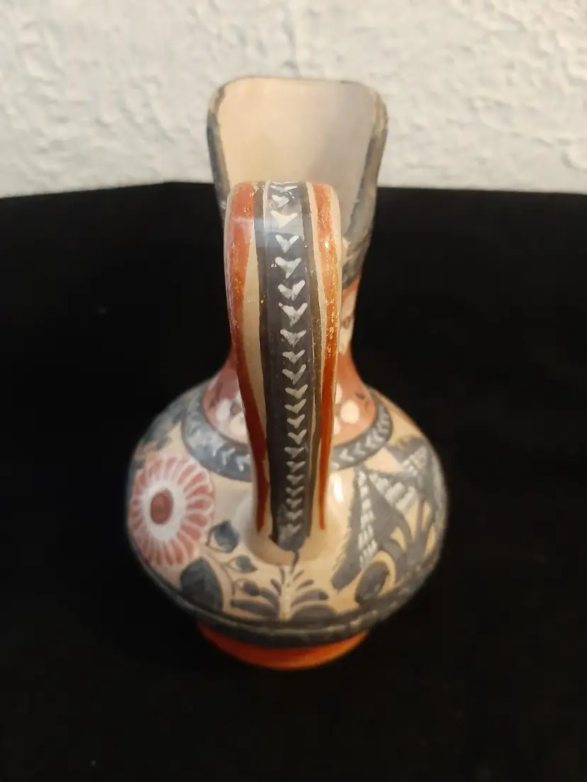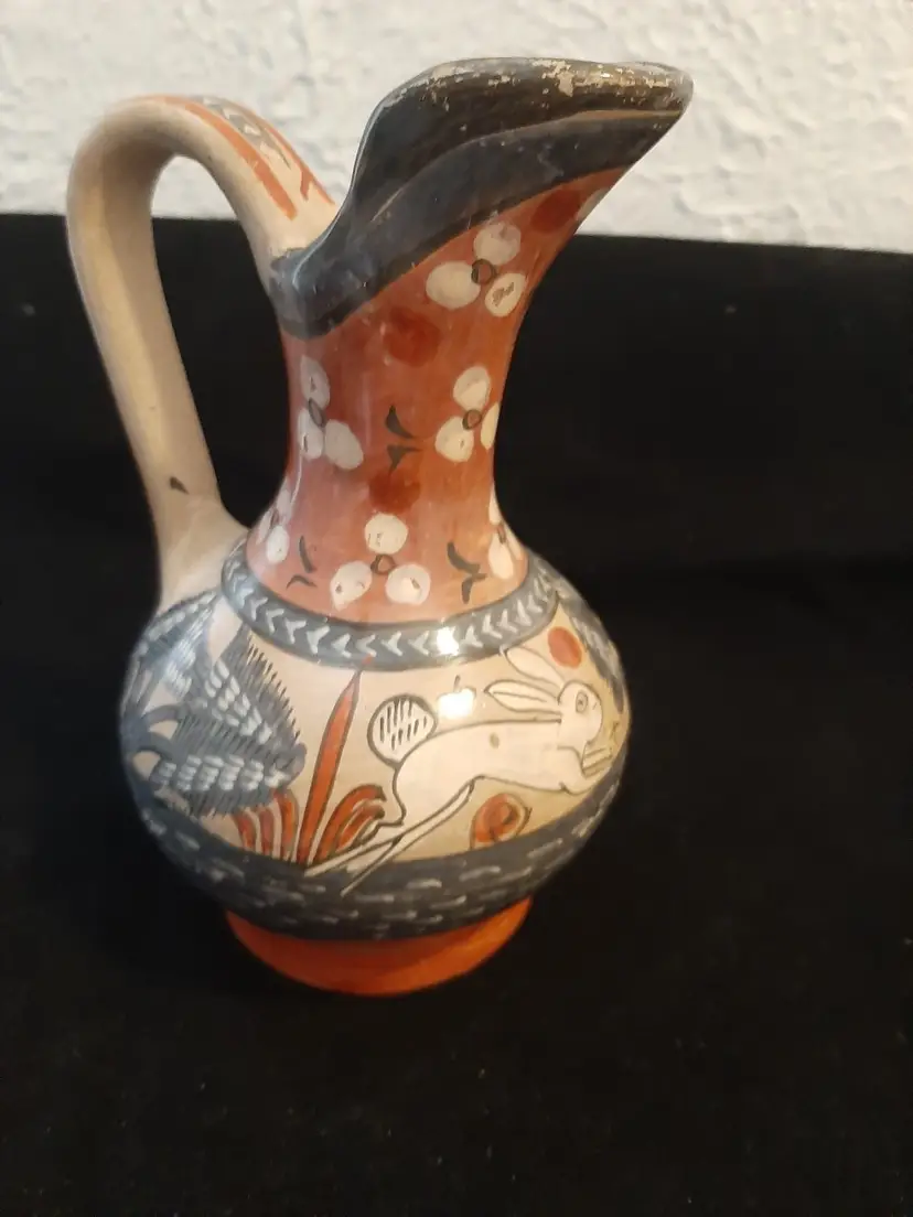Wonderful little pitcher / ewer, signed P Mateos Mexico, with a rabbit, flowers, leaves & other foliage in white, greyish blue, dark gray, muted red. Couple of areas of paint wear on lip & foot (see pictures). Wonderful example of this type of Mexican folk art!