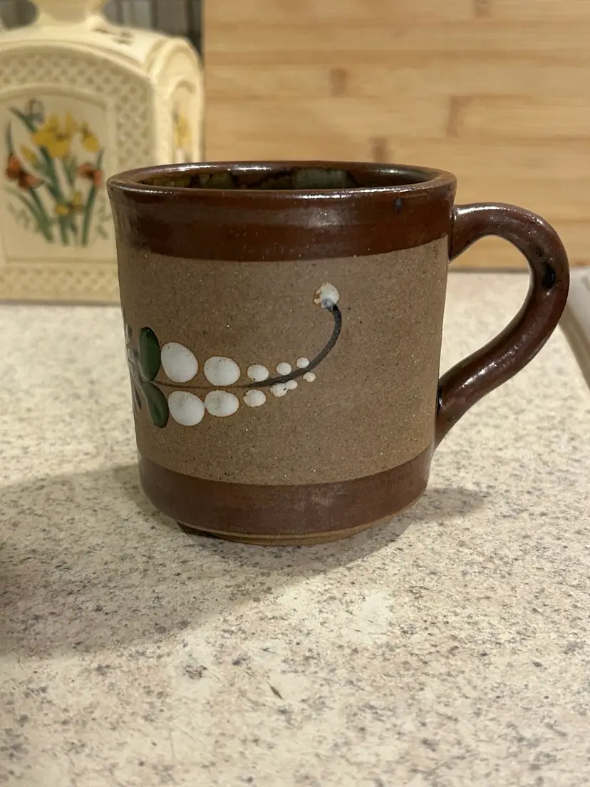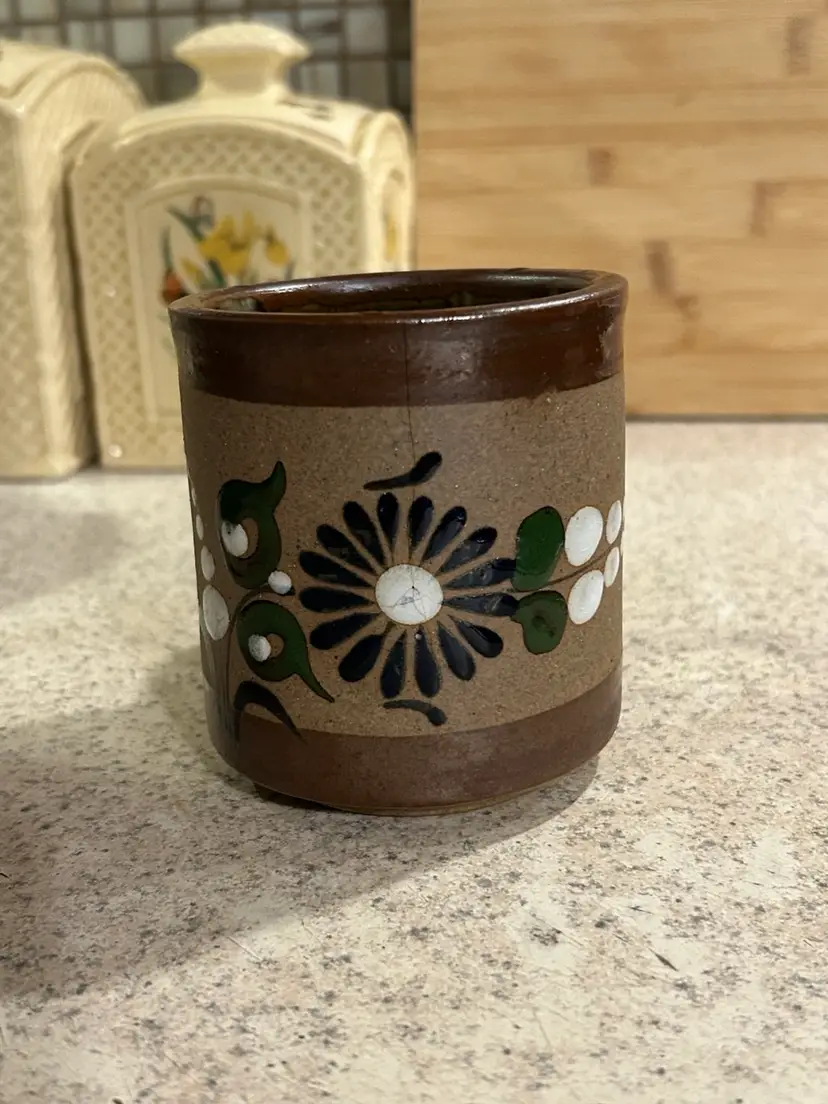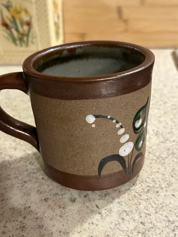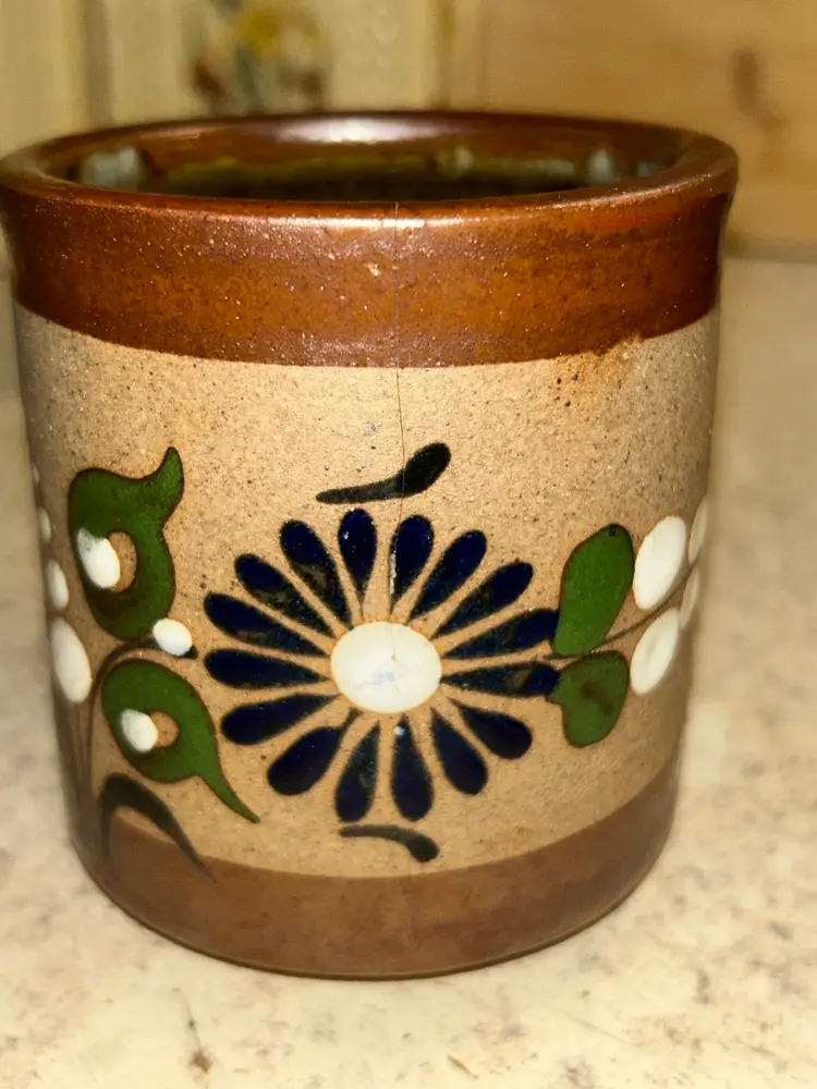 This is a vintage Tonala ceramic mug featuring traditional Mexican floral designs. The piece is hand-painted with earthy tones and intricate patterns, showcasing the craftsmanship typical of Tonala pottery. There is condition issues. Has hairline crack in front of the mug. See pictures for condition issues.