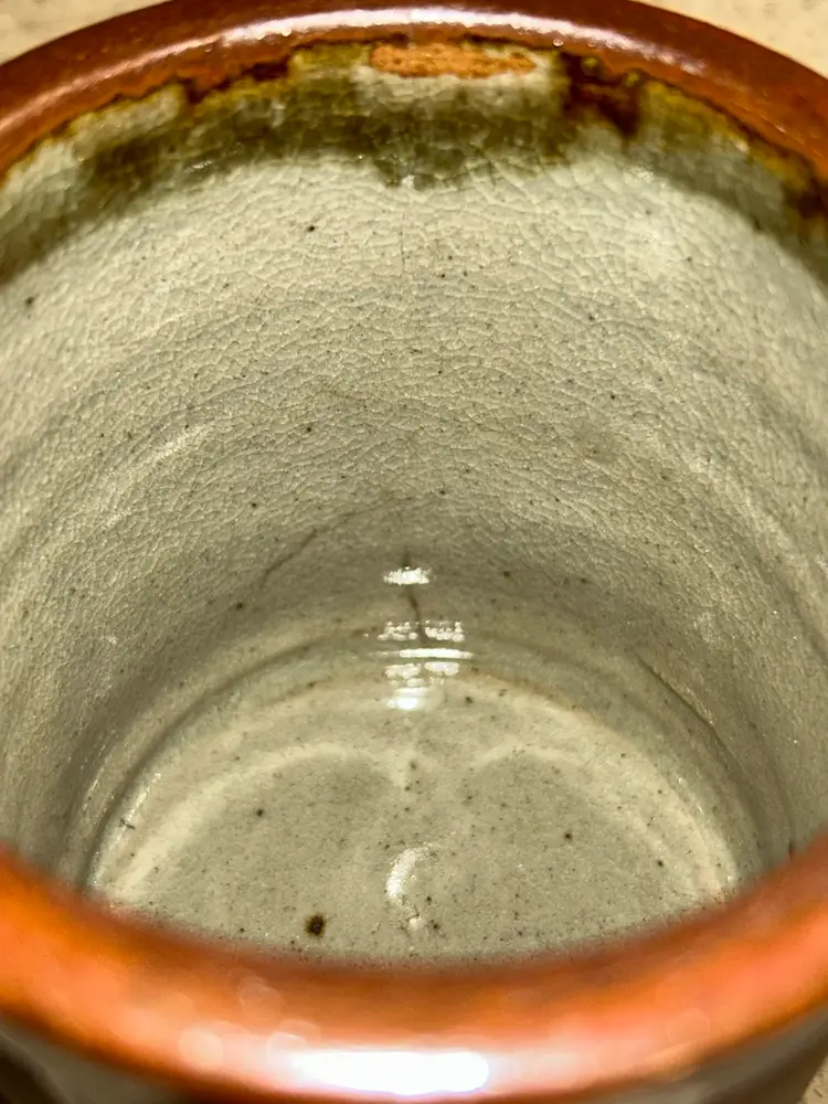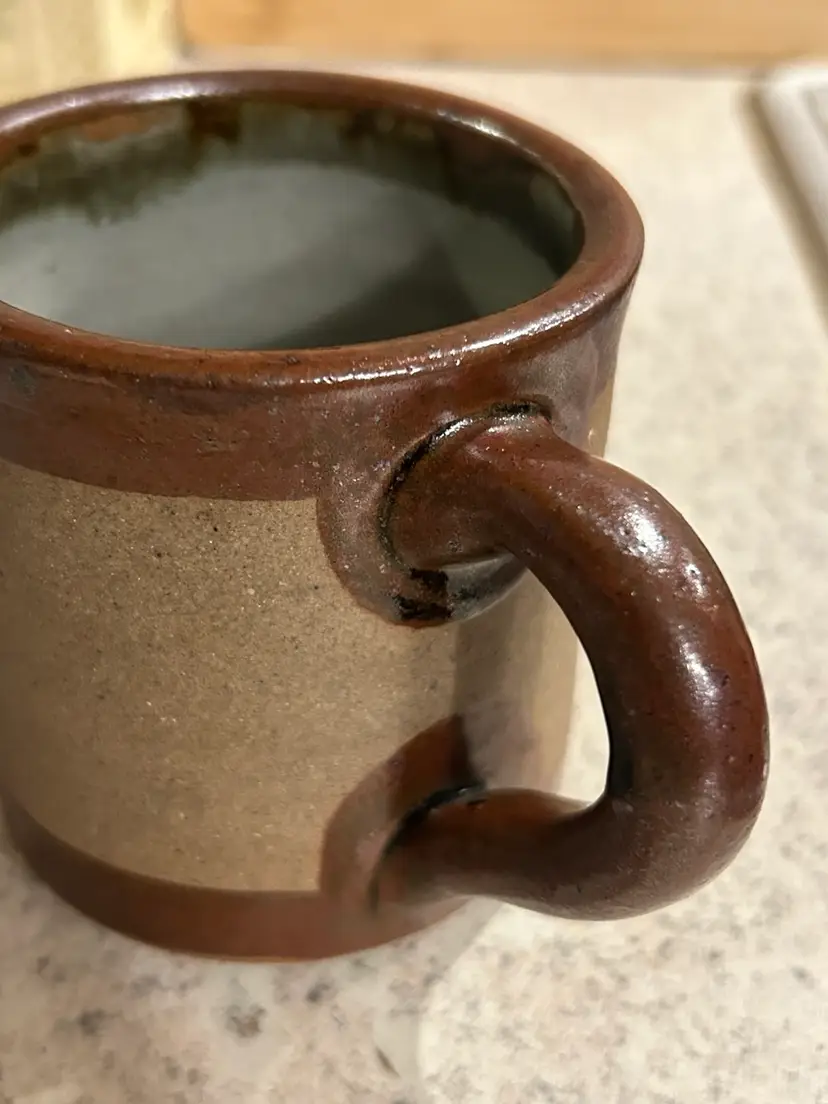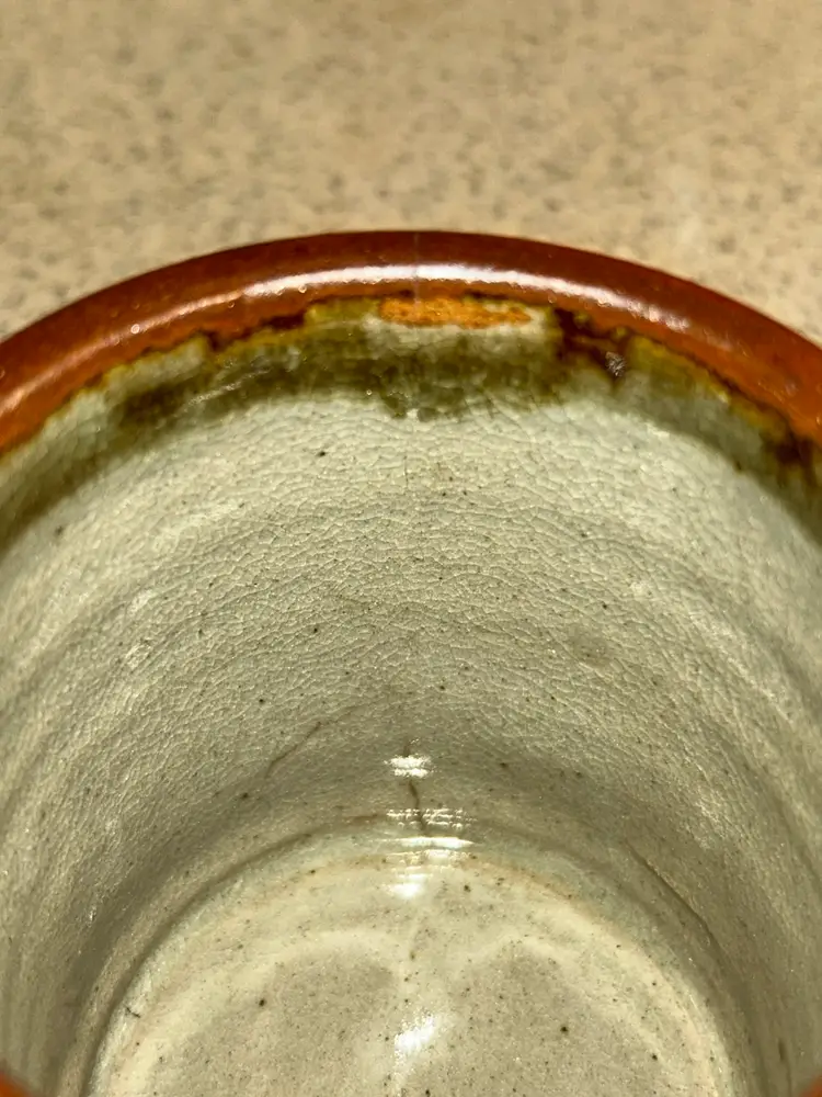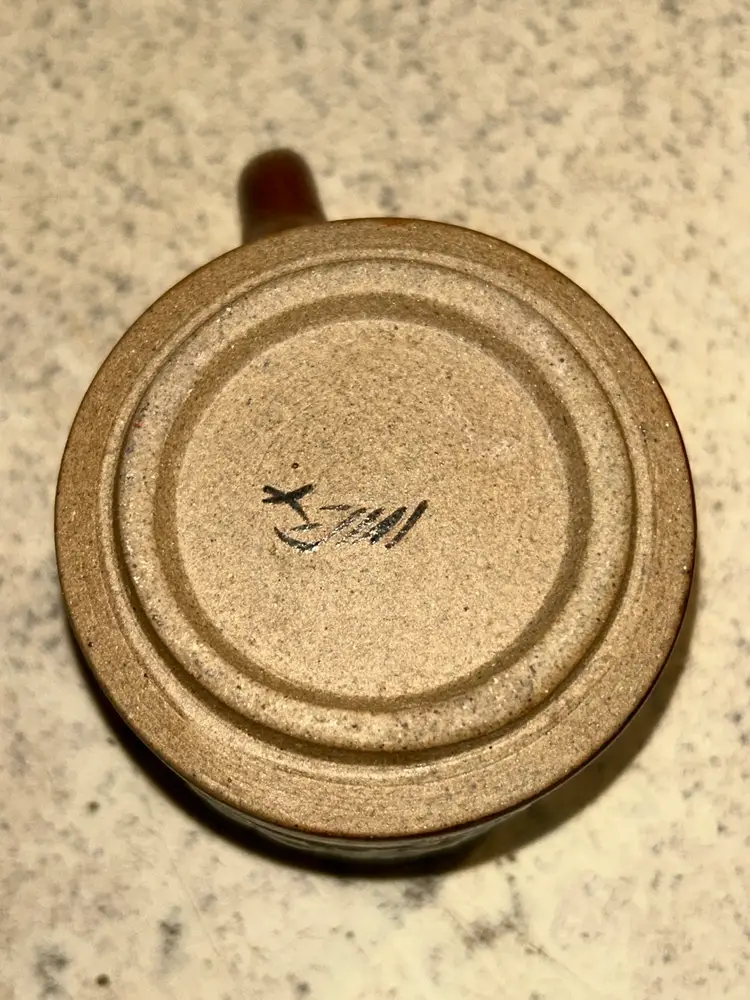 This is a vintage Tonala ceramic mug featuring traditional Mexican floral designs. The piece is hand-painted with earthy tones and intricate patterns, showcasing the craftsmanship typical of Tonala pottery. There is condition issues. Has hairline crack in front of the mug. See pictures for condition issues.