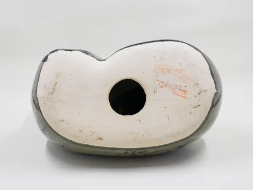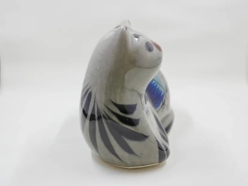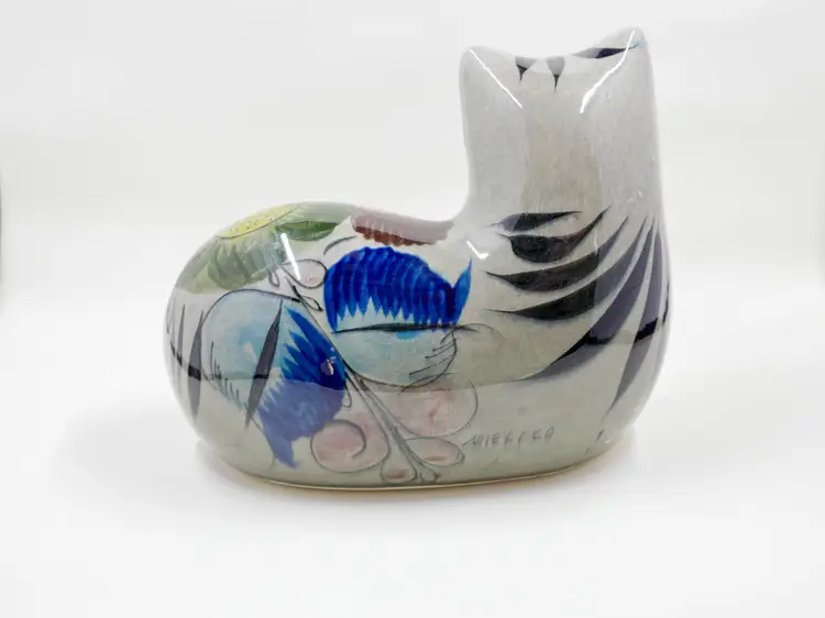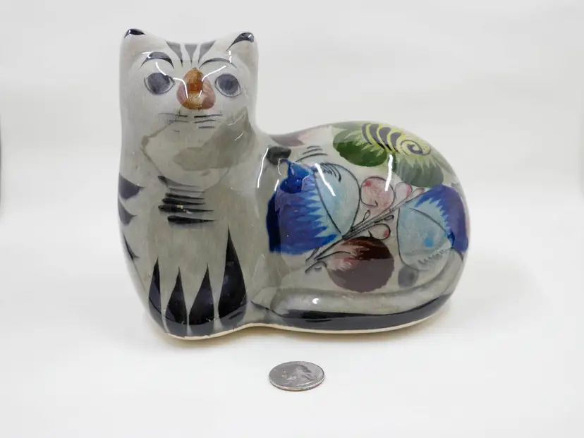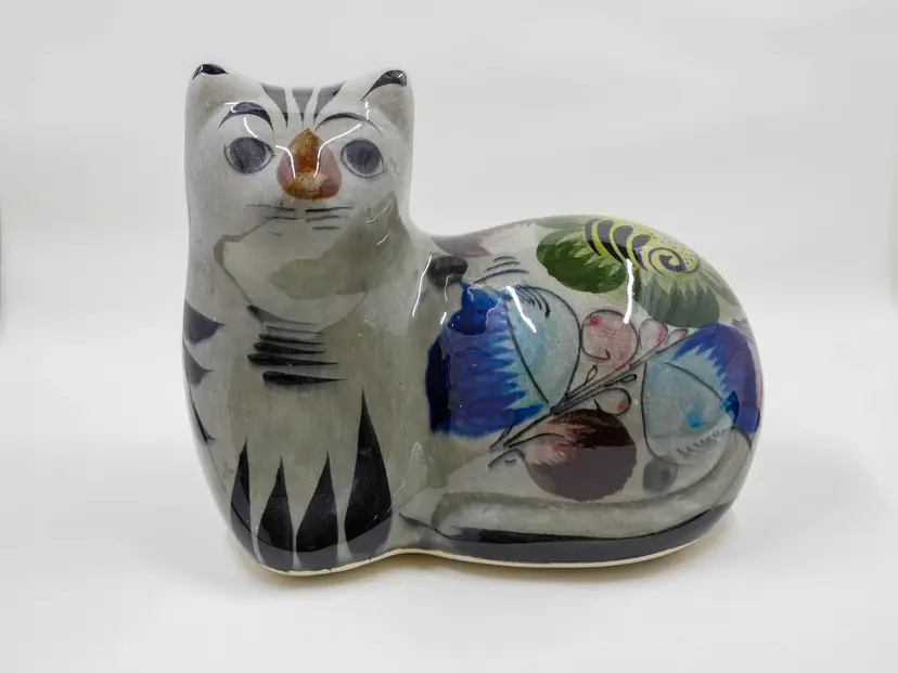 A glazed ceramic figurine of a cat lying down. It is hand-painted in traditional Tonala style with a stylized floral design on a grey body. The back of the piece is marked Mexico. It is in great condition with no chips, cracks or crazing. Approx. size is 6" long x 5.75" tall x 4" wide.