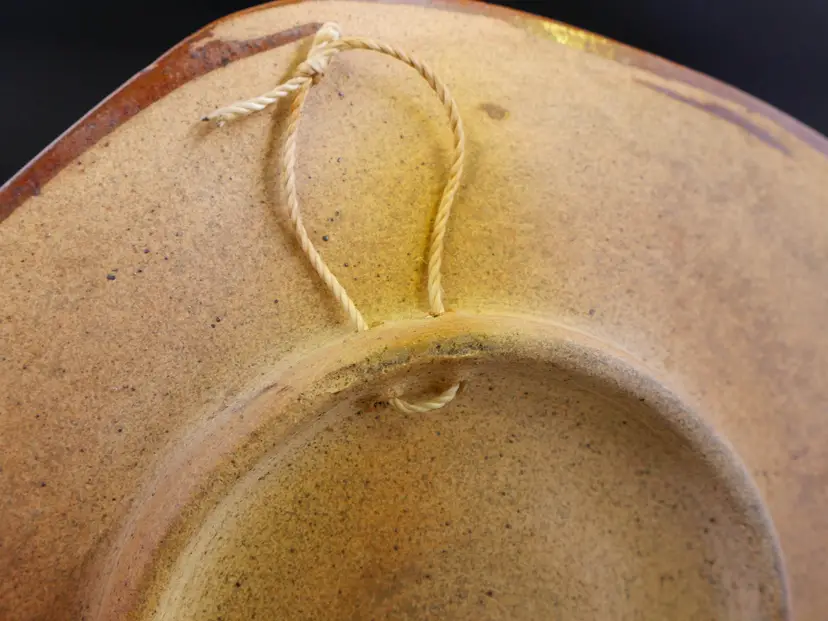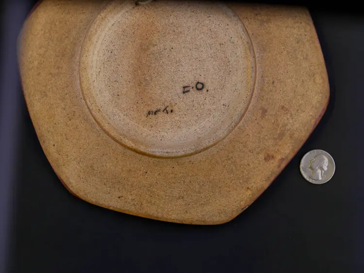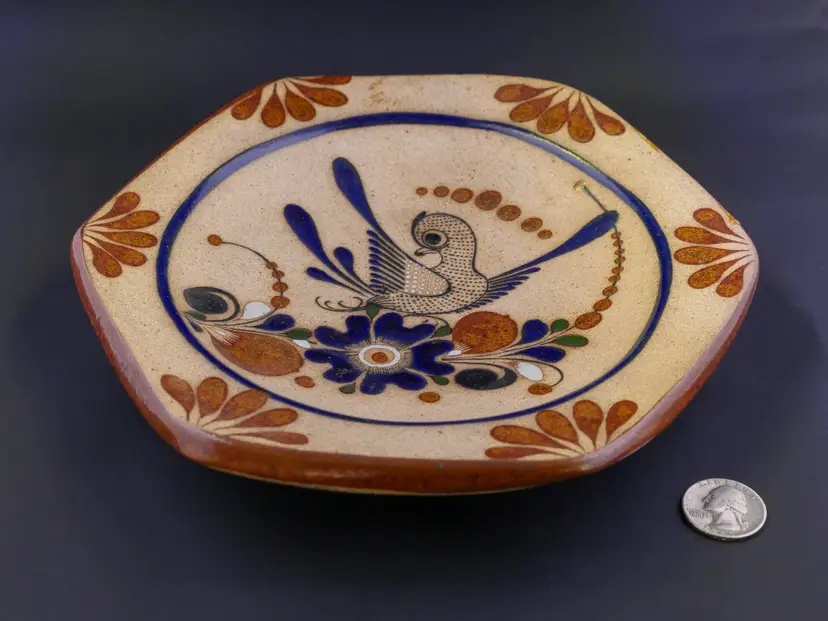 A hexagonal-shaped decorative plate made of glazed Tonala pottery. It is hand-painted with a stylized bird in the center, surrounded by traditional floral and foliate motifs in shades of blue, brown, and gray. The back has a hole for hanging and is marked "Mexico and C.O." In excellent condition with no chips, crack or flea bites. Approx. size 8"