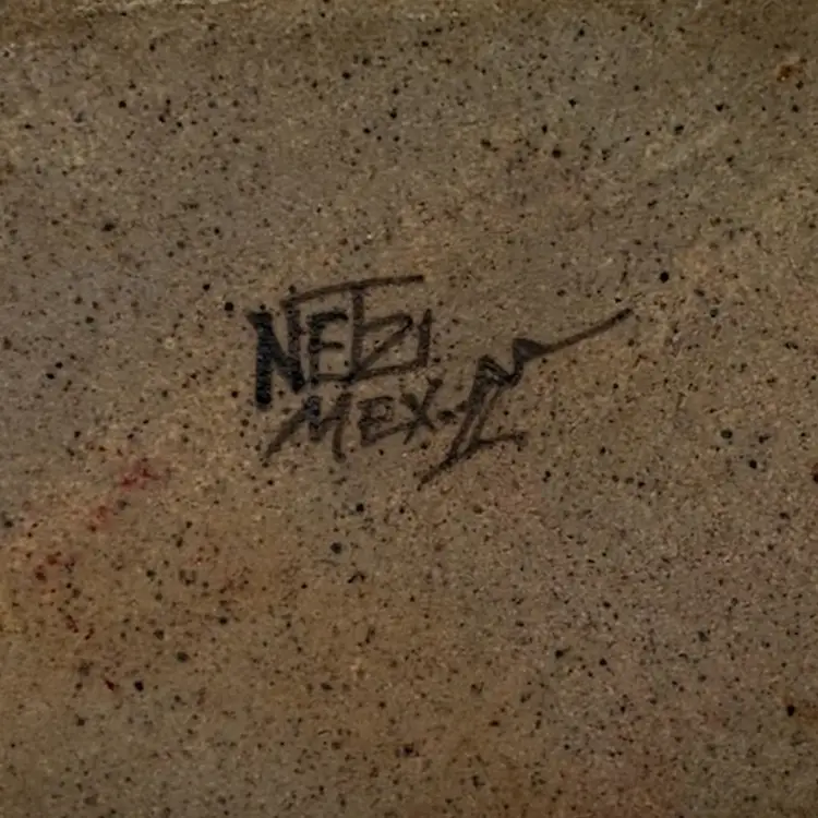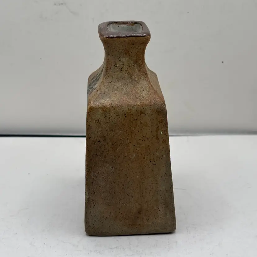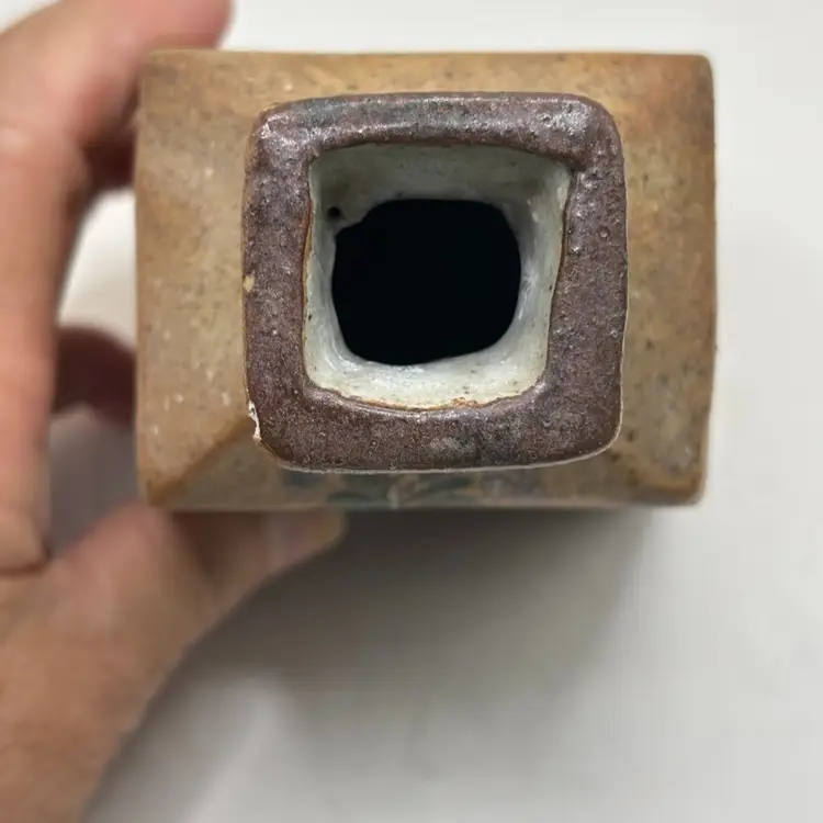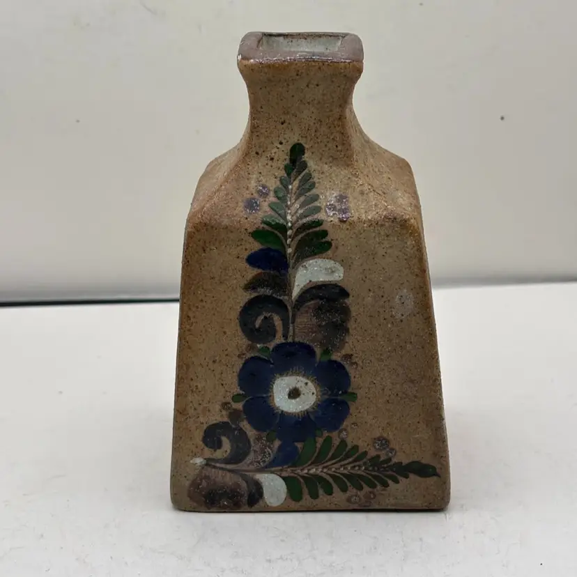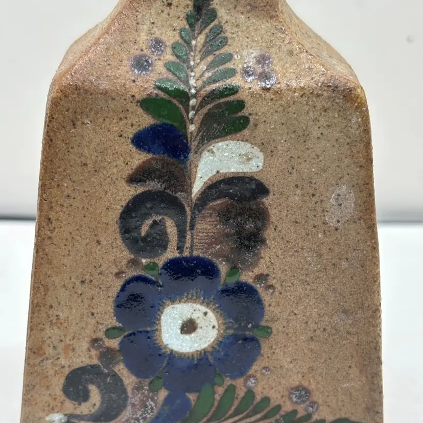 Sandstone vase with hand painted floral design in indigo blue, green and earth tone browns.