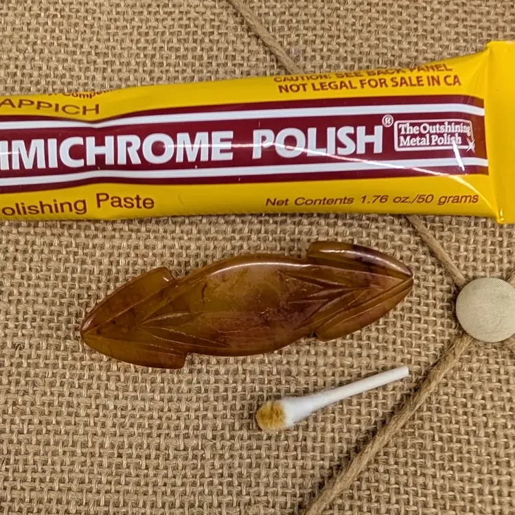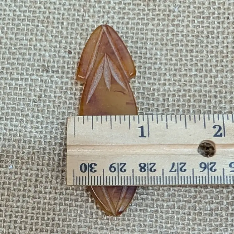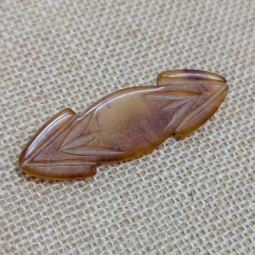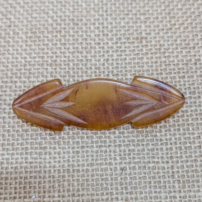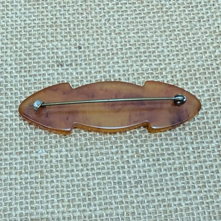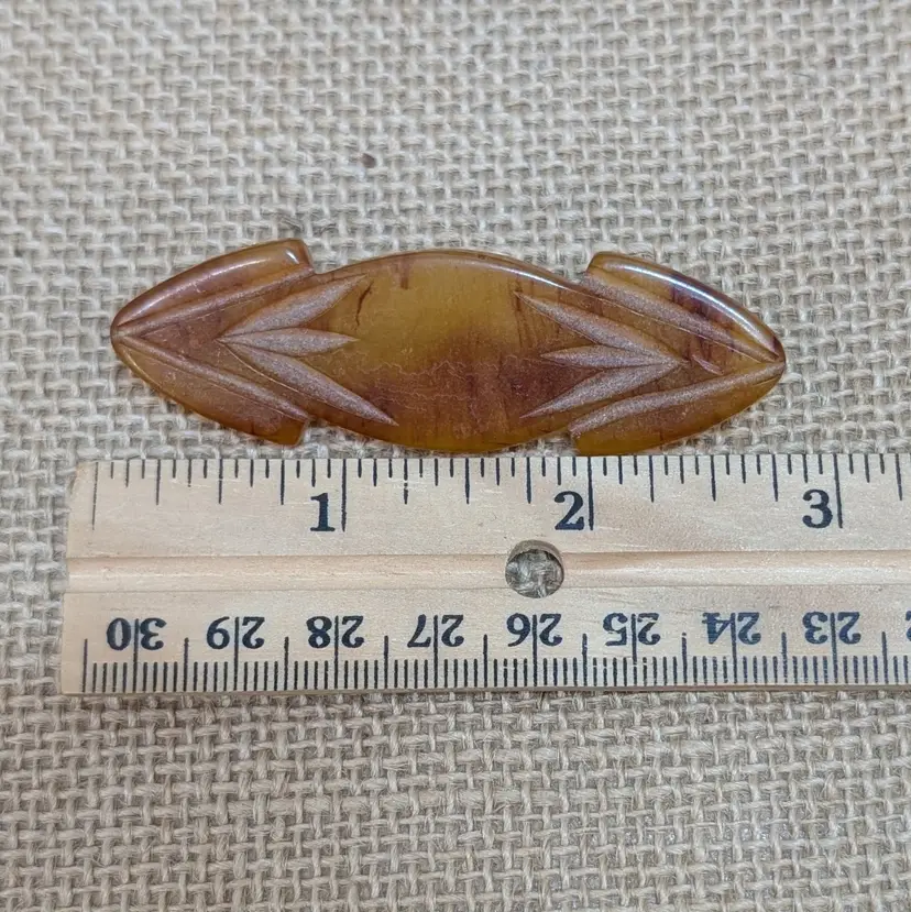 Carved brooch made from marbled butterscotch and brown Bakelite. It could be cleaned/polished a little to get a better shine as it looks like it has a sealant applied originally. Measurements ~ 2-3/4 x 7/8"