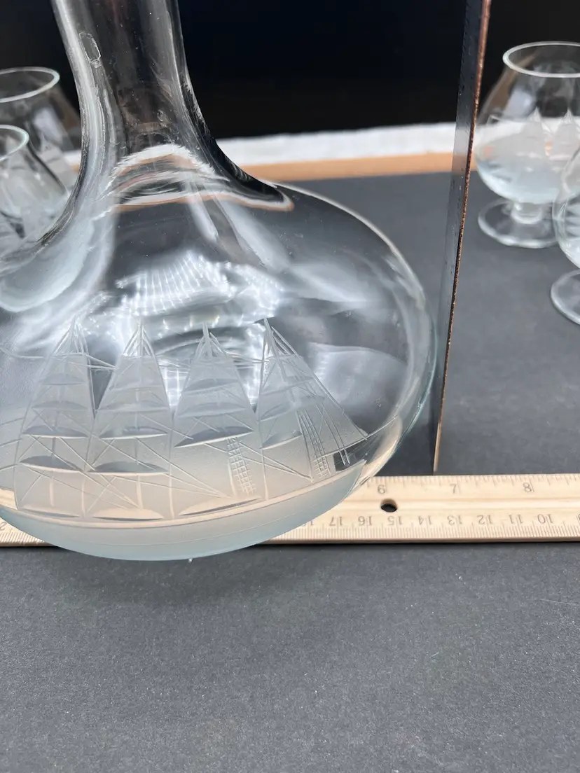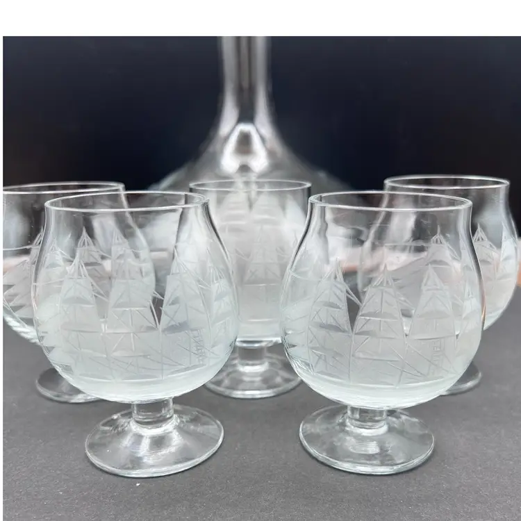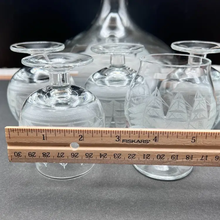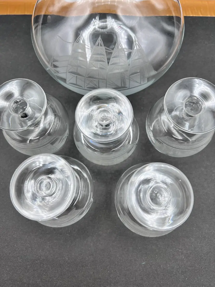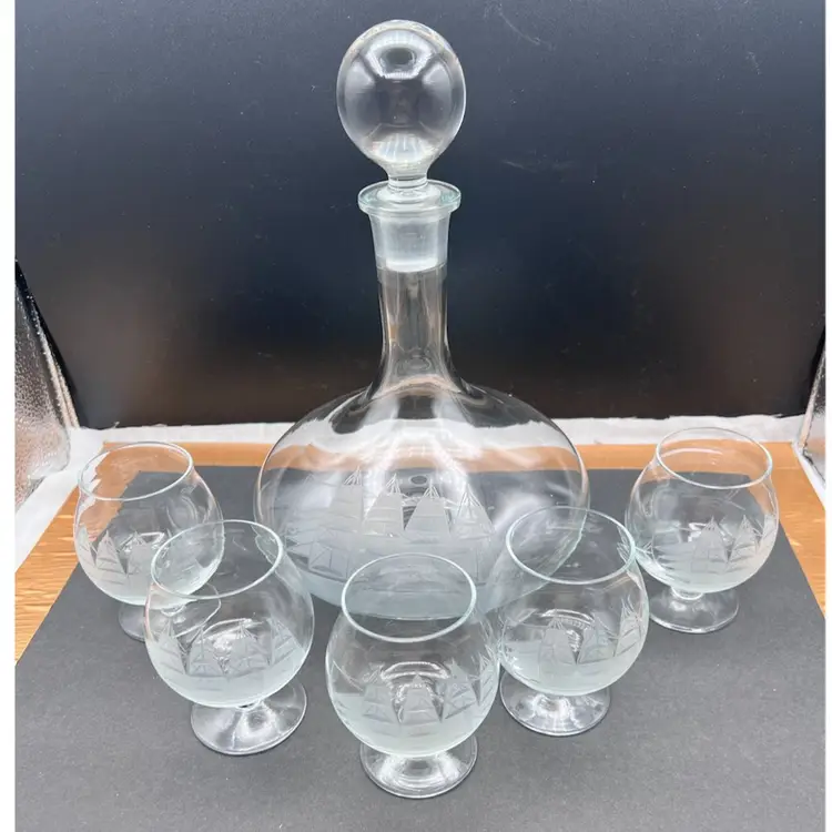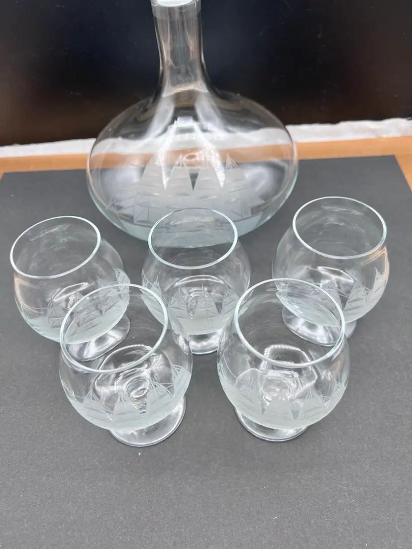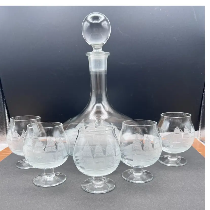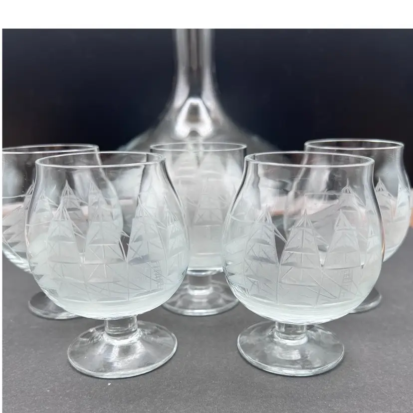 Absolutely Beautiful Set - Vintage Toscany Clipper Ship Etched Blown Glass Liquor Decanter with Stopper and 5 Matching Mini Brandy Snifters/Cordial Glasses In excellent condition - no chips or cracks. Stopper is also in excellent condition Decanter with stopper measures 10 1/2" tall x 6 3/4" wide Each glass measures 3 1/2" tall x 2 1/2" wide with a 2" opening