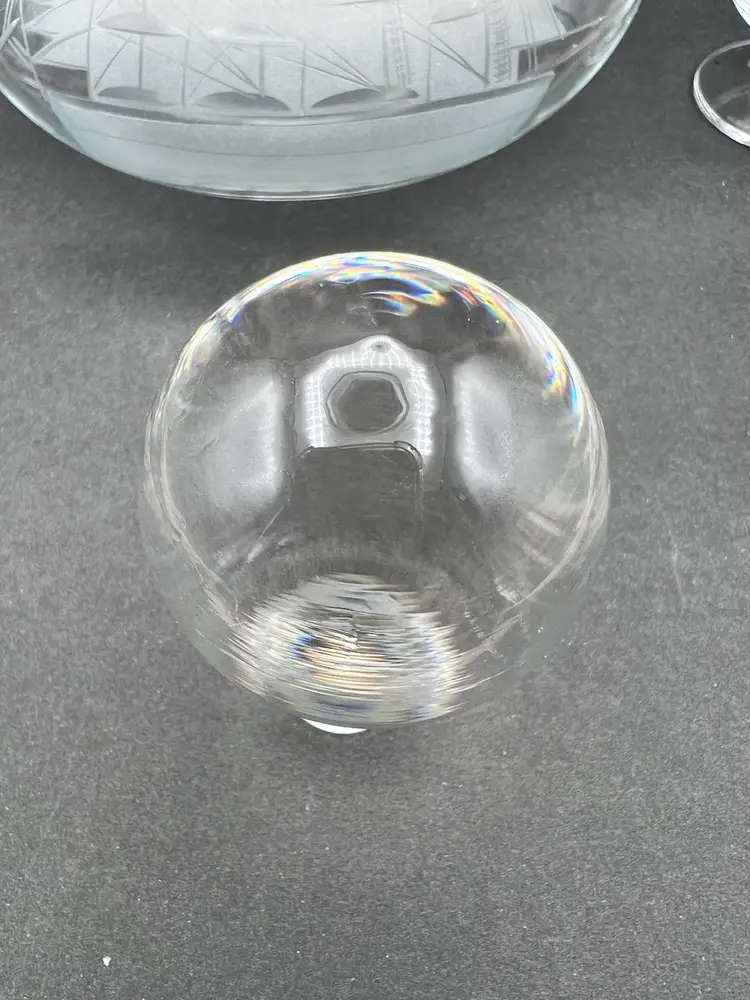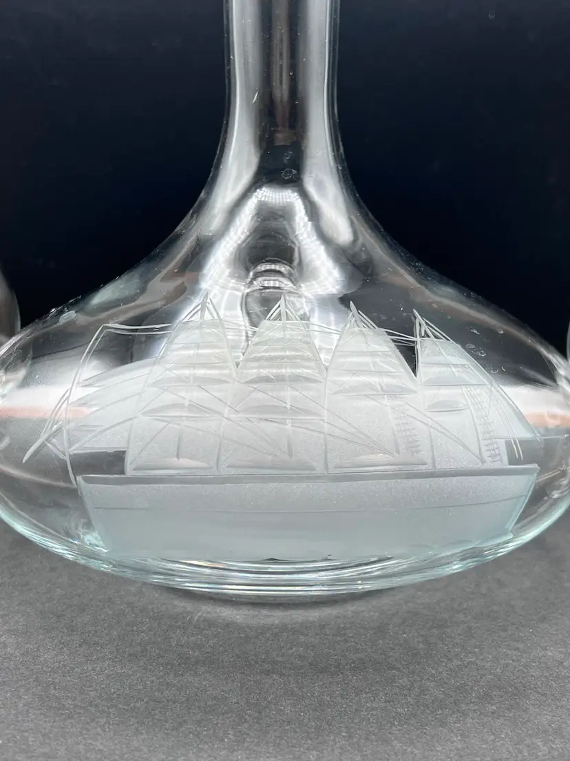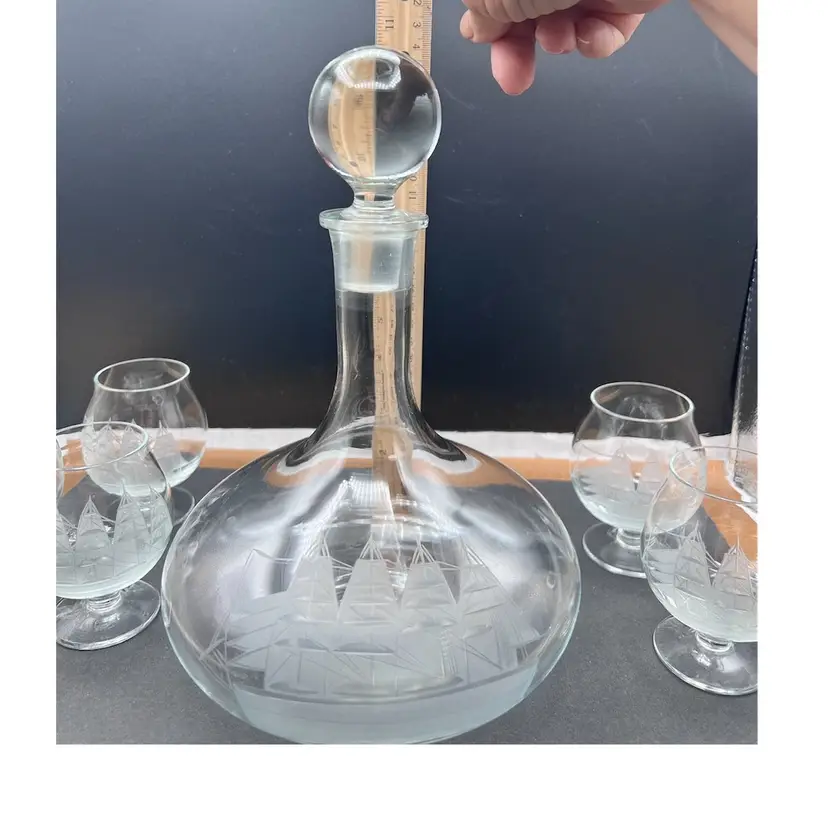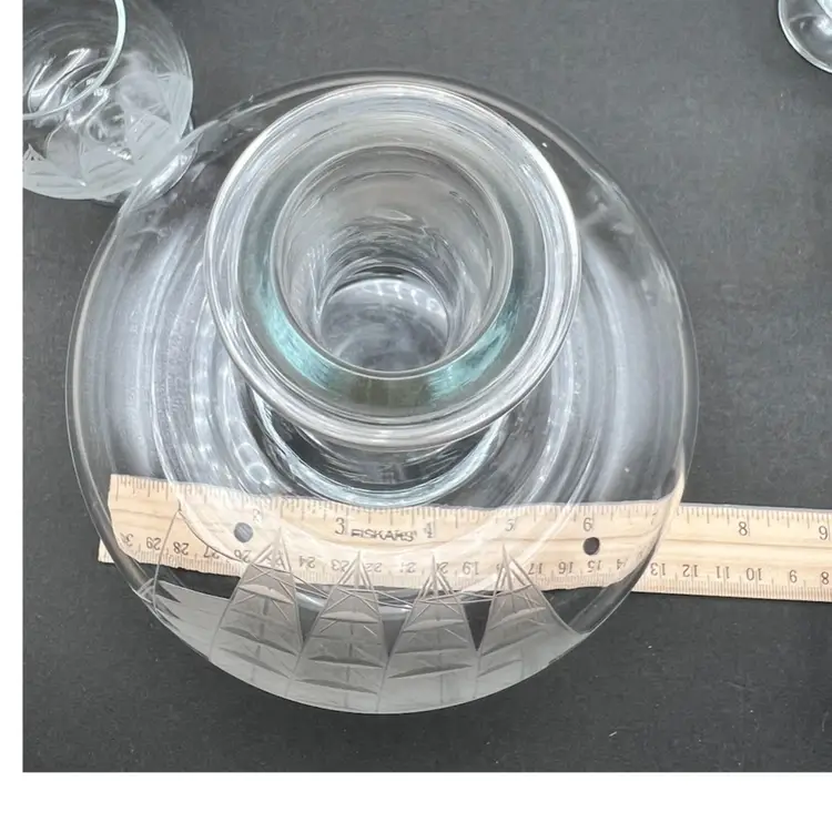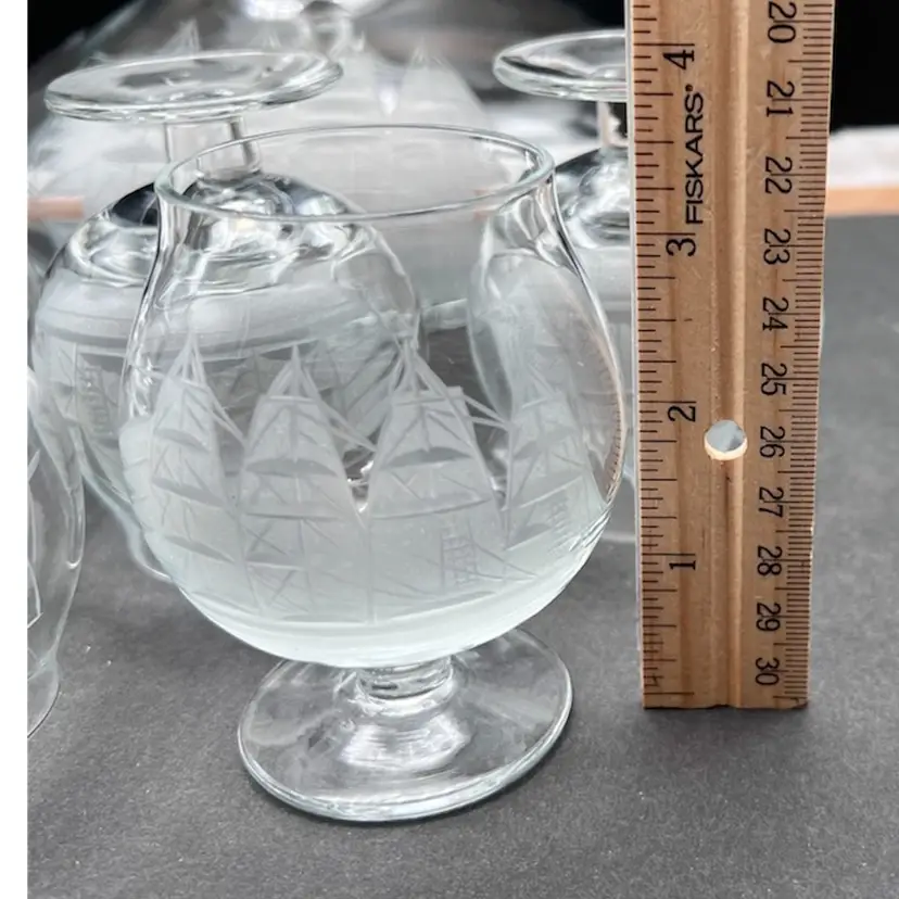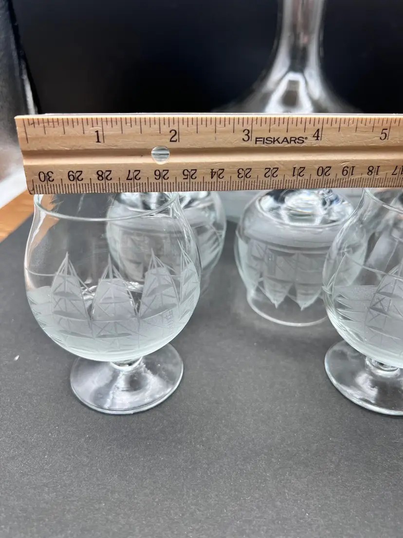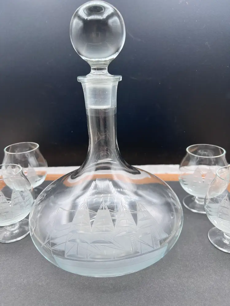 Absolutely Beautiful Set - Vintage Toscany Clipper Ship Etched Blown Glass Liquor Decanter with Stopper and 5 Matching Mini Brandy Snifters/Cordial Glasses In excellent condition - no chips or cracks. Stopper is also in excellent condition Decanter with stopper measures 10 1/2" tall x 6 3/4" wide Each glass measures 3 1/2" tall x 2 1/2" wide with a 2" opening