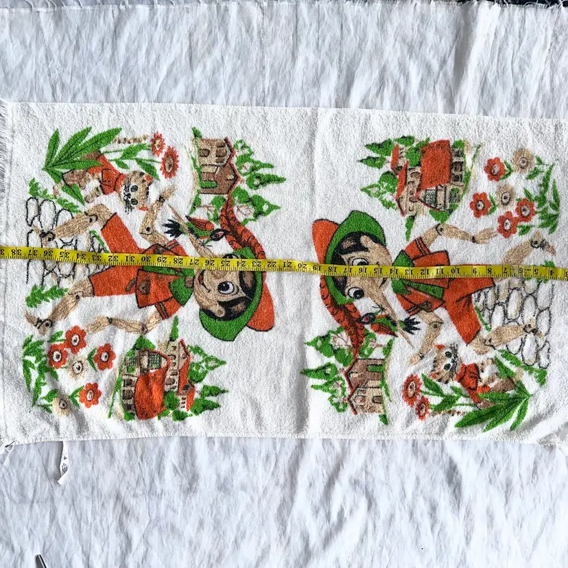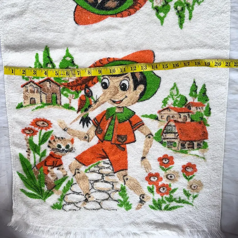 Vintage Towels By FMC All Cotton Pinocchio Bath Towel Made In USA RN# 14923. Overall Good condition for age. See Last Pic Of Faint Staining on Towel (Have Not Attempted To Treat). Smoke Free Home. #vintage #retro #Pinocchio #vintagebath #bathtowel