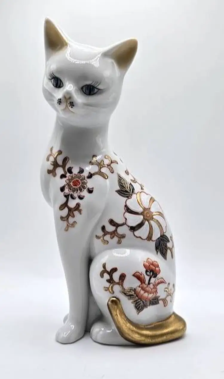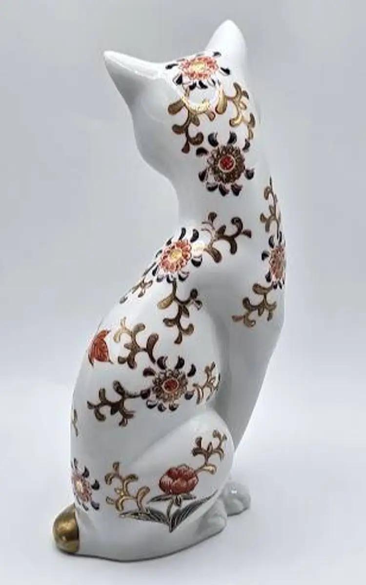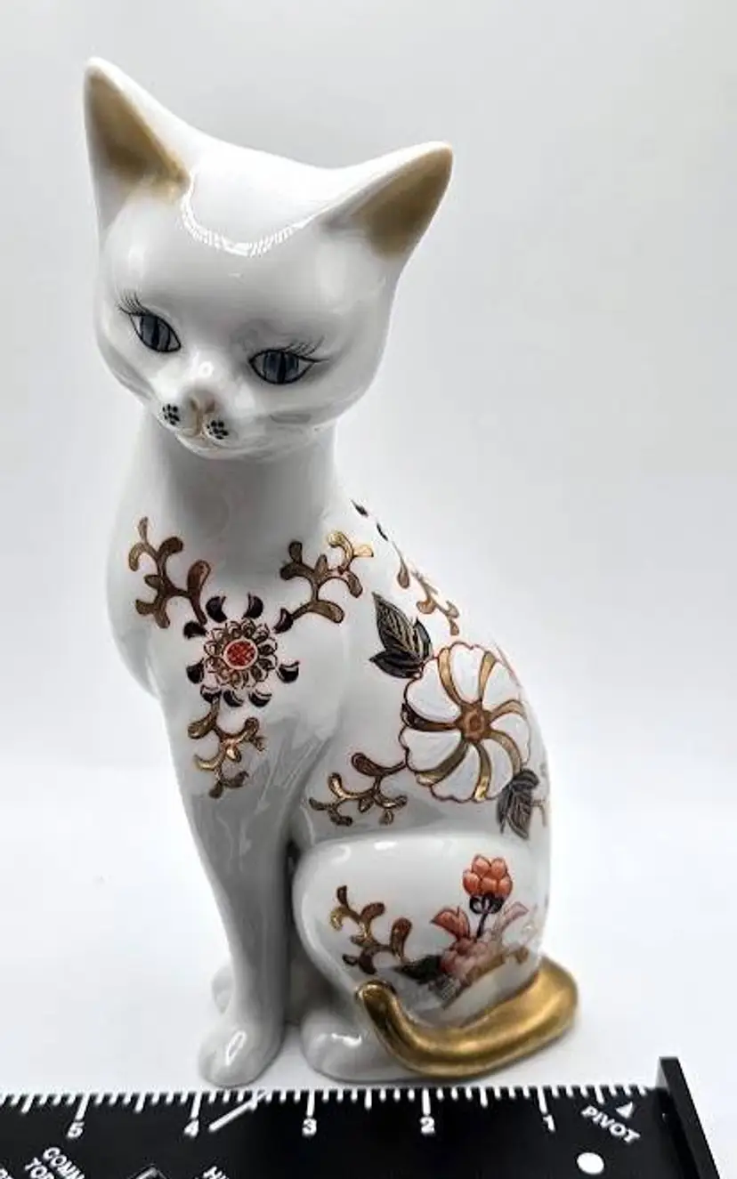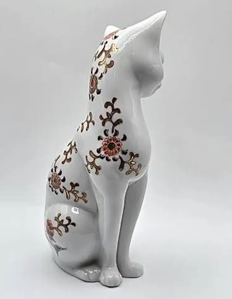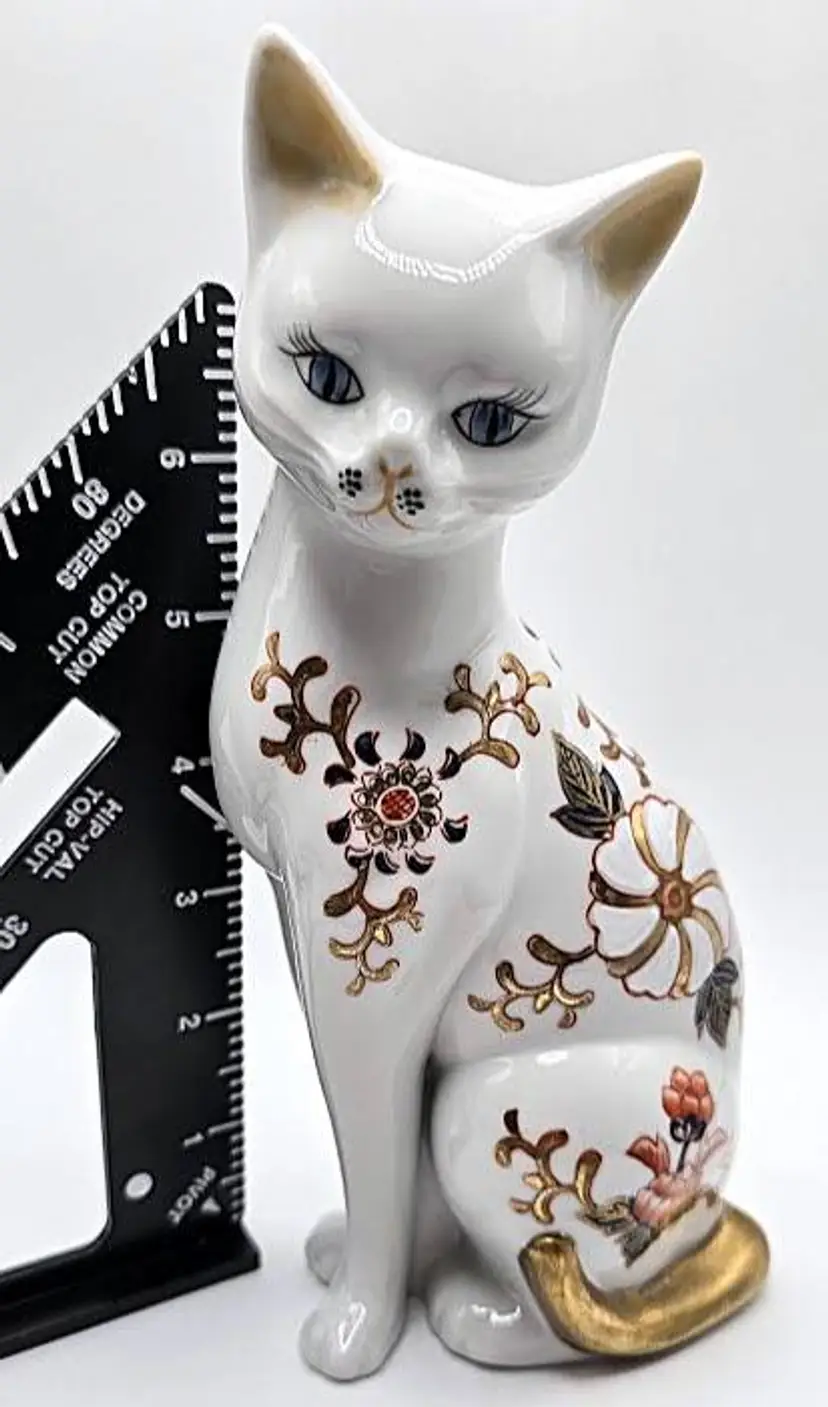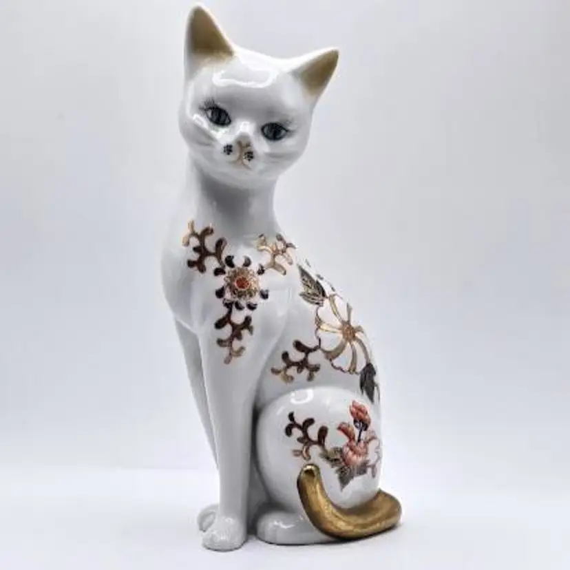 Vintage, hand painted ceramic sitting cat figurine made in Japan by Toyo. Measures 8 1/2" tall x 4" long x 2.5" wide. Pre-owned, excellent condition.