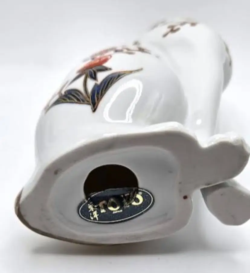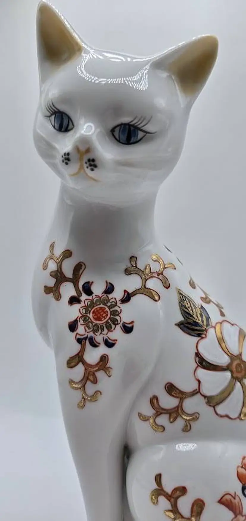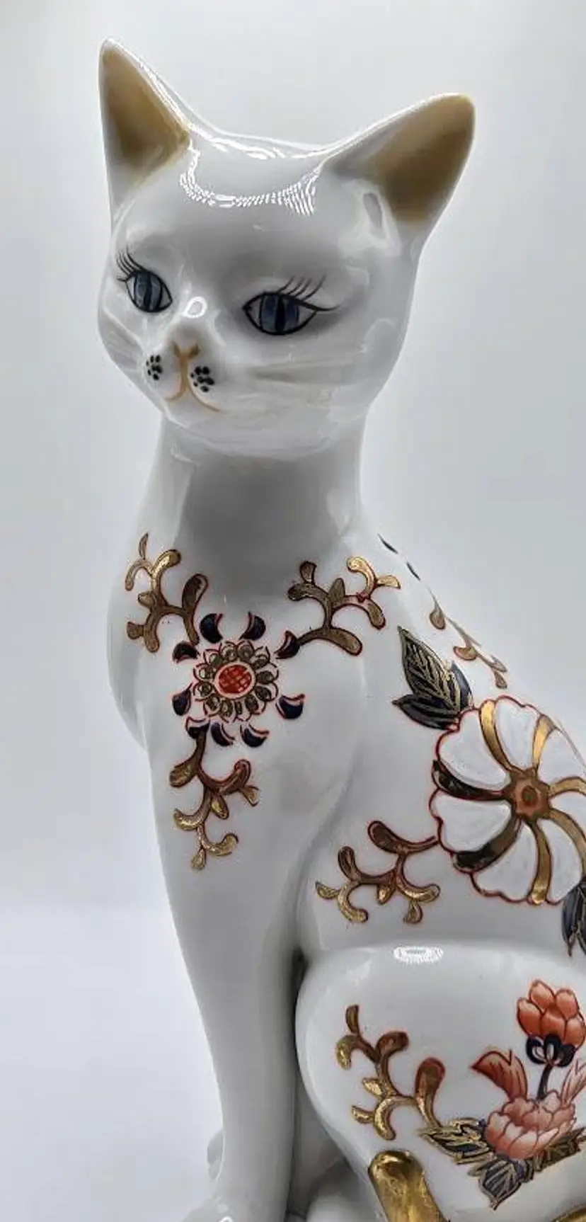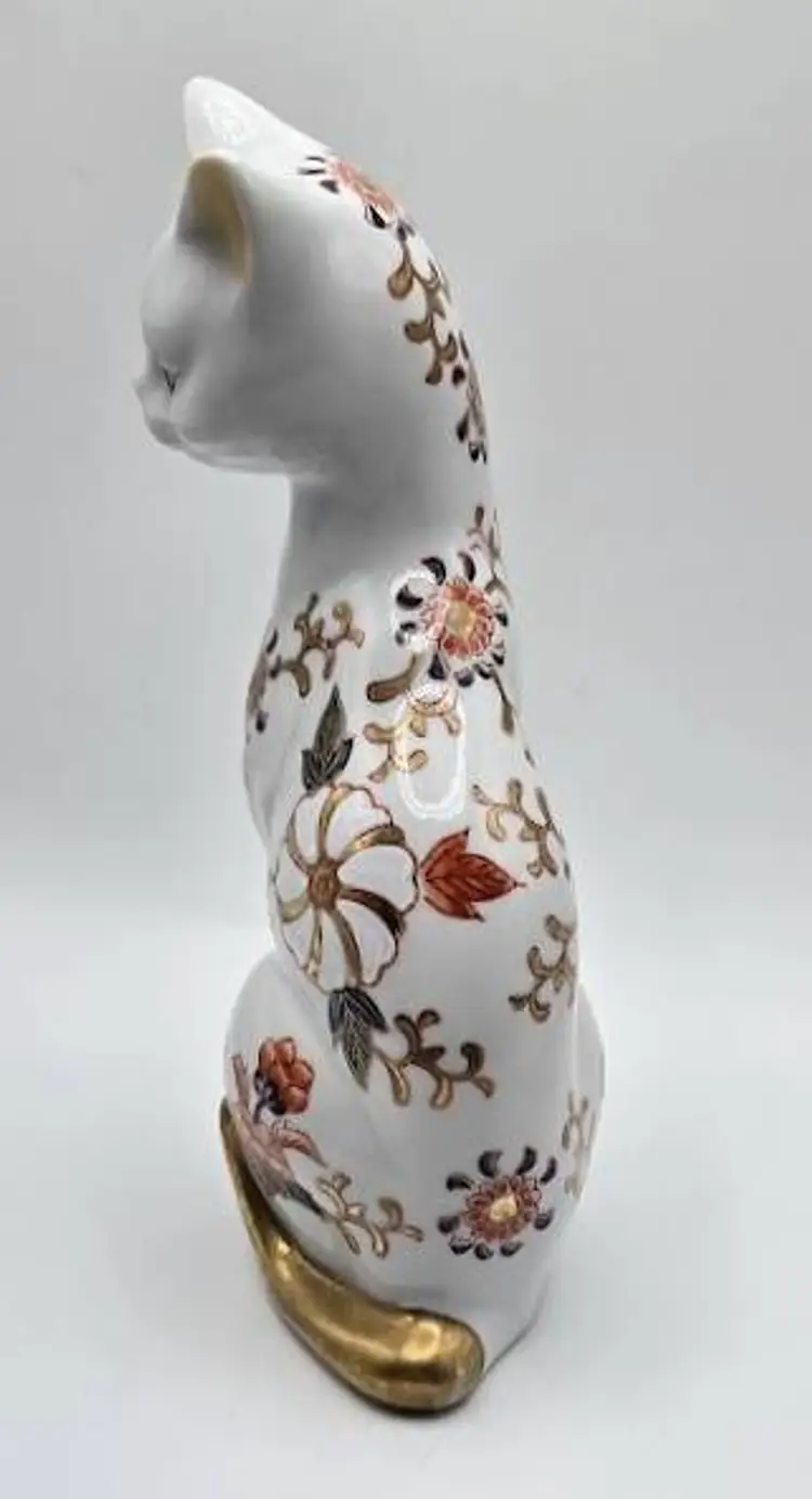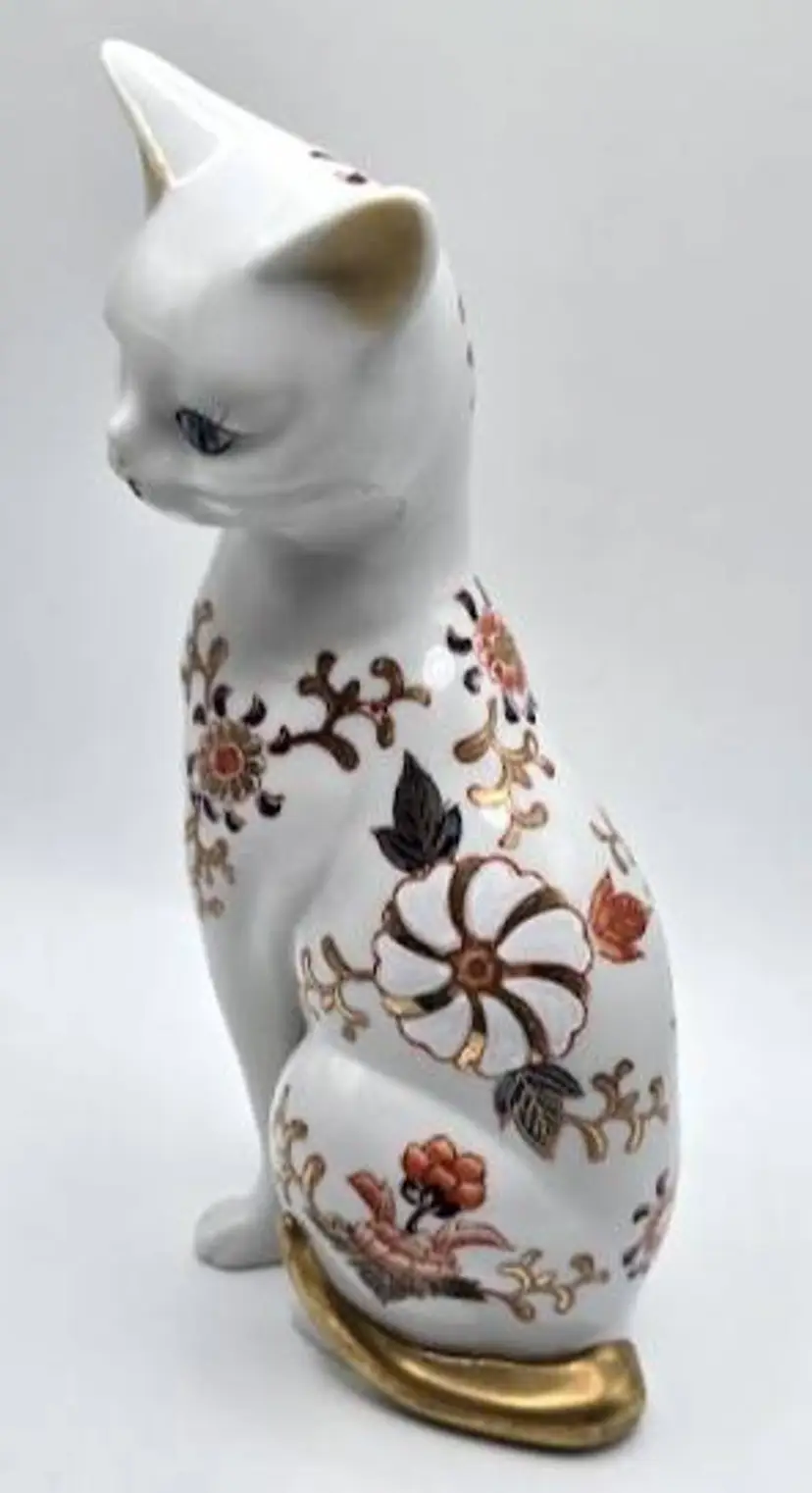 Vintage, hand painted ceramic sitting cat figurine made in Japan by Toyo. Measures 8 1/2" tall x 4" long x 2.5" wide. Pre-owned, excellent condition.