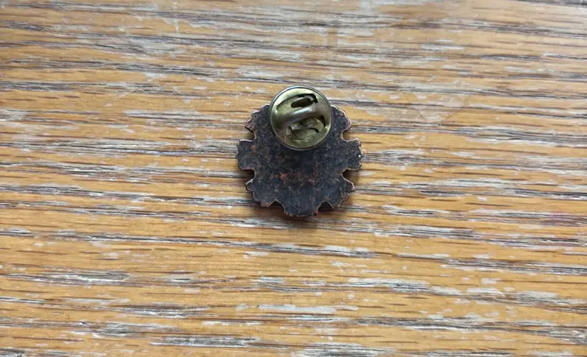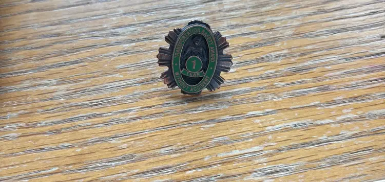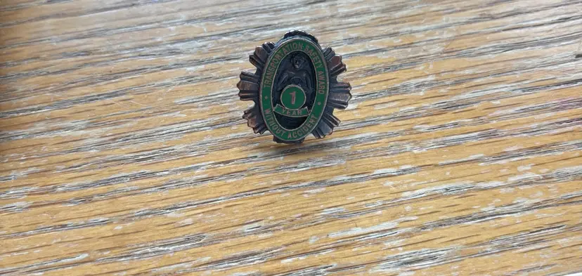 Vintage pin with green and silver colours. Features '1 Year Without Accident' text. Obvious signs of Petina.