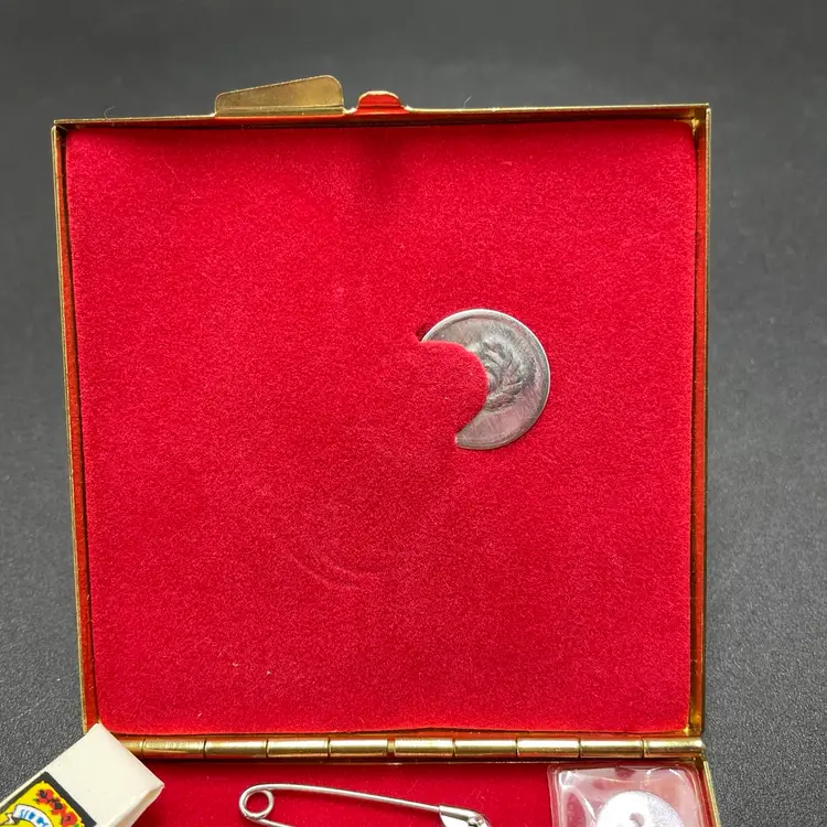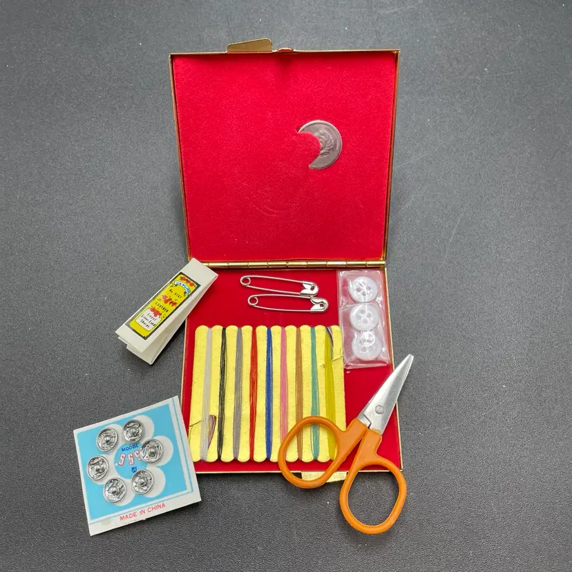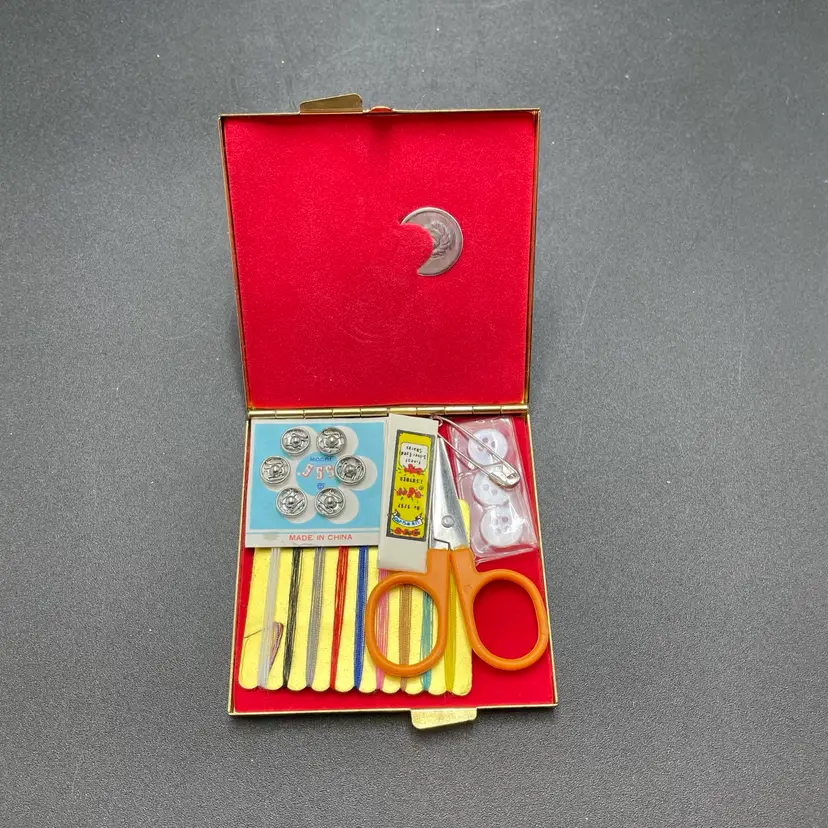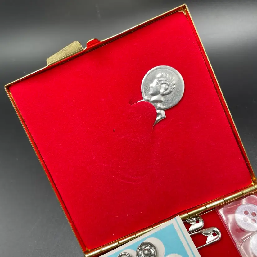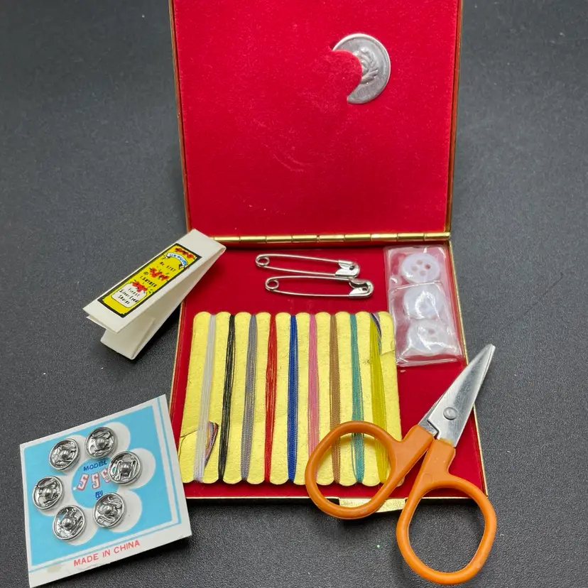This is a vintage pocket travel compact style sewing kit. The case itself is metal, while the top is smooth plastic. The set includes needles, thread, safety pins, buttons, needle threader and small scissors. Measures approximately 3" x 3". No major flaws.