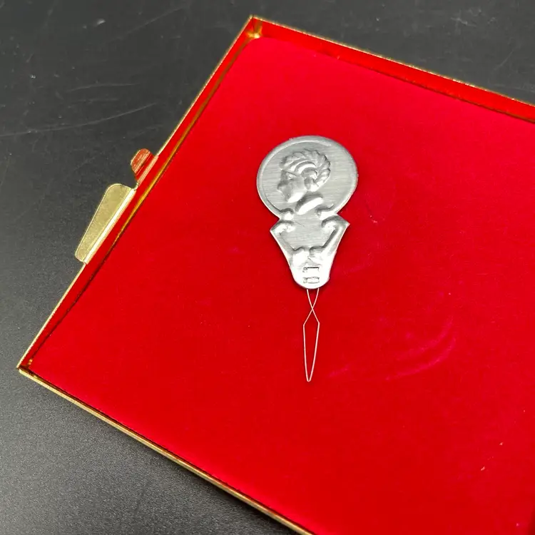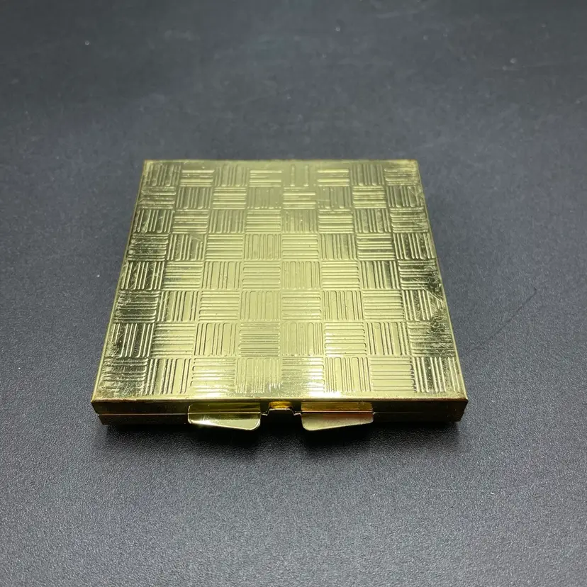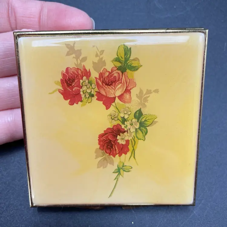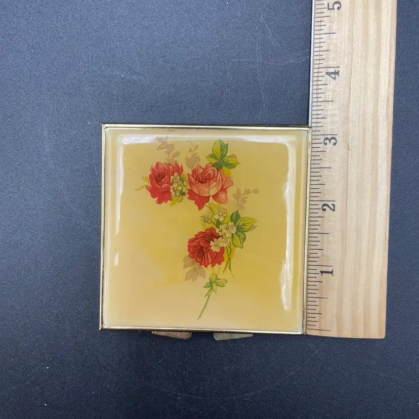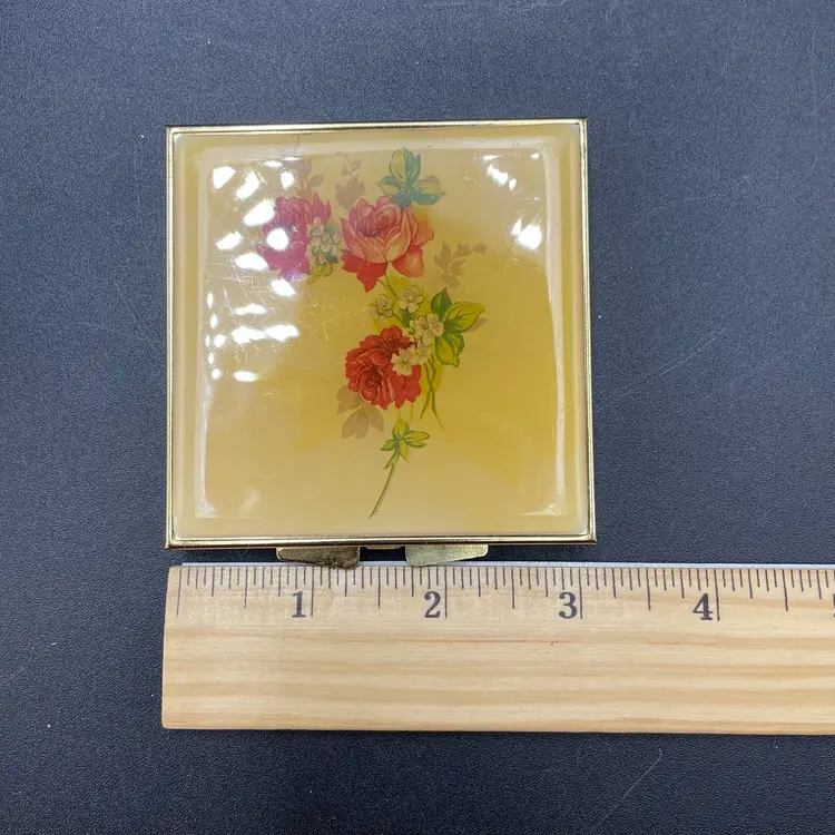 This is a vintage pocket travel compact style sewing kit. The case itself is metal, while the top is smooth plastic. The set includes needles, thread, safety pins, buttons, needle threader and small scissors. Measures approximately 3" x 3". No major flaws.