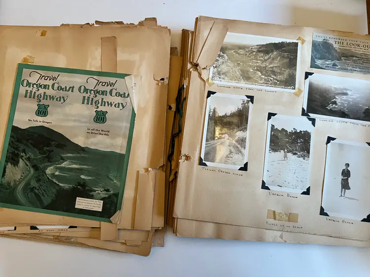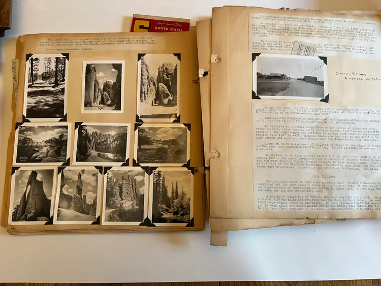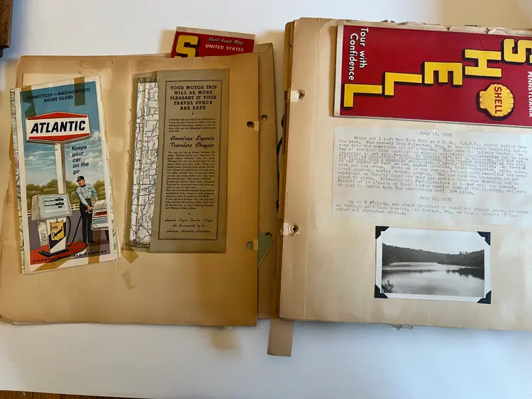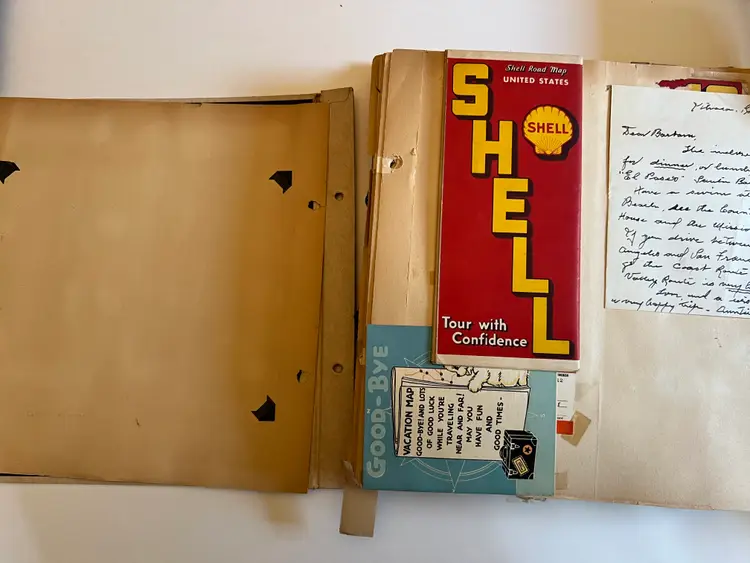 Filled with all sorts of fun ephemera- maps, photos, letters, cards, typed paper, brochures, stickers and more.