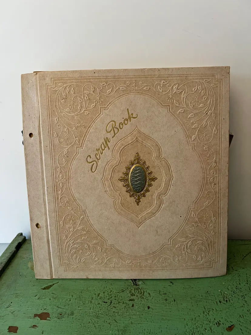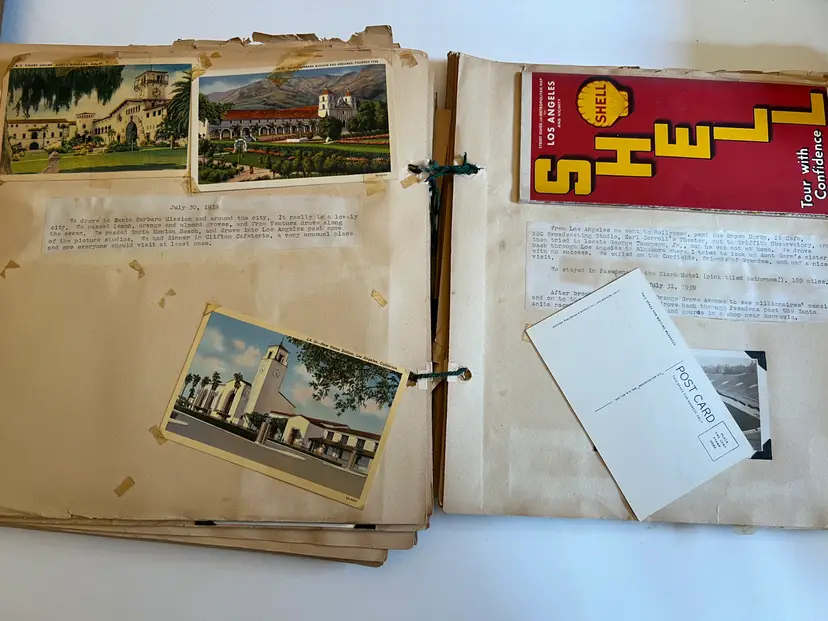 The scrapbook is worn. The cord keeping the covers together is no longer attached and is not included. The glue used to create the book has failed in many places and papers are coming loose. It looks like most are still tucked into the book where they are supposed to be. The cover has wear and the pages are aged. Lots of paperwork is loose or was never pasted in. A pretty neat part of history. It is for sure an interesting flip through.
