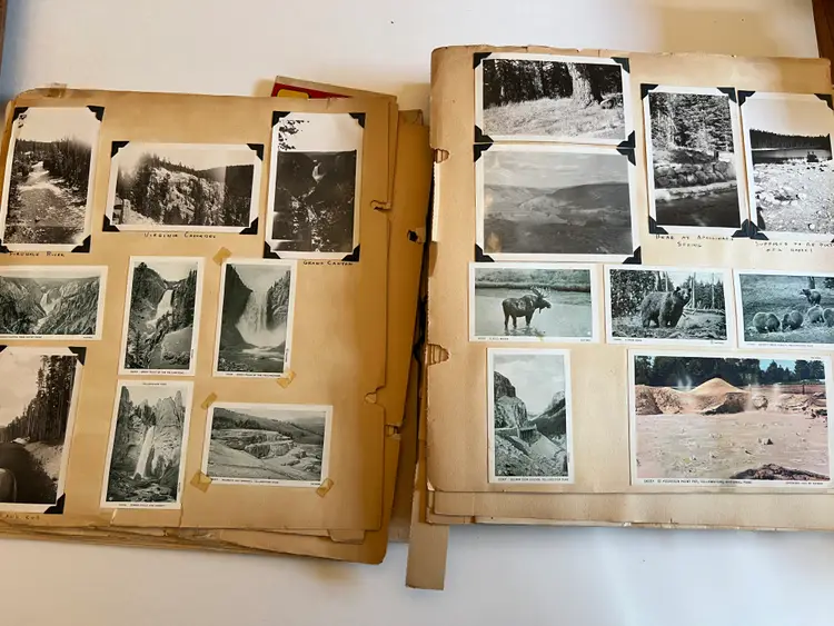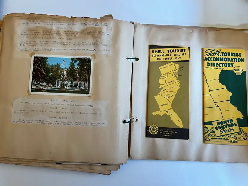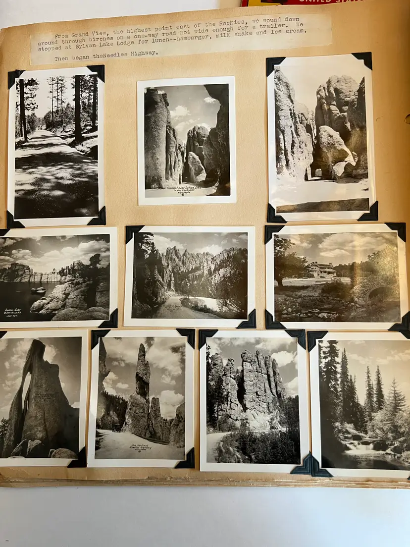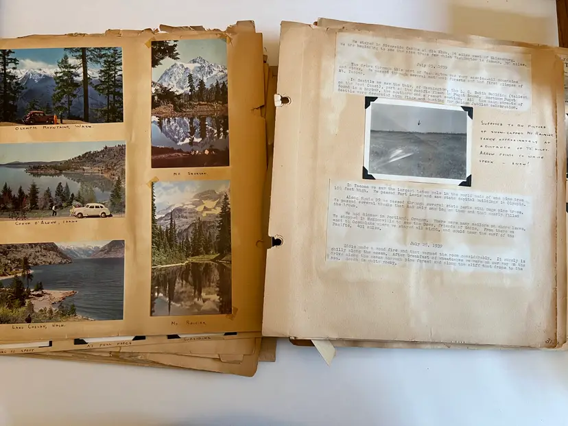 Vintage travel scrapbook from the 1930s. The cover measures 12.75" x 12.25" and its about 3" thick at the widest. The first page commemorates the travels of Edna and Barbara "Westward Ho with Edna Kurdt and Barbara Titus. July 14-August 10 1939. Distance- approximately 9,000 miles.
