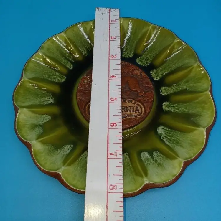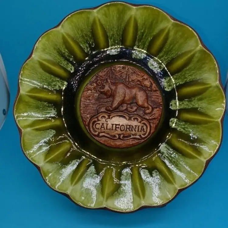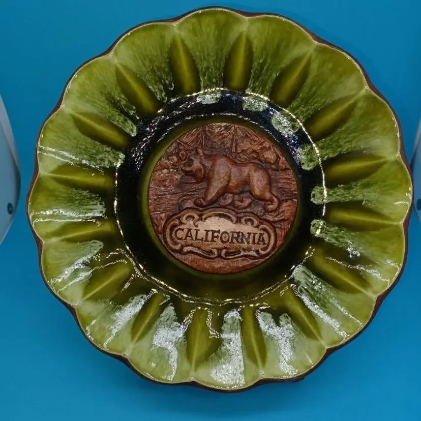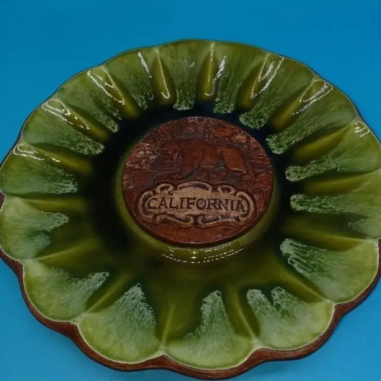 Vintage Treasure Craft 1960s Collector Plate California with a bear in the middle nice green glazed in great vintage condition no chips cracks or crazing Marked Treasure Craft Made in America on back measures 8 in across deceptively heavy. Please see all pictures as they're the best description all items from a smoke-free home with pets experienced fragile shipper