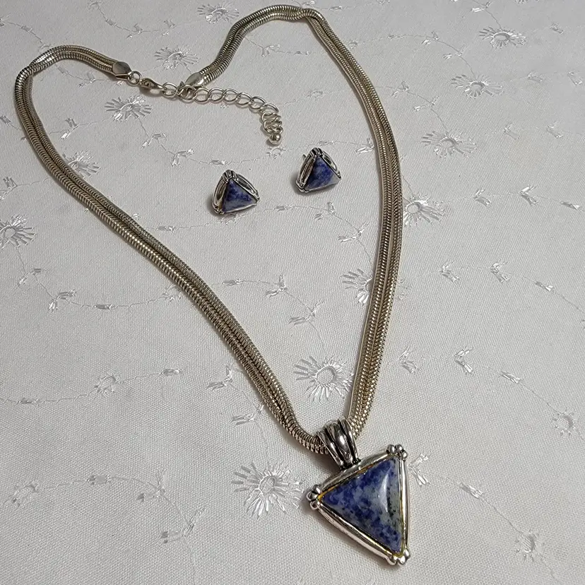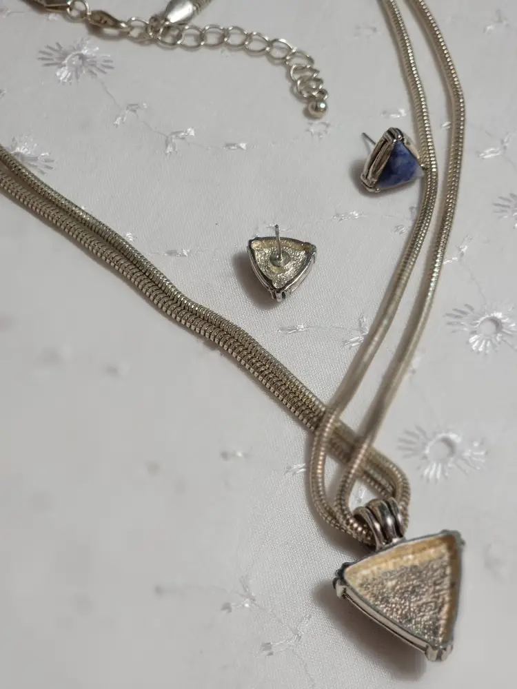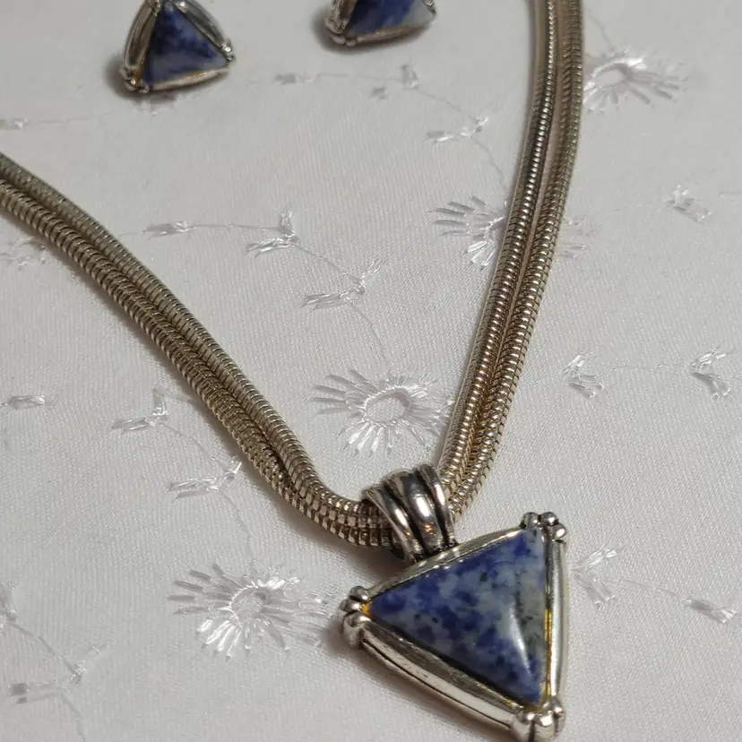 Elevate your style with this vintage necklace and earrings set featuring striking triangular blue stones. The necklace boasts a sturdy chain, while the matching earrings complete the look. Perfect for any occasion. 18" and adjustable to 20 1/2"