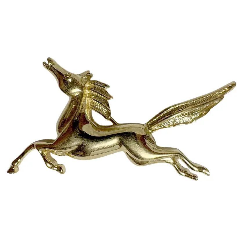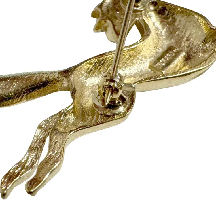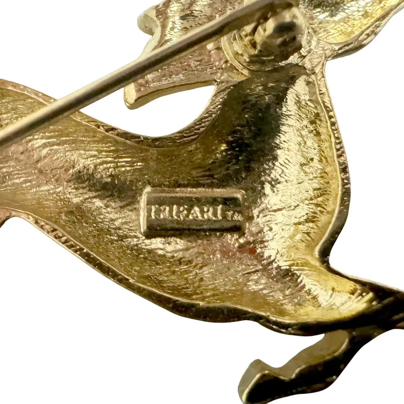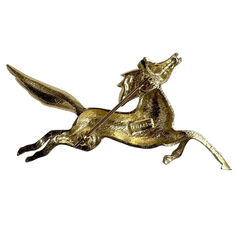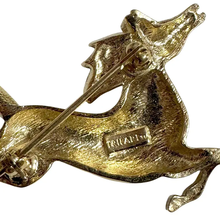 Vintage Trifari Galloping Horse Brooch Gold Tone Metal Textured Mane And Tail Functioning Clasp 1980-1999 Trifari Mark On Back 2 1/4 x 1 1/4