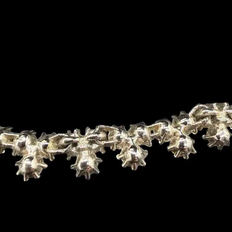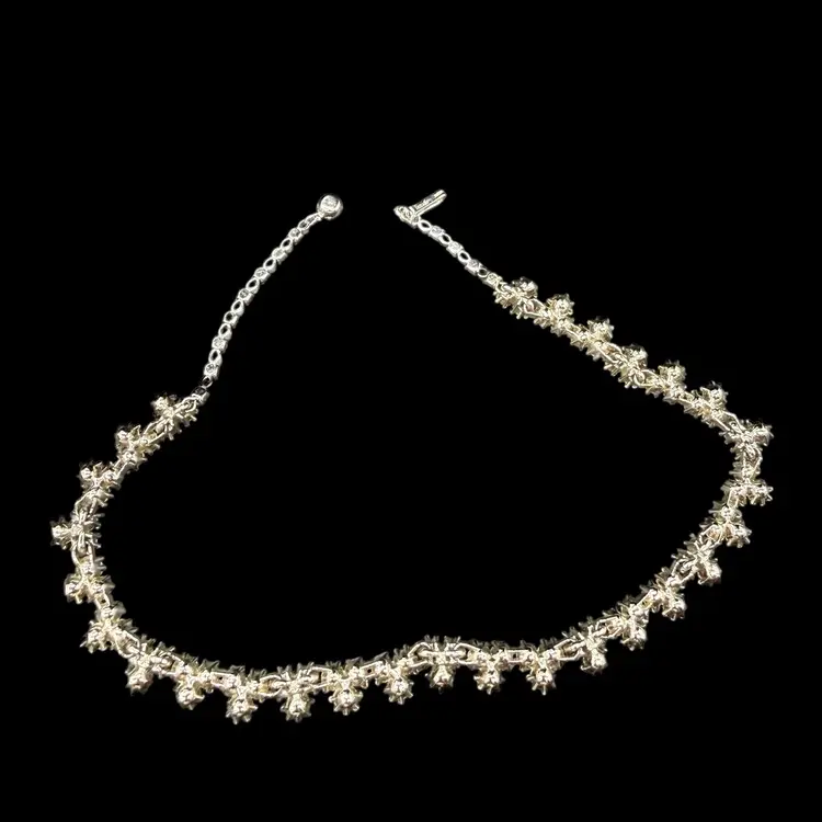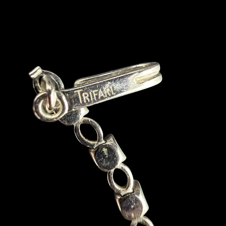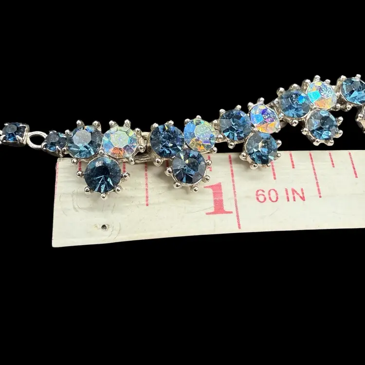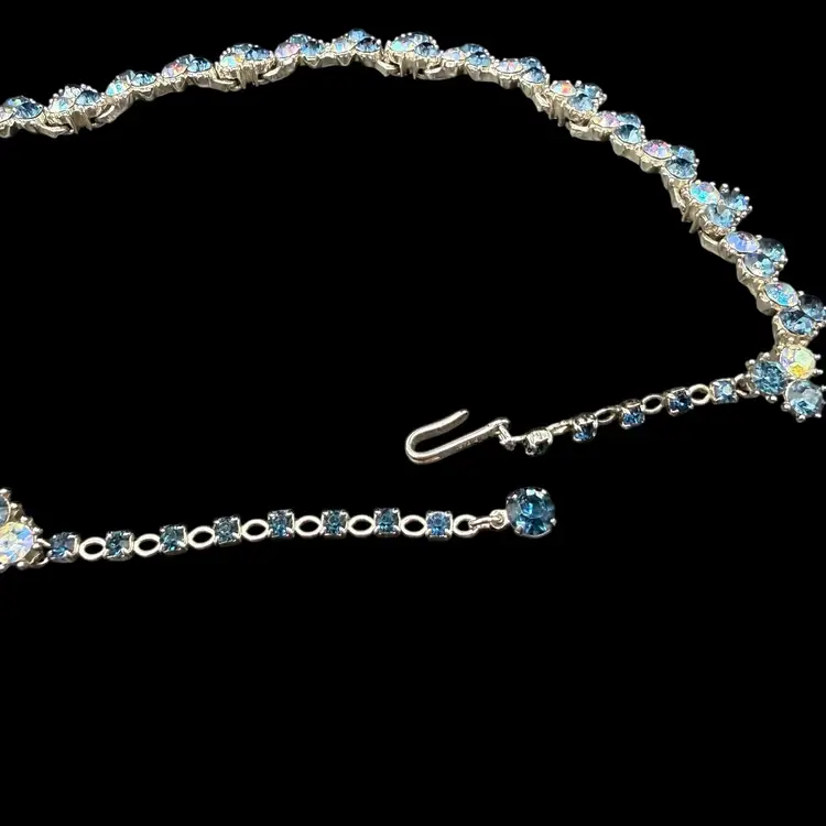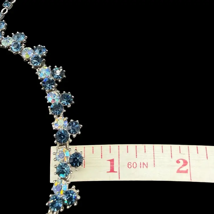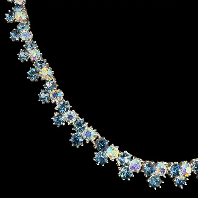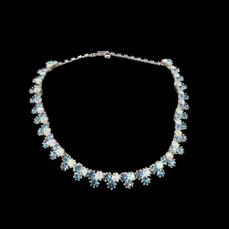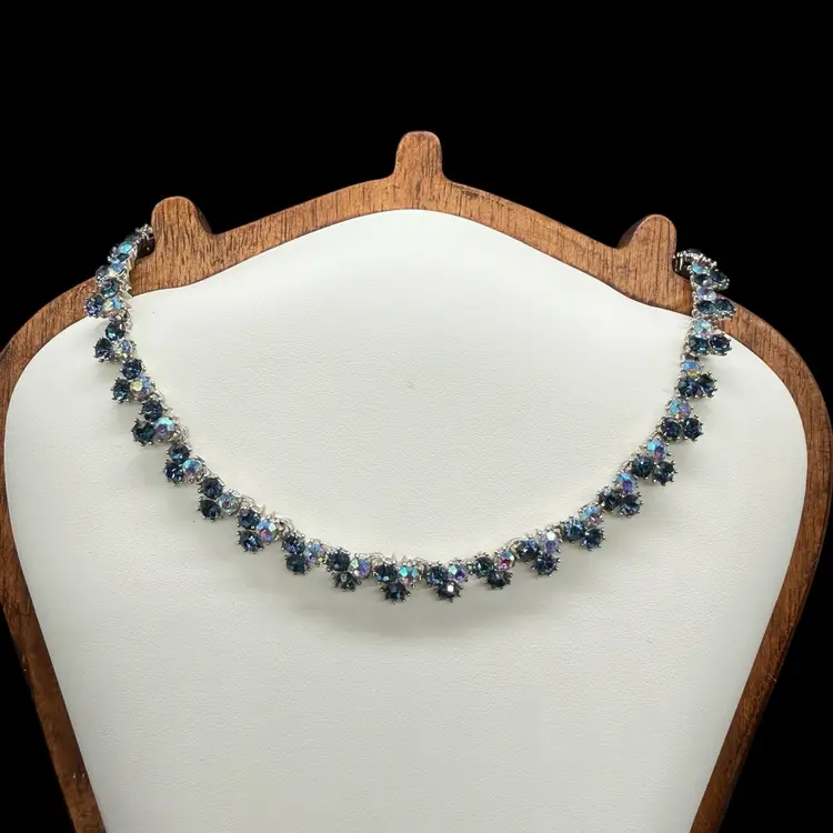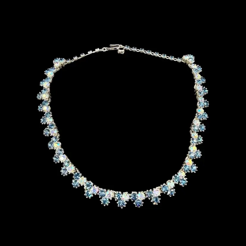 The Vintage Trifari Silver-Tone Dark & Light AB Blue Rhinestone Necklace from the Mid Century Modern era is a stunning piece of jewelry signed by the renowned brand Trifari. This choker-style necklace features clustered blue rhinestones in a prong setting, with a total length of 15.5 inches. The elegant design and timeless beauty of this piece make it a perfect addition to any collector's vintage jewelry collection, showcasing the artistry and craftsmanship of the mid 20th century.