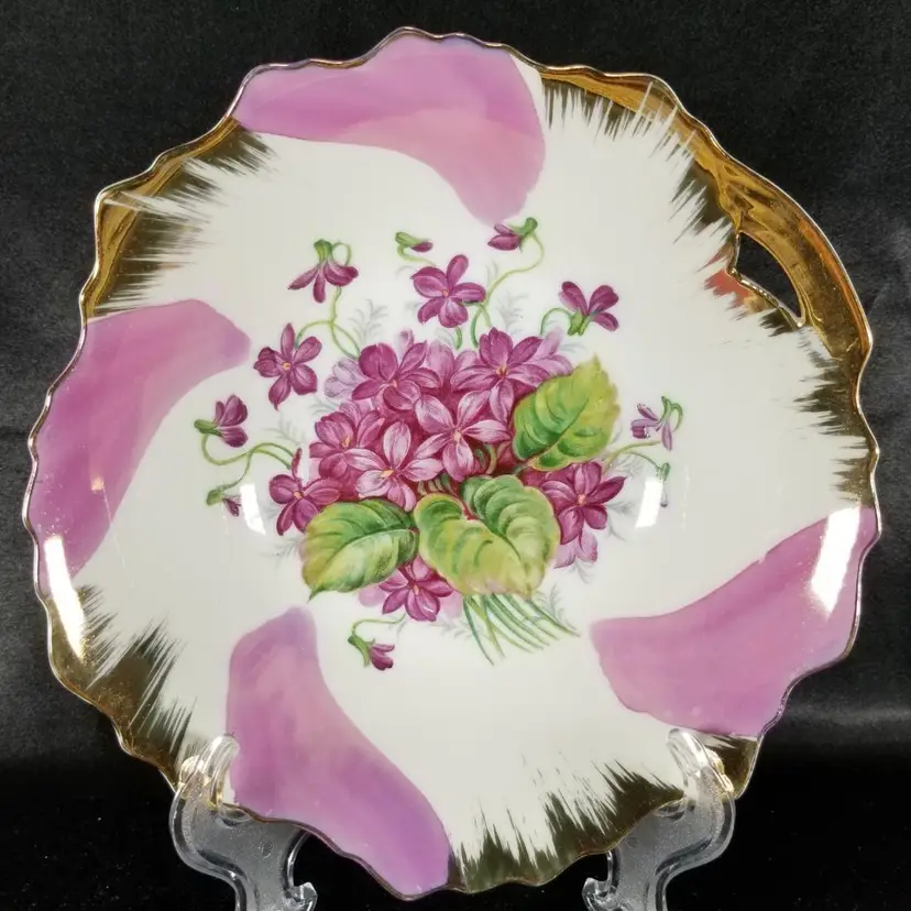 Vintage Trimont Ware Violet Bowl is 7 1/2" x 2 1/4" tall. This beautiful bowl features pink swatches and gold trim with a large splash of violets in the center. It has a soft luster finish and the Trimont sticker. No chips, cracks, or repairs. Please view pictures and feel free to ask questions.