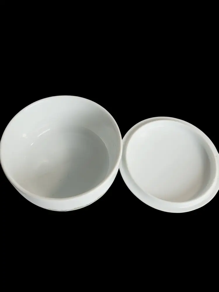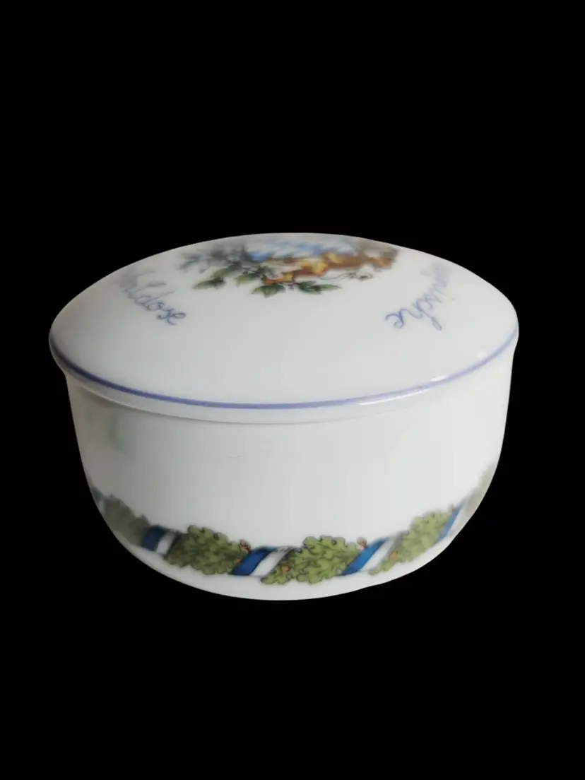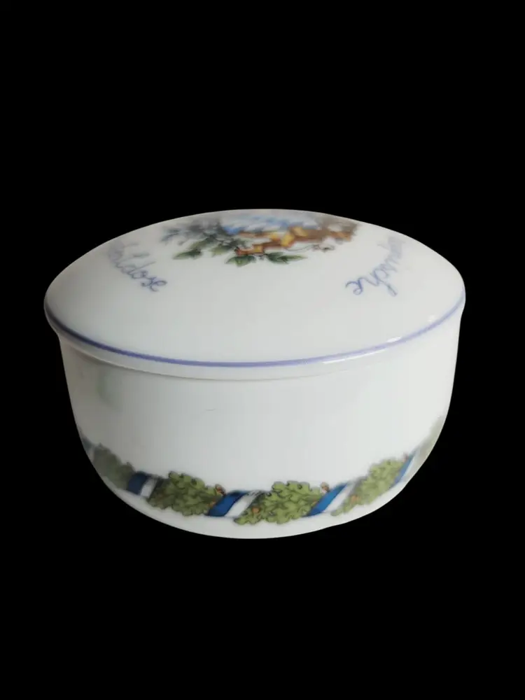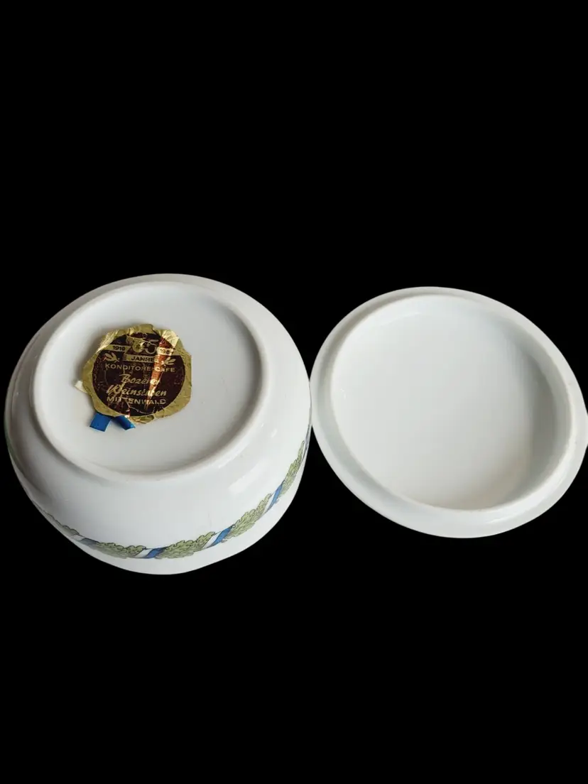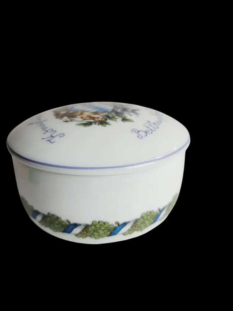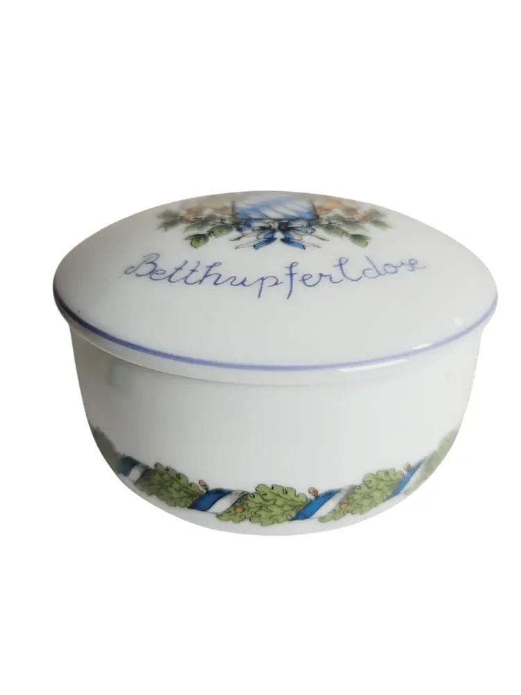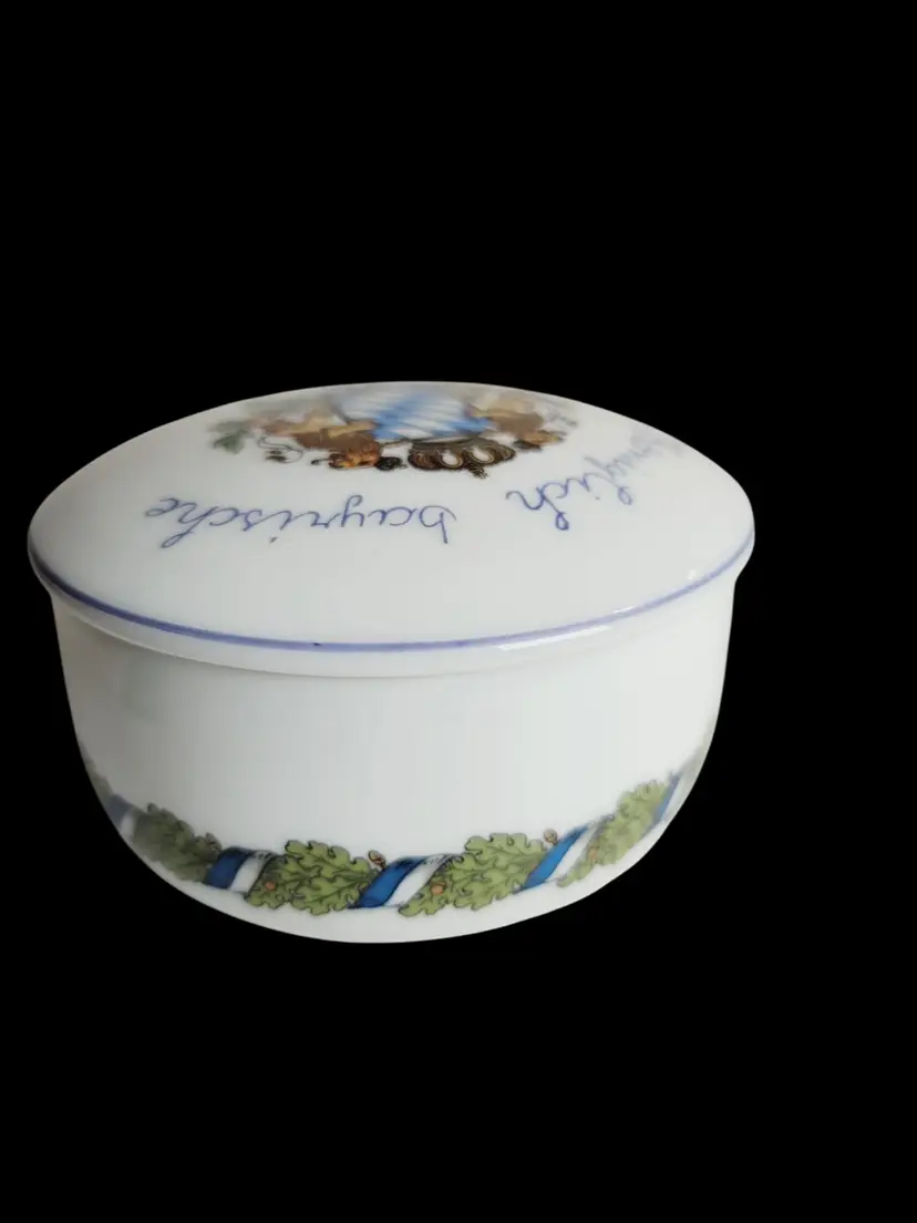 This porcelain trinket box epitomizes Bavarian craftsmanship with its intricate design and detailed artwork. The lid showcases traditional motifs, adding a touch of heritage to your collection. It's perfect for storing small treasures or enhancing your decor with a piece of history.