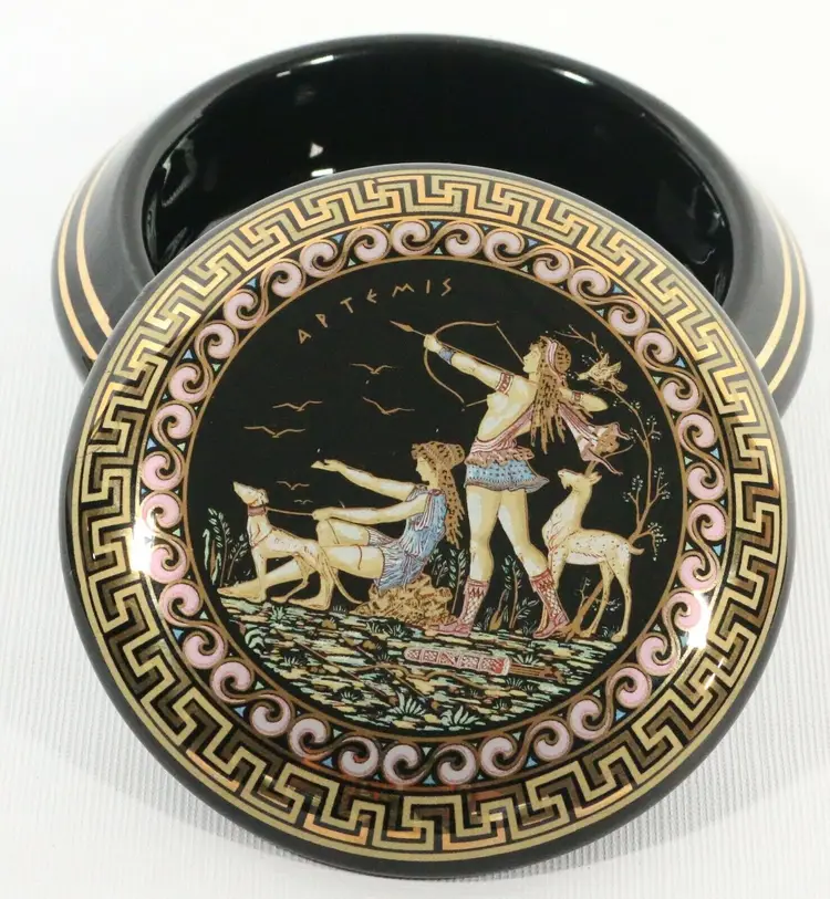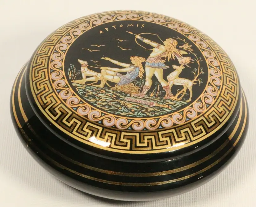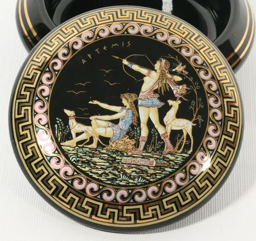 This item is in nice vintage condition. Measures approximately 5" across and 2" high. Beautiful detail in the Greek Goddess Aptemis depicted with 24K gold detail! (Inside lip has what look like a "mark" but is not a defect, only glaze color variation.) PLEASE VIEW ALL PHOTOS AND USE THE ZOOM FEATURE AS THEY ARE PART OF THE DESCRIPTION. Our vintage paper items may (or may not) have one or some of the following: corner wear, foxing or yellowing of pages, may have writing or markings/stains, loosening of pages or cover, tears or missing pieces, may have a slight old paper/musty scent . Please inquire if you require more information on condition or otherwise of this item prior to purchasing.