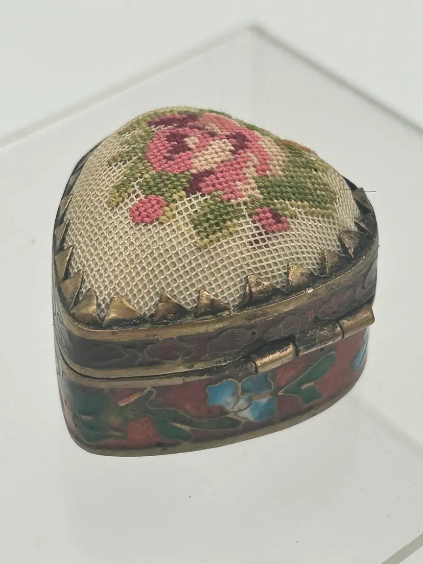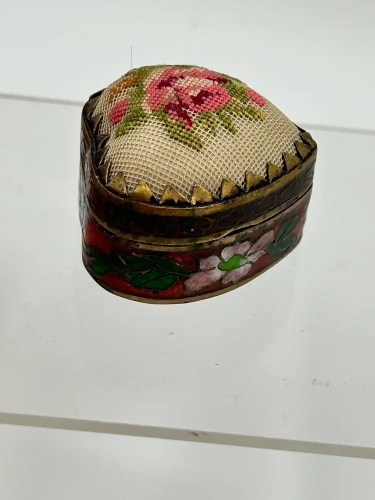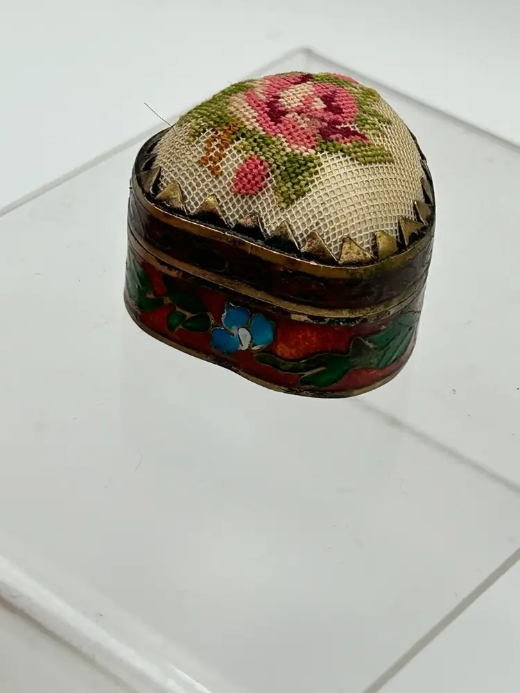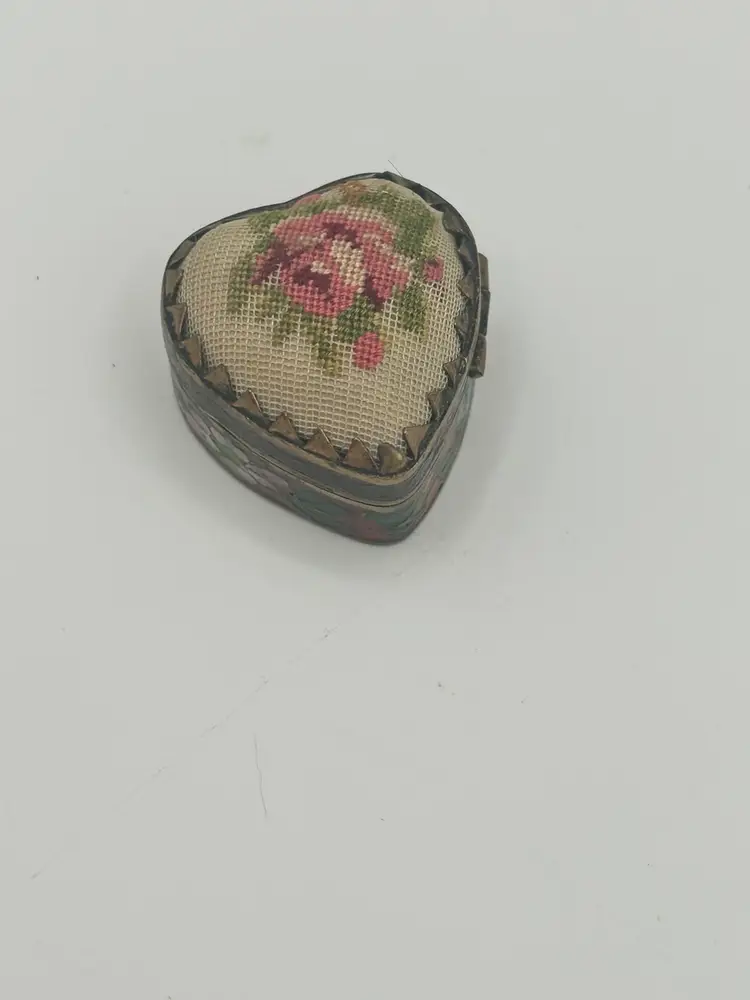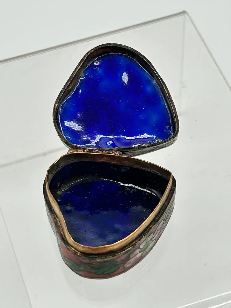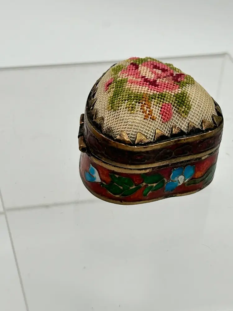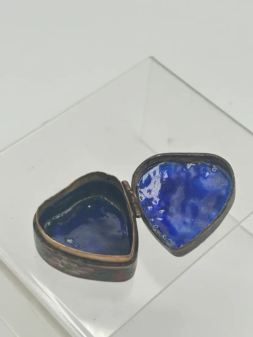 This vintage trinket pill gift box is a charming decorative collectible with a floral pattern and a heart shape. Handmade with a brass material, it is a small original piece that can be used for all occasions. The multicolored design adds a touch of elegance to any space, making it a unique and intricate addition to any collection.