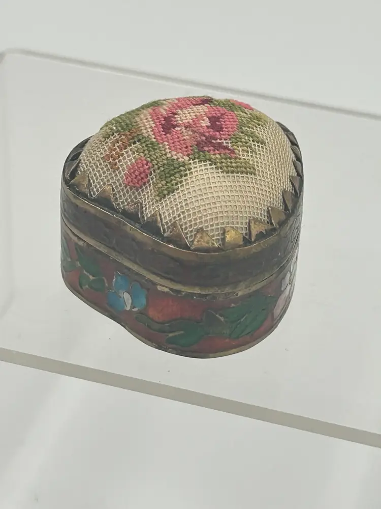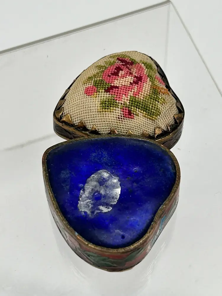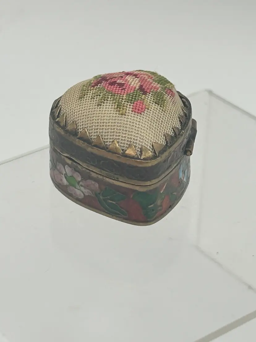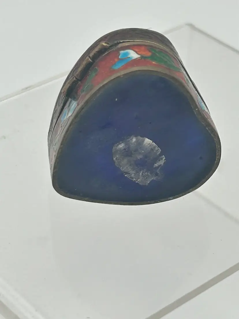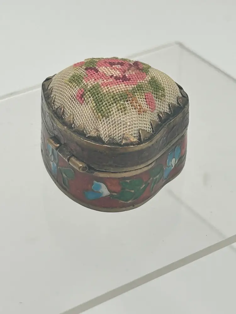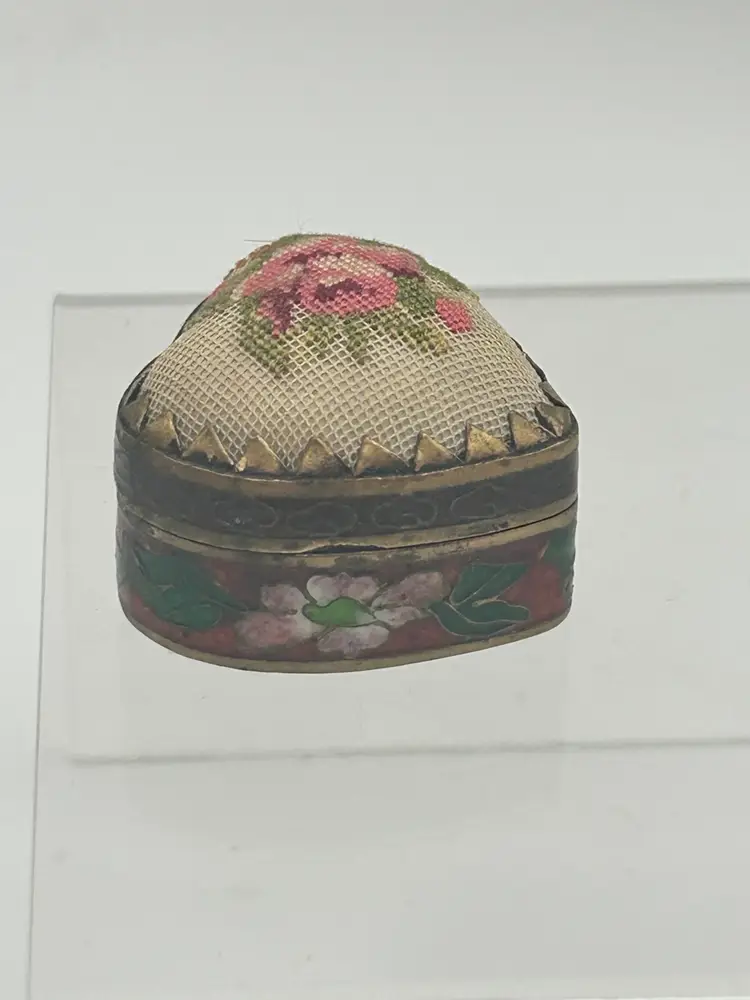 This vintage trinket pill gift box is a charming decorative collectible with a floral pattern and a heart shape. Handmade with a brass material, it is a small original piece that can be used for all occasions. The multicolored design adds a touch of elegance to any space, making it a unique and intricate addition to any collection.