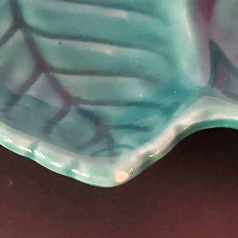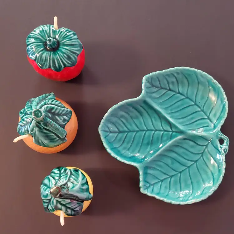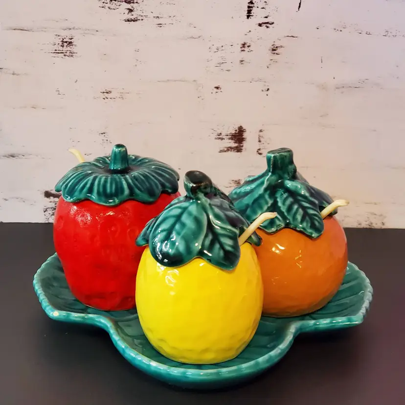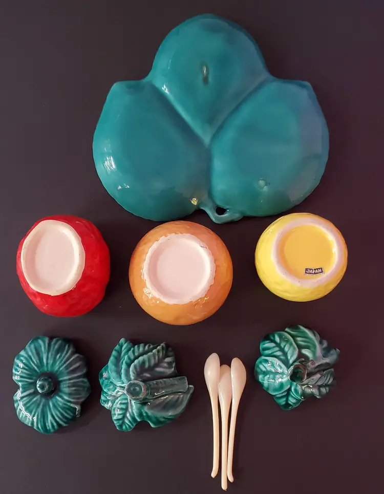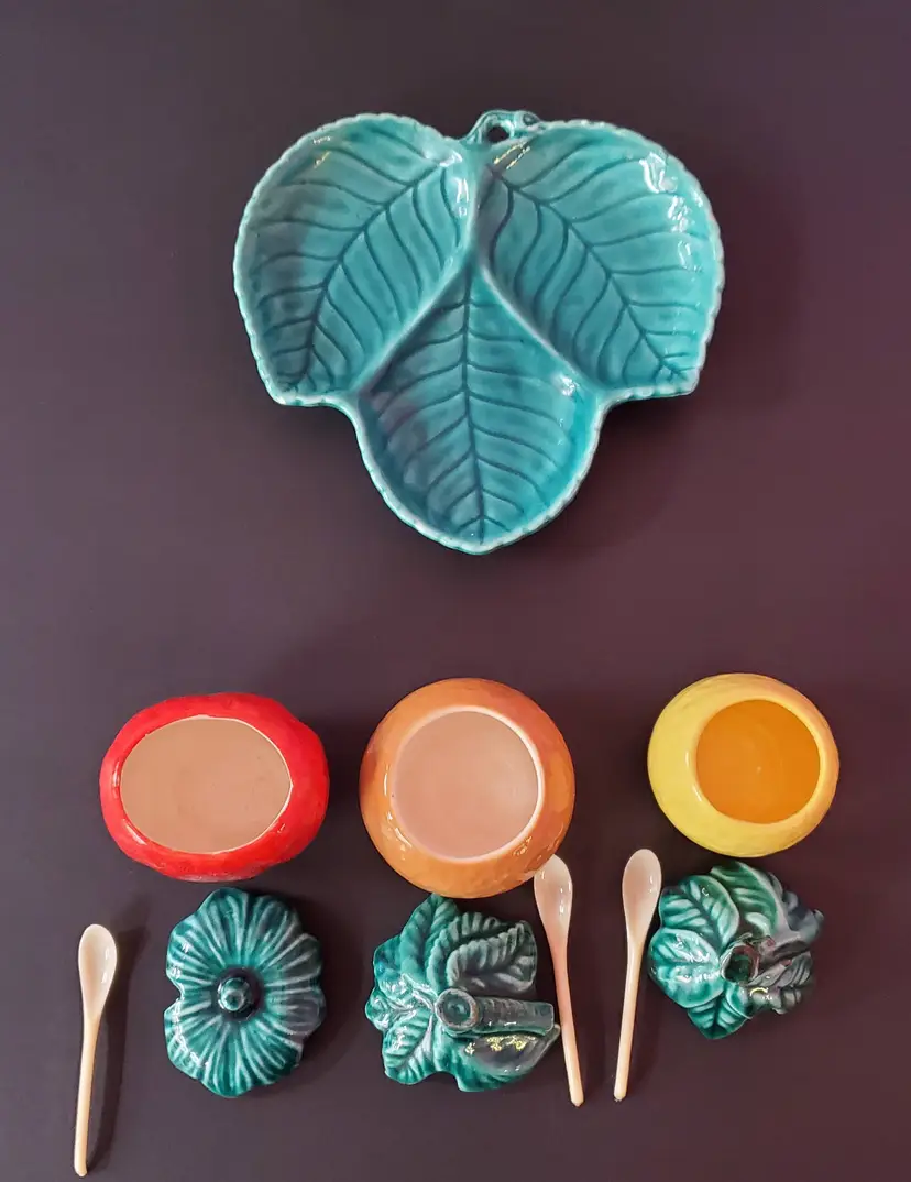 Vintage Trio Condiment Jar with Leaf Undertray (1950s - 1960s). Trio Condiment Jar with Leaf Undertray is in good used vintage condition with no cracks and only a flea bite on the underside of 1 lid and on 1 leaf, please see pictures. Includes all 3 spoons. Tray measures about 6" across. Jars measure about 2.5"