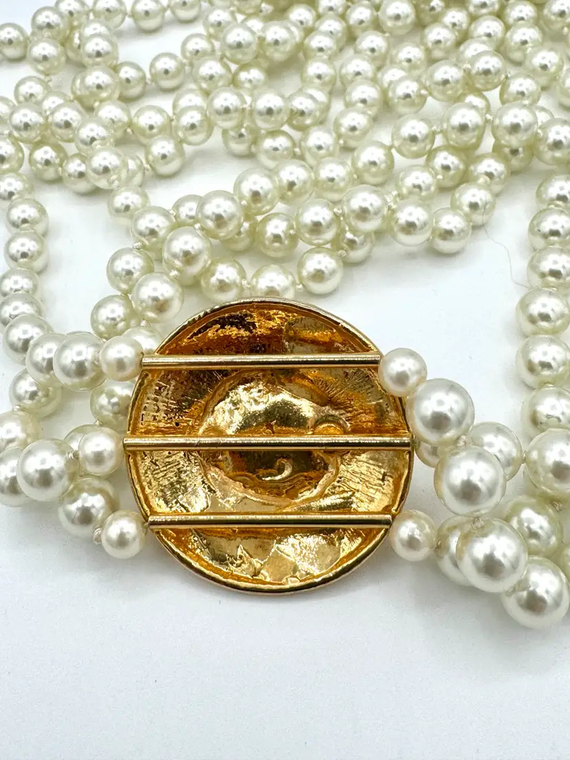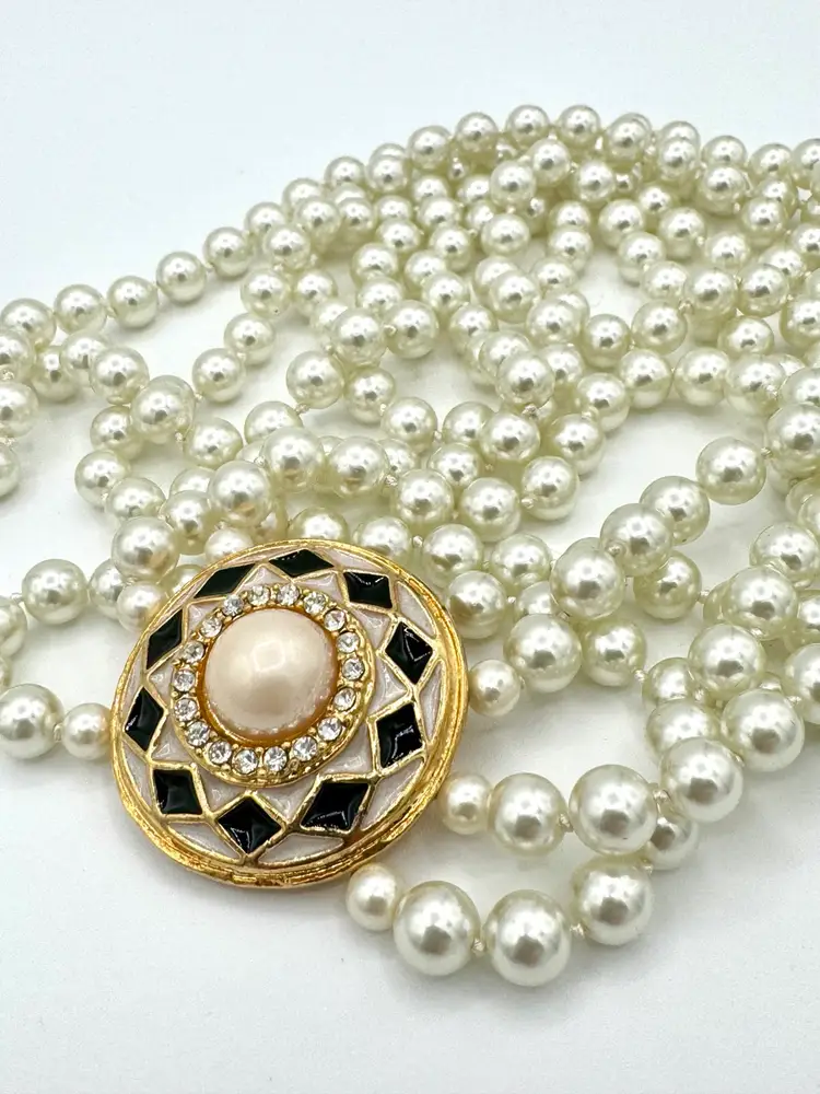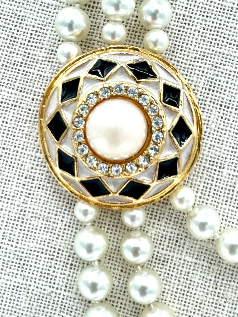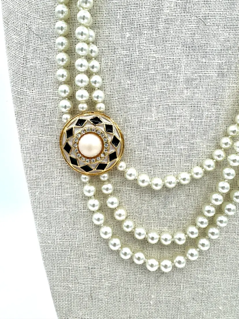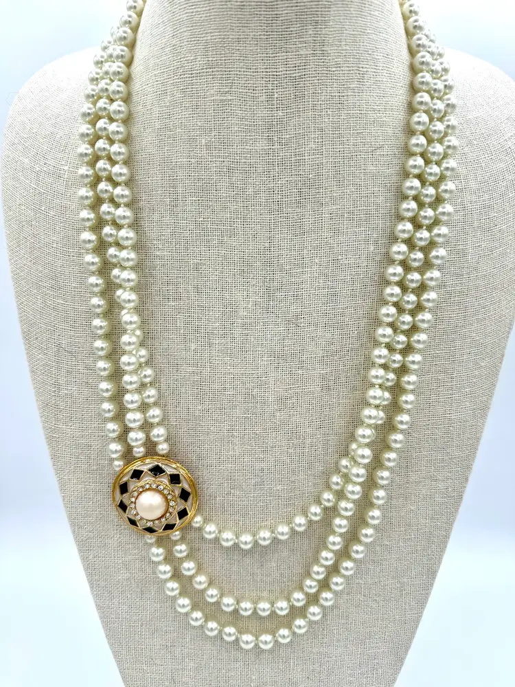 This vintage triple strand necklace boasts a stunning off-center focal bead, surrounded by a cluster of multi-tone gold plated metal and white glass pearls. Its 30 inch length makes it the perfect statement piece for any occasion. The white color of the pearls and imitation pearl main stone complement each other perfectly, adding a touch of elegance to any outfit.