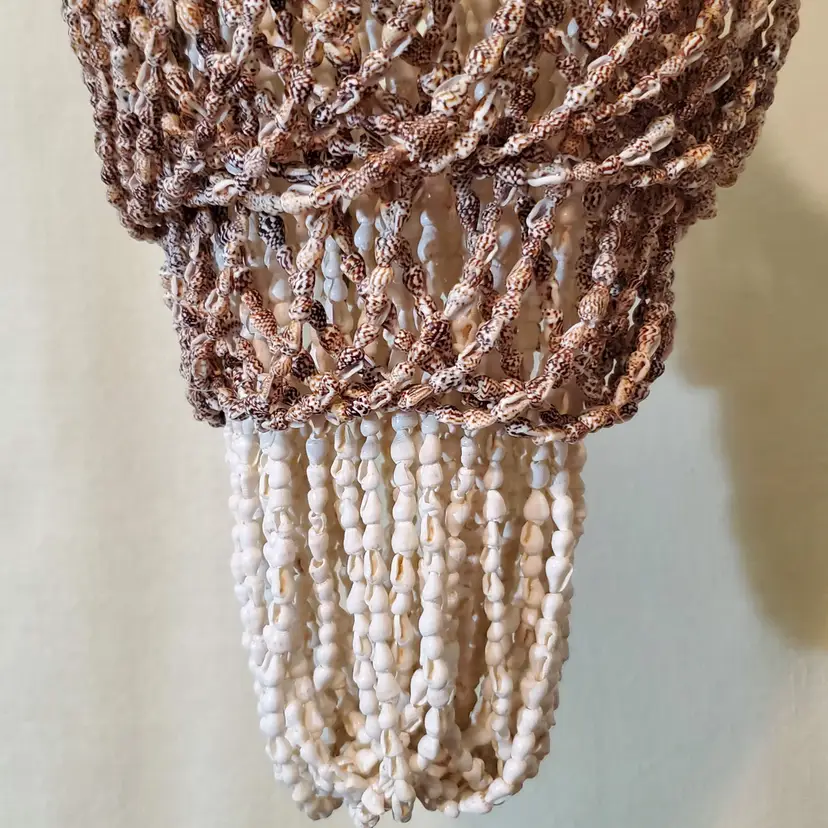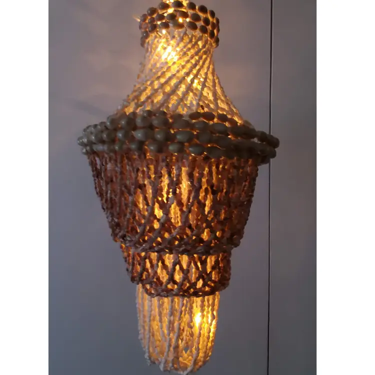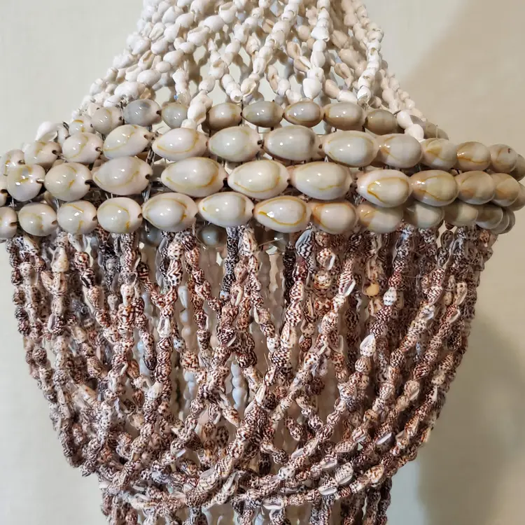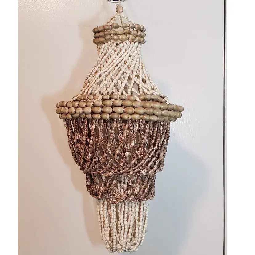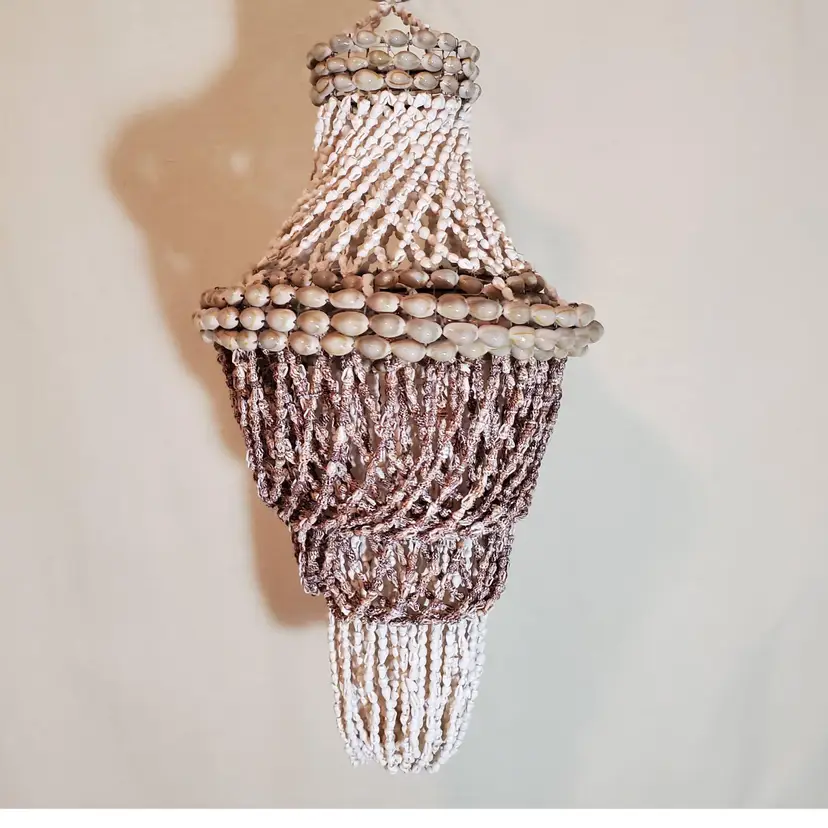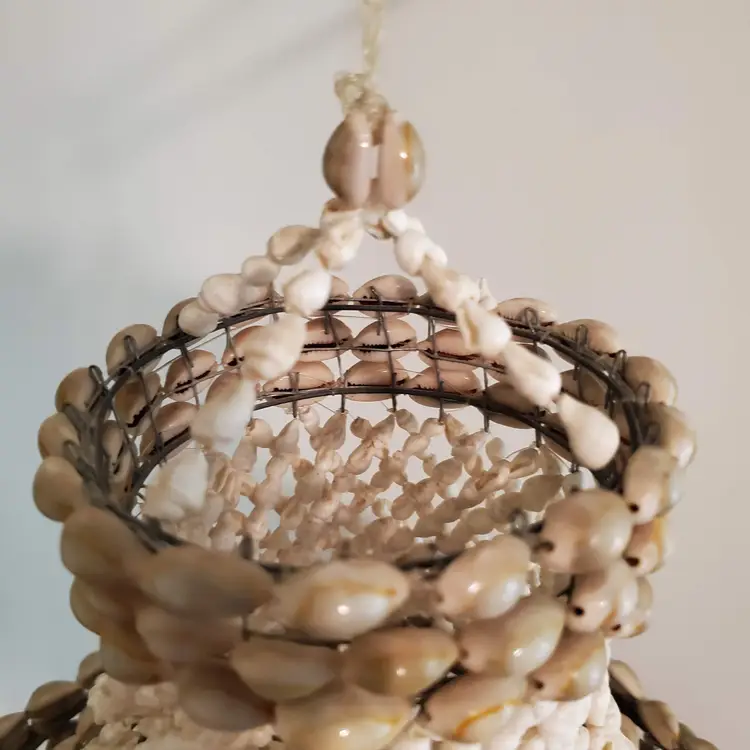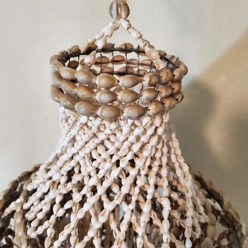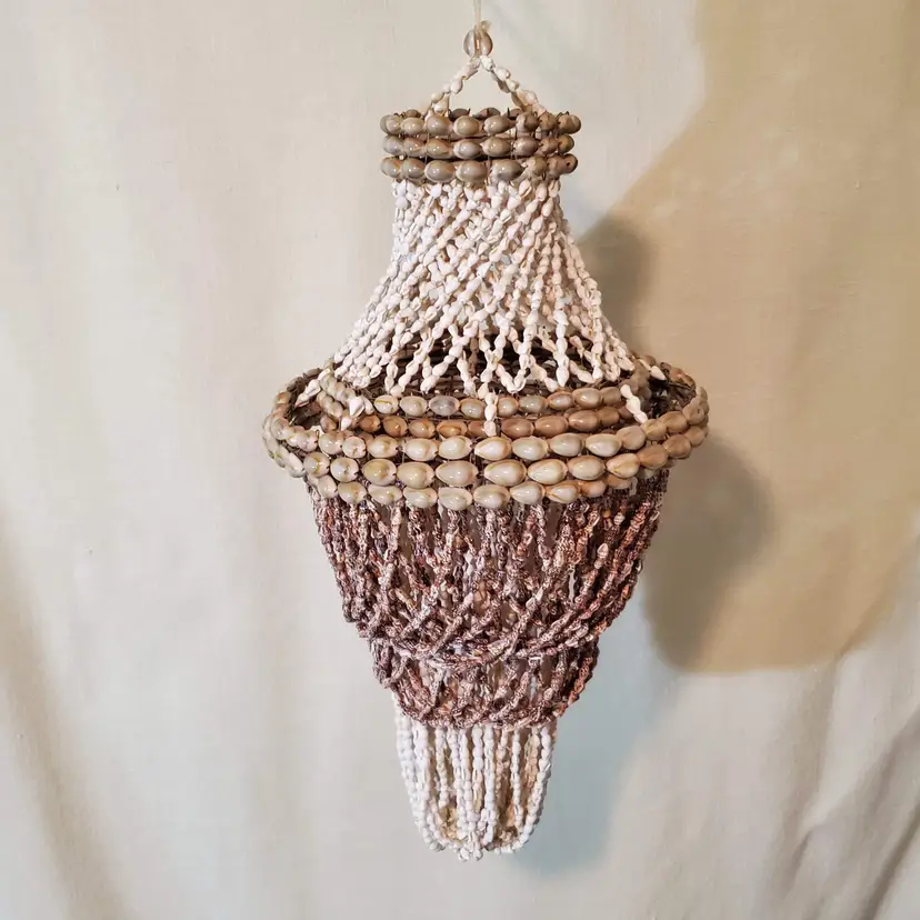 Very cool vintage Boho Retro Coastal Cowrie Shell Chandelier. It features four tiers of shells and measures approximately 21" long and 10" in diameter and is in very good vintage condition. It will not come with lights. It is pictured with a string of fairy lights for a cool effect.
