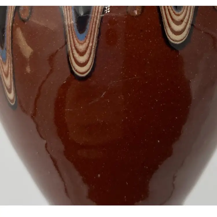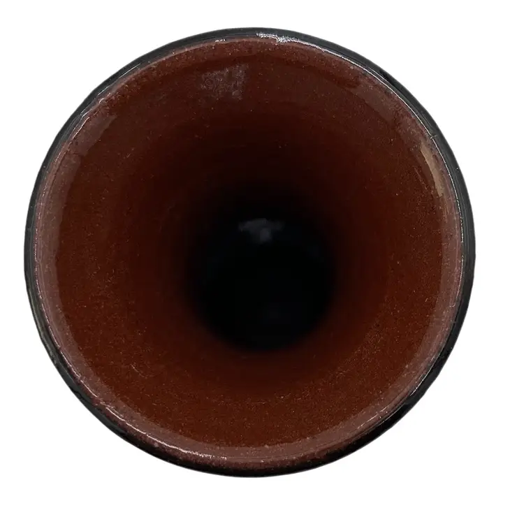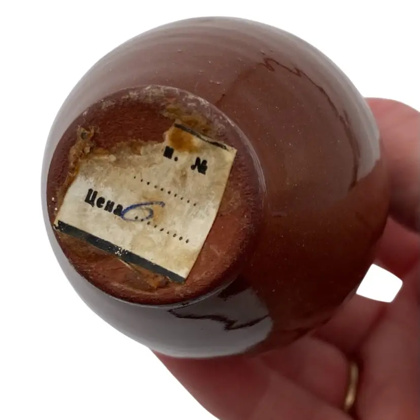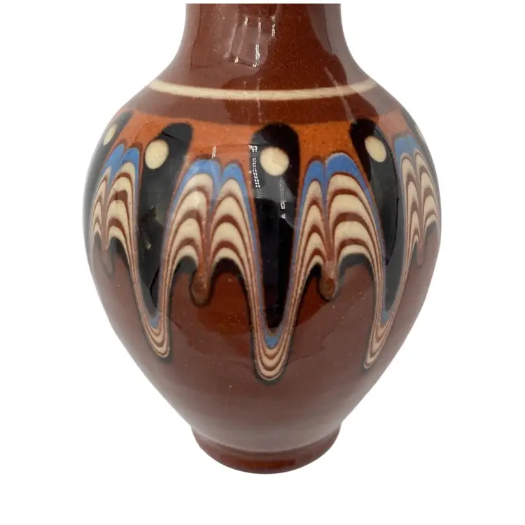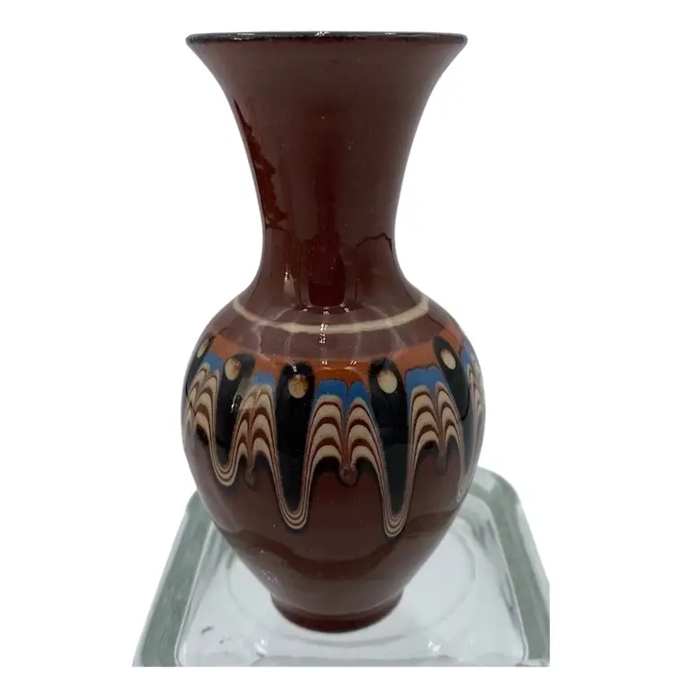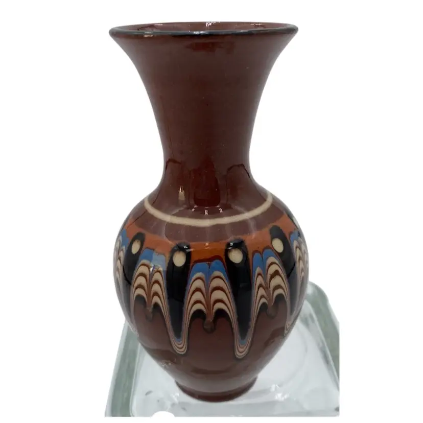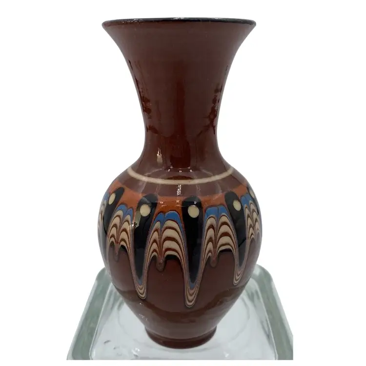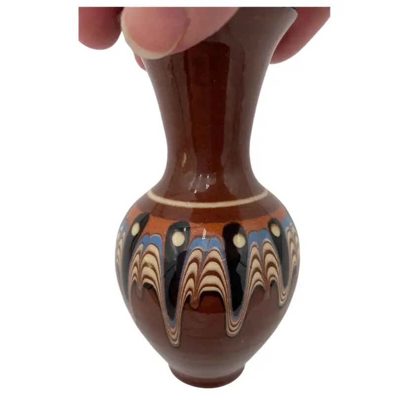 This authentic vintage Troyan drip glaze terra cotta pottery bud vase, originating from the picturesque town of Troyan, Bulgaria, is a true testament to the rich tradition of folk art pottery of that region. With its deep brown base from the local terra cotta clay to the distinctive drip pattern, the vase exudes a quaint charm that is characteristic of the area's pottery. Expertly crafted with a glossy finish, the vase stands at a modest 4.3 inches high and measures 2.2 inches in width, making it a versatile piece for your collection. The hand-painted details include black, blue, rust, and cream colors. The printed sticker attached to the bottom are in Bulgarian and indicate its original price. Whether displayed alone or as part of a curated selection of decorative objects, this pottery vase brings a touch of vintage elegance to any space.