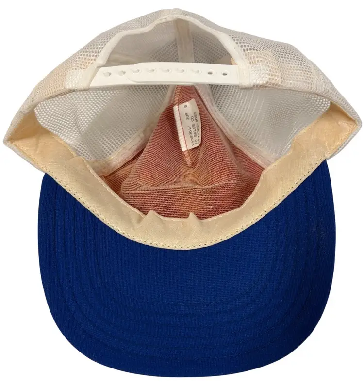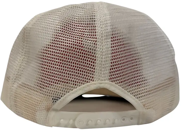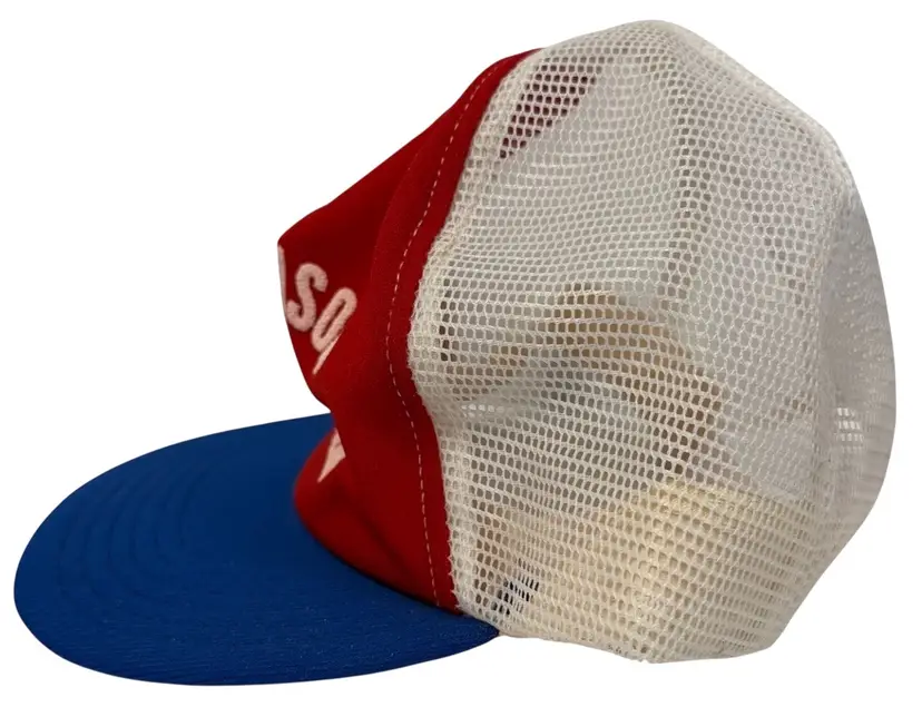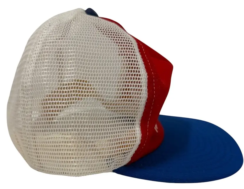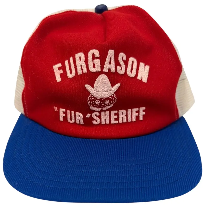 The Vintage Trucker Hat from the 1980s features a retro design with the Furgason "Fur" Sheriff theme, paying homage to the 80s and 90s era. This adjustable snapback hat in red, white, and blue is made of a blend of polyester and acrylic, with a solid color pattern and a canvas fabric type. Perfect for both men and women, this unisex hat in one size fits all (OS) showcases a classic trucker hat style with a flat brim, making it a stylish and nostalgic accessory for any outfit.