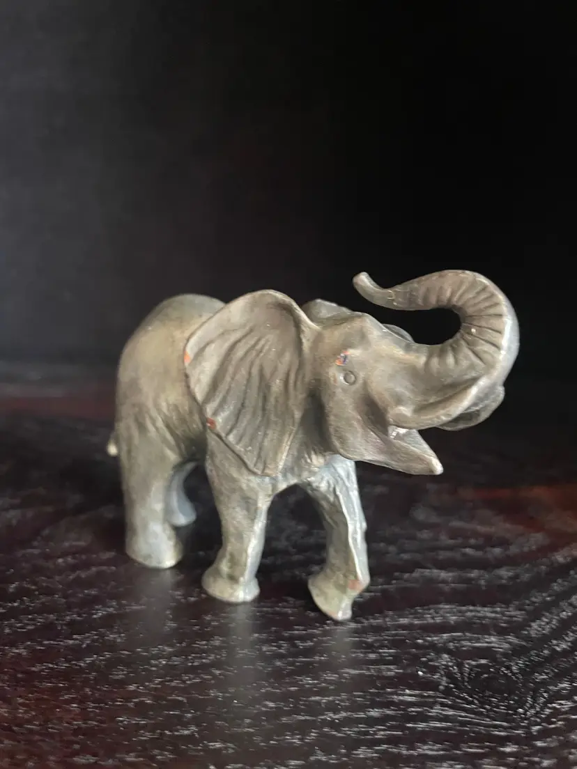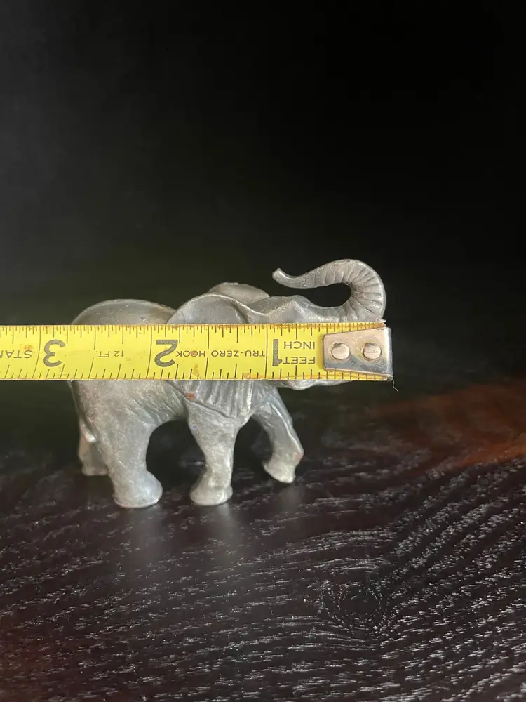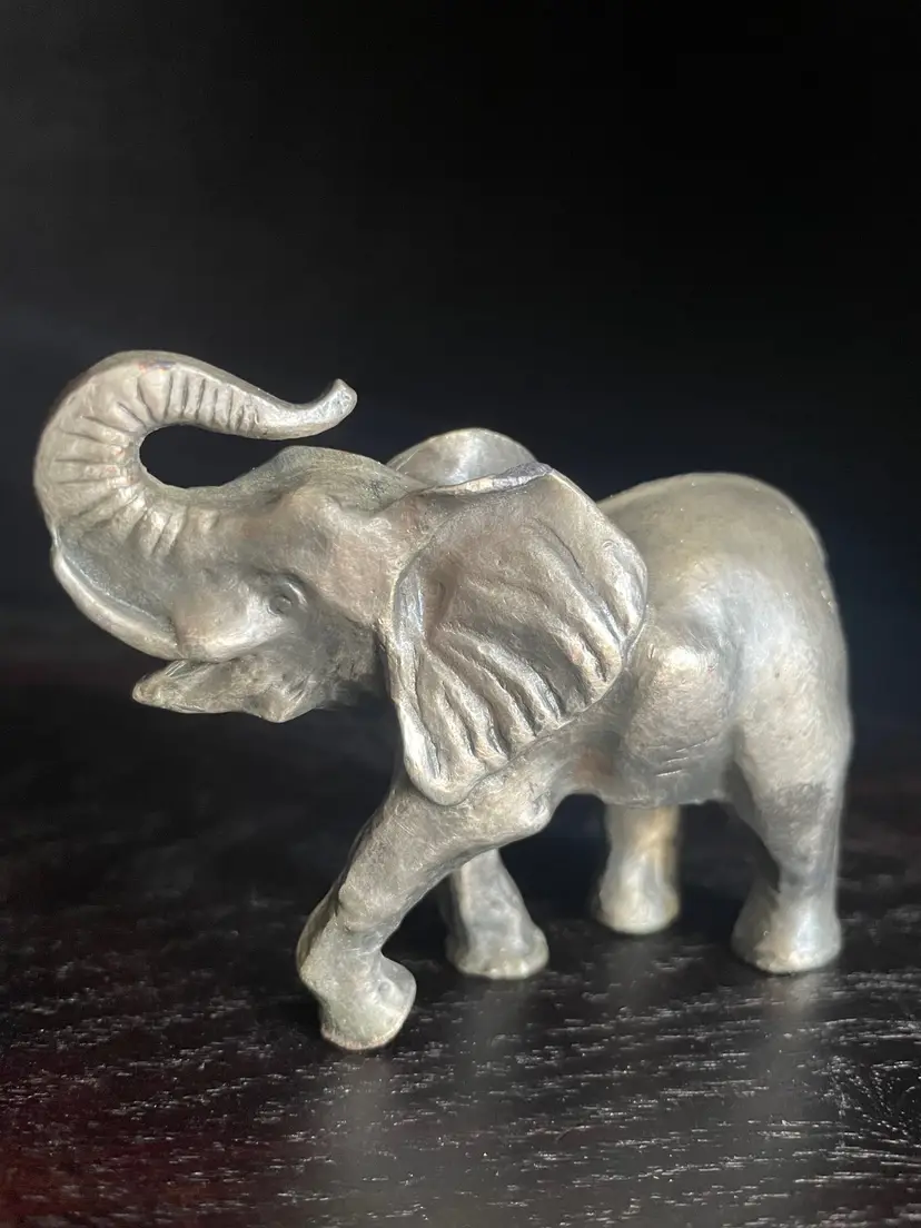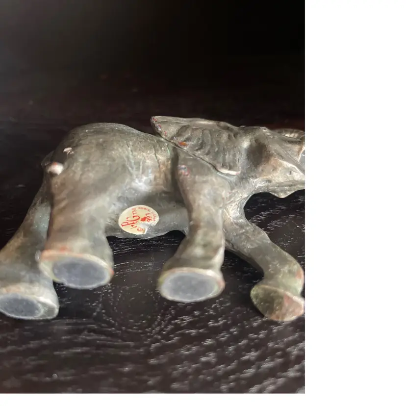 This little guy in over a pound in weight. I thought he was pewter, but there is a copper or brass gold/orange color showing where the silver color wore off in a few tiny spots so I’m not sure what the metal underneath is (but it is heavy). Would make a great paper weight! He is handcrafted. Not signed but there is a sticker partially intact and I looked it up. Company is PG and he is from 1993.
