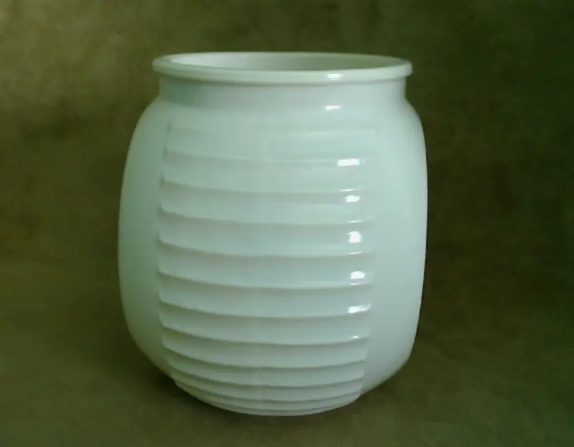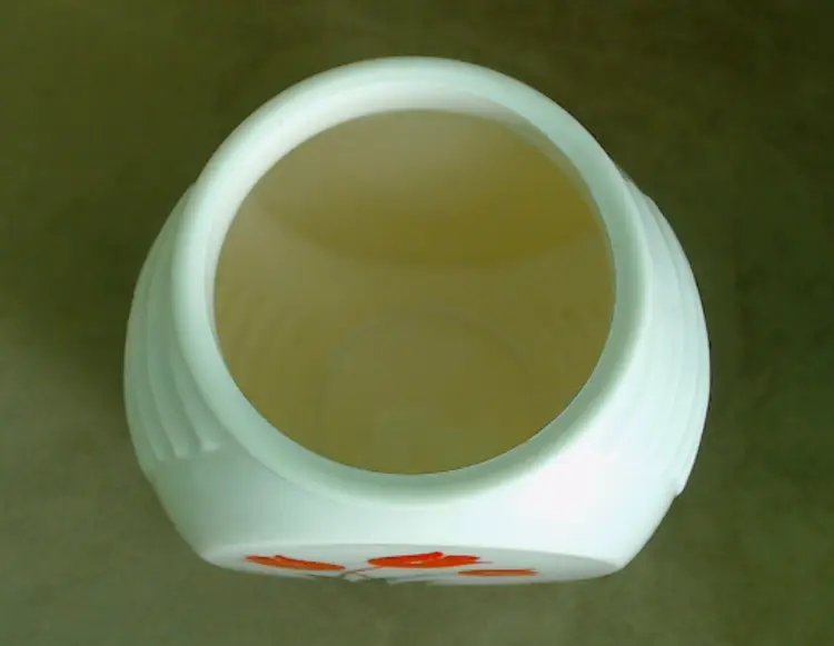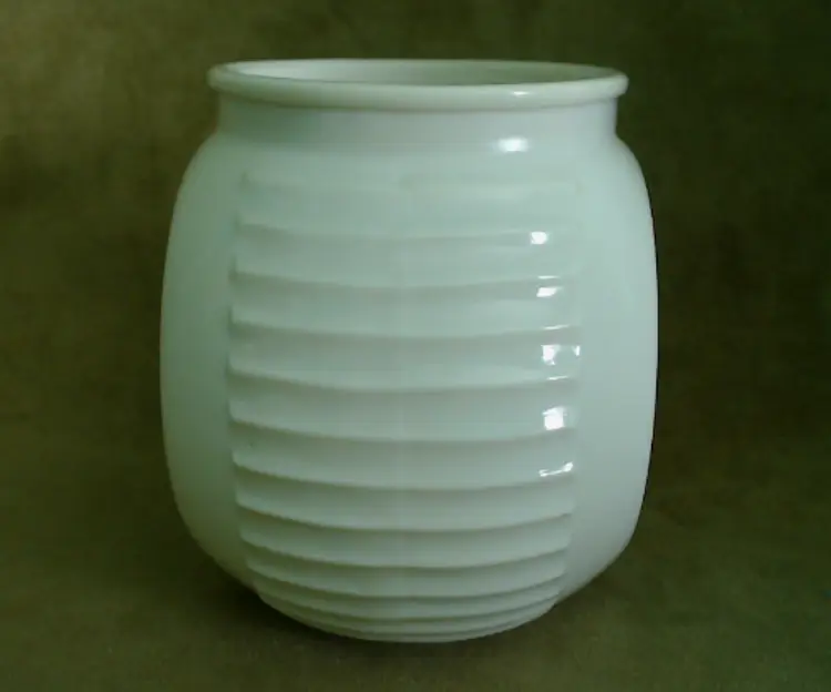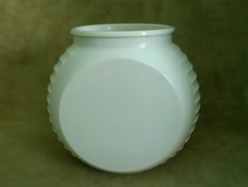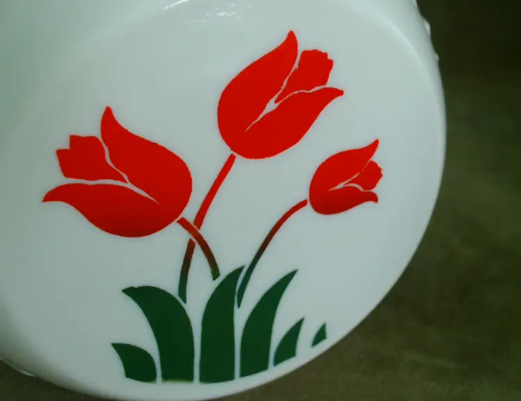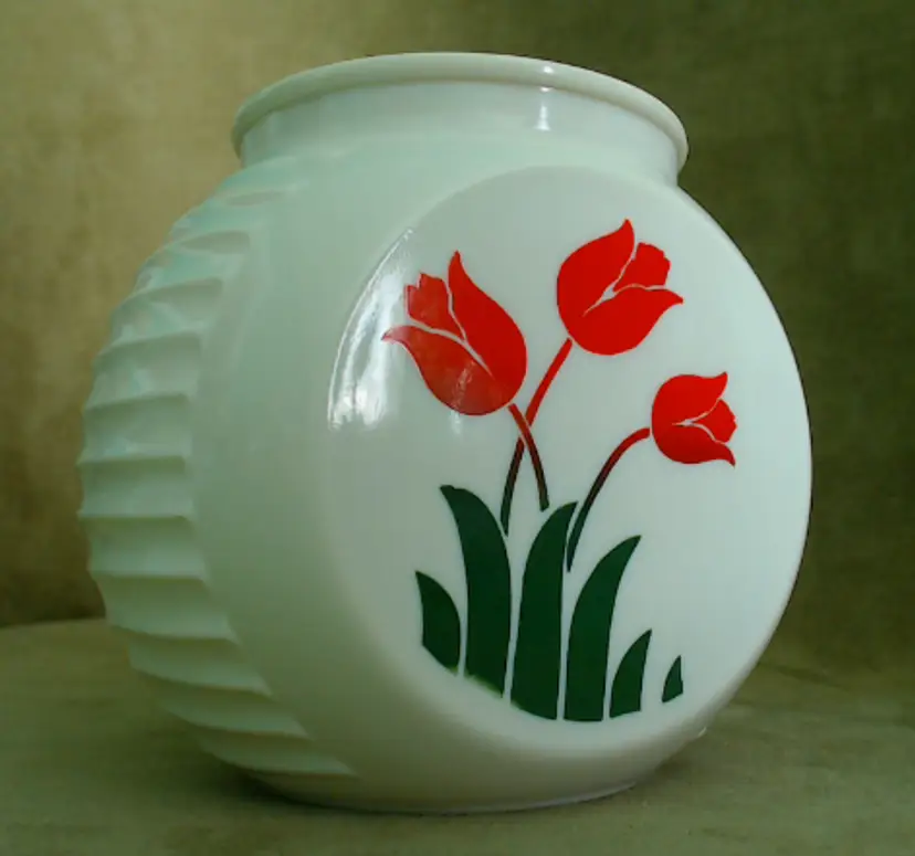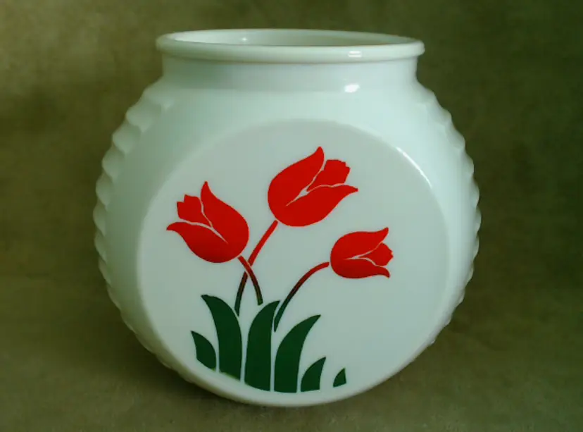 This is a vintage milk glass jar with a pretty tulip pattern! Made in the USA during the mid 1930s, by the Hocking Glass Company (which soon became Anchor Hocking), this jar was part of their "Vitrock" line of milk glass wares. The creamy white glass holds a little surprise - it glows a little under black light! This jar is a smaller canister, originally meant to hold drippings, but of course you can fill it with anything of an appropriate size that your heart desires! Condition: This jar is in Excellent shape! There are no chips, cracks, or any other damage that I could find. The tulip graphic is still very vibrant, without any serious scratching or wear. Really the only issue is that it arrived in my care lidless. It'd be a lovely as a vase or as an open kitchen storage for packaged goodies, but I do think you'd be able to find a modern lid replacement without too much hassle. Size: The jar is about 5½" across the widest point, is 4" front to back, and sits 4¾" tall.